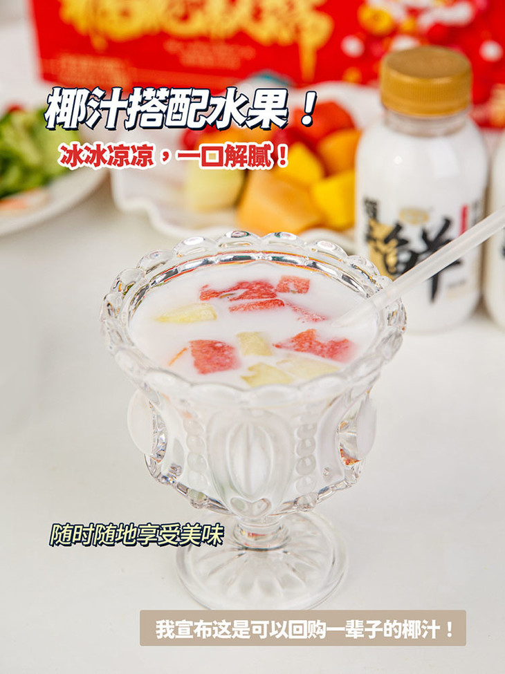 椰汁加点西瓜、芒果、哈密瓜 就是外面卖二三十一份的椰汁汤水了~ 好喝又健康,性价比高高的!!!
