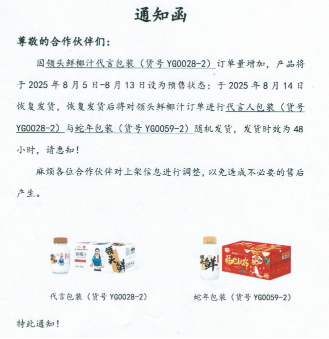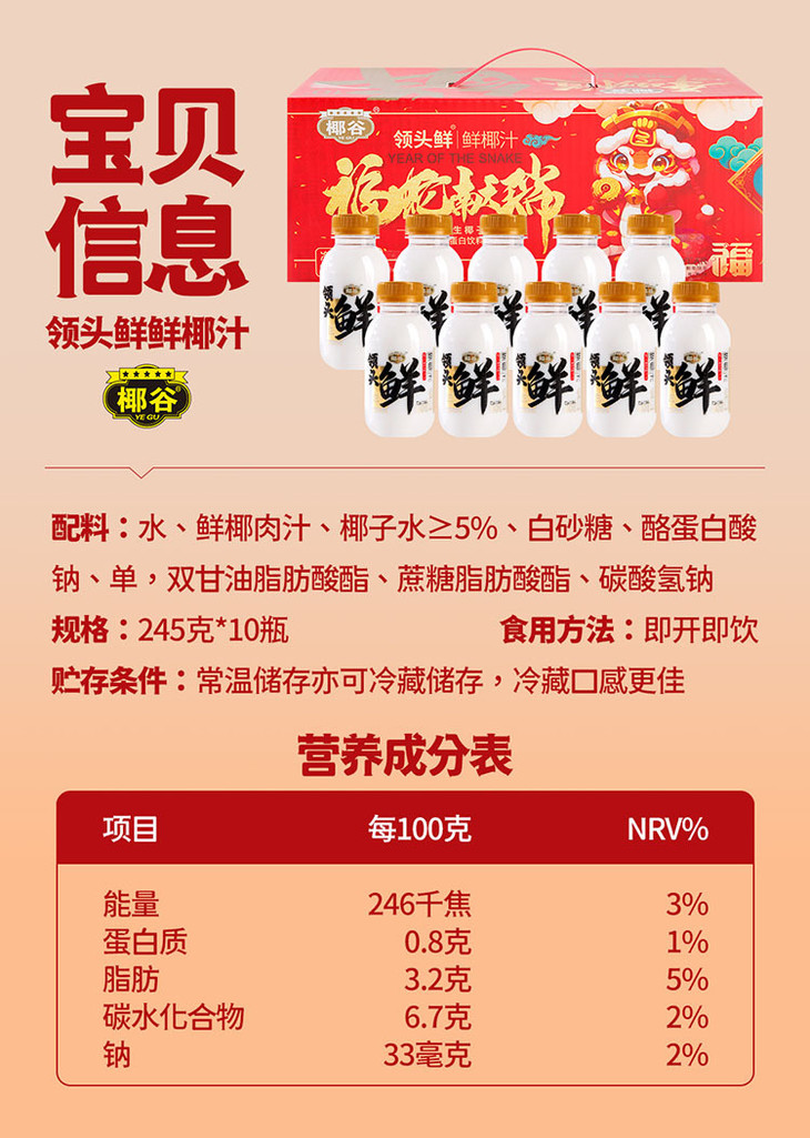 【产品名称】椰谷·领头鲜鲜椰汁(加入原生椰子水)蛇年包装