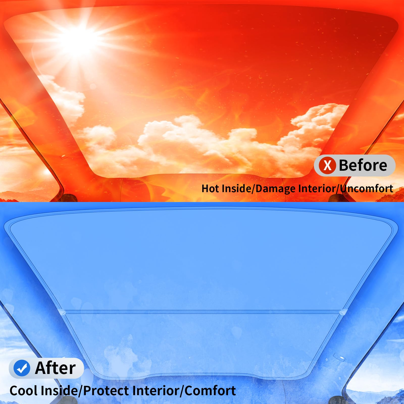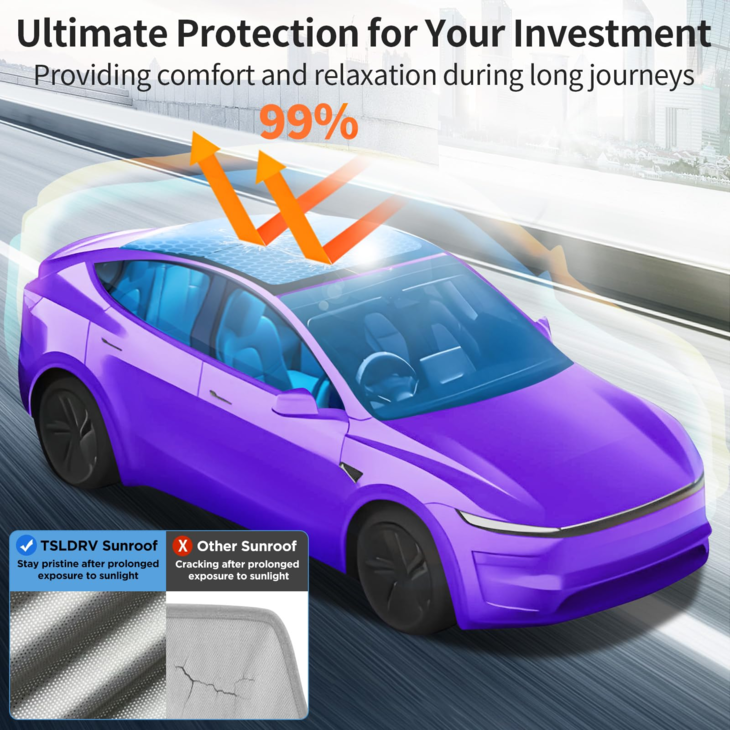 采用多层结构和高密度冰感面料,具有冰晶纳米反射功能。能有效降低车内温度,时刻保持凉爽。即使在炎热的夏天,有了这款 Model Y 车顶遮阳帘,也能享受出行的乐趣。