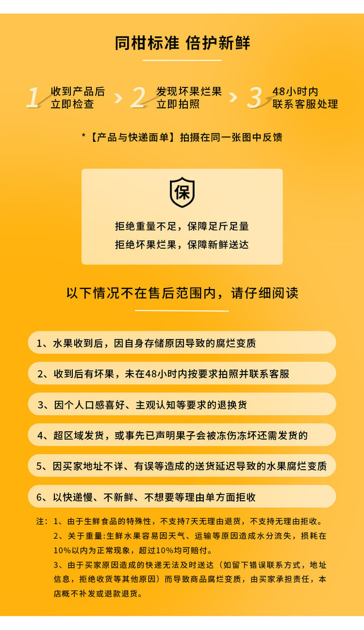 【温馨提示】水果生鲜不接受7天无理由,请在收到后24小时内检查,如有坏果,请将坏果+快递面单放一起拍照找客服哟~