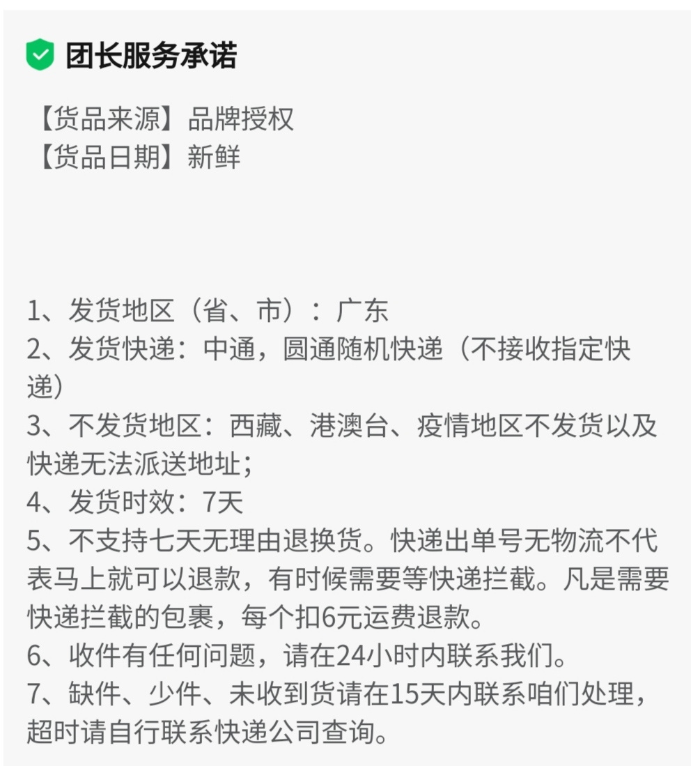 ①非产品质量问题 不支持七天无理由退货 ②无理由拒签或拦截快递需扣除相关费用5元;(已产生的寄出运费不退还) ③客户签收地址/电话错误,无法联系上客户等顾客自身原因导致的快递退回,需重新补发或退款的,需扣除相关运费5元。 ★★关于签收售后 ①签收立即验货,有问题立即拍照取证申请售后(请保留内外包装、快递面单及实物,等待我们核实情况)。 ②如签收超售后的、无法提供照片等证据的,一律不处理理赔。 ③商品本身无质量问题的情况下,不支持无理由售后。 ★以下情况不在售后范围之内 ①无法提供问题商品图片。 ②商品本身无质量问题,因个人口感不喜欢、品相不好、保存不当等个人原因申请退换,不售后。 ③因快递暴力,运输过程中导致快递外箱变形,内物商品未破损,不影响食用,不售后不赔付