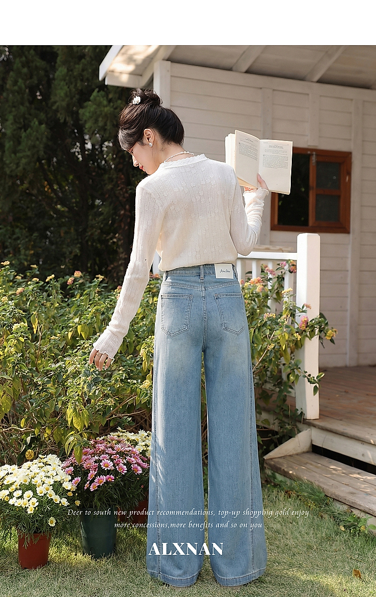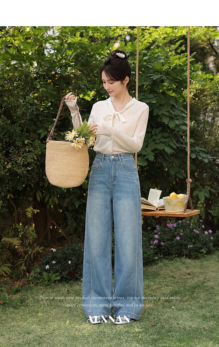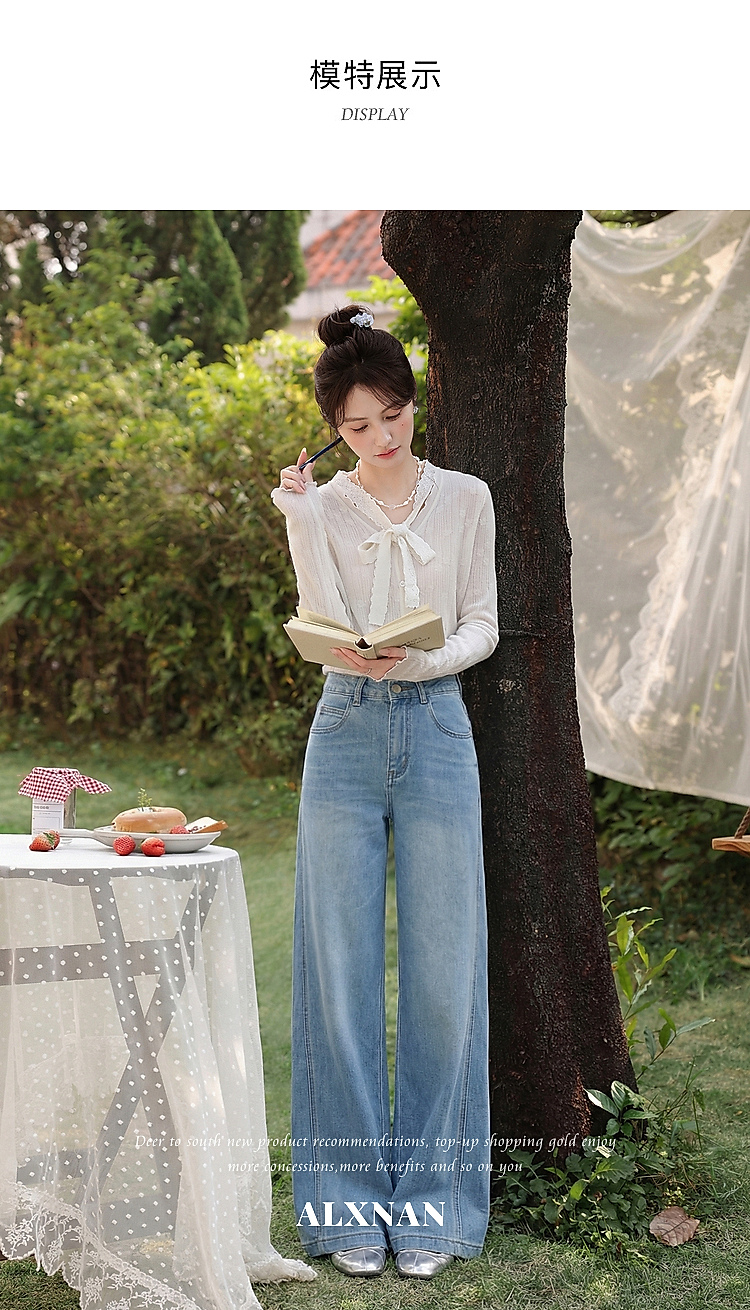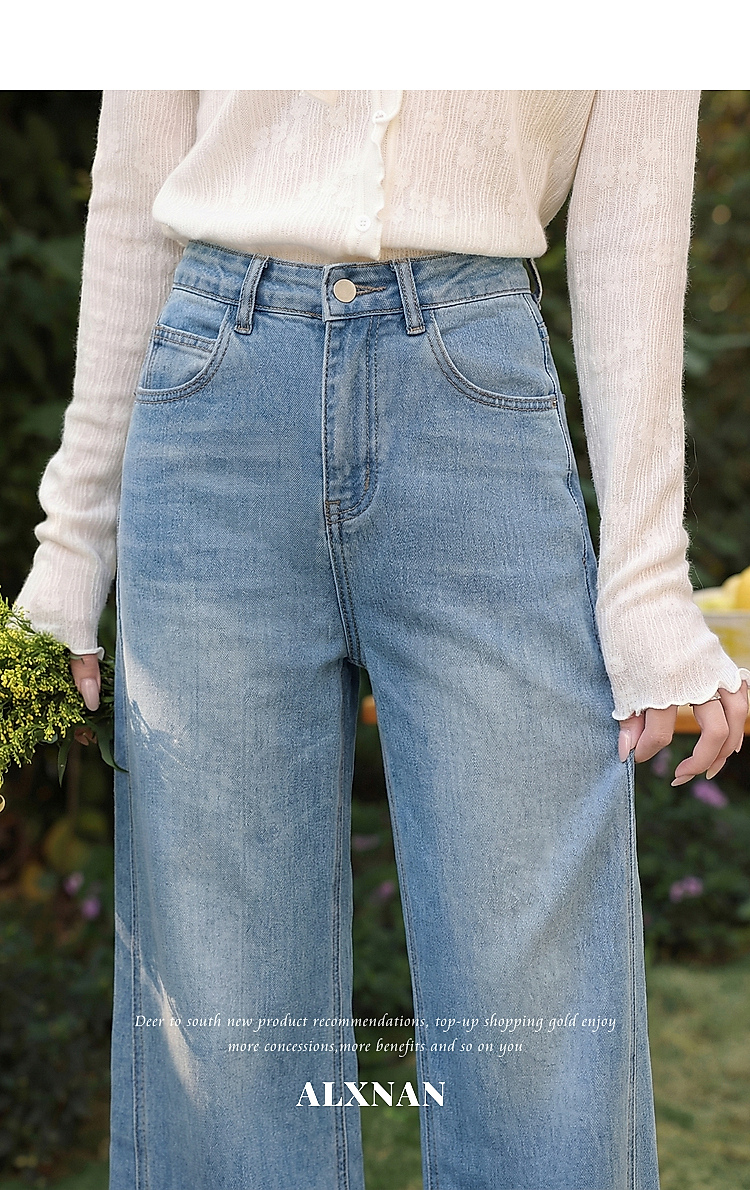 鹿向南「阔步藏海」蓝色直筒牛仔裤女夏新款修身百搭微喇高腰长裤