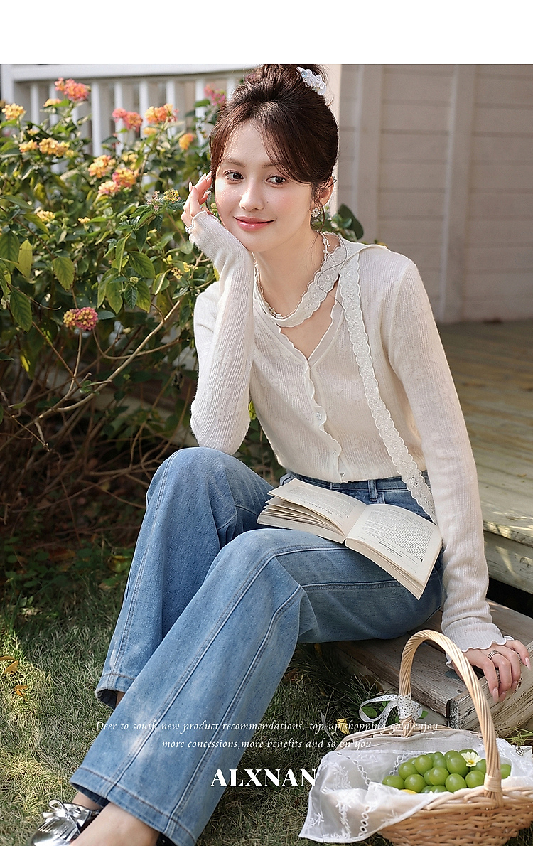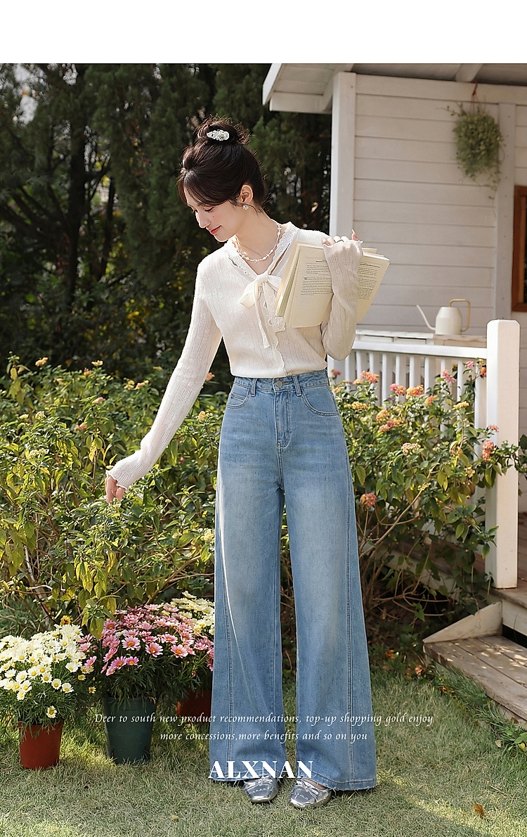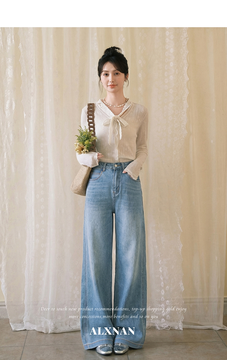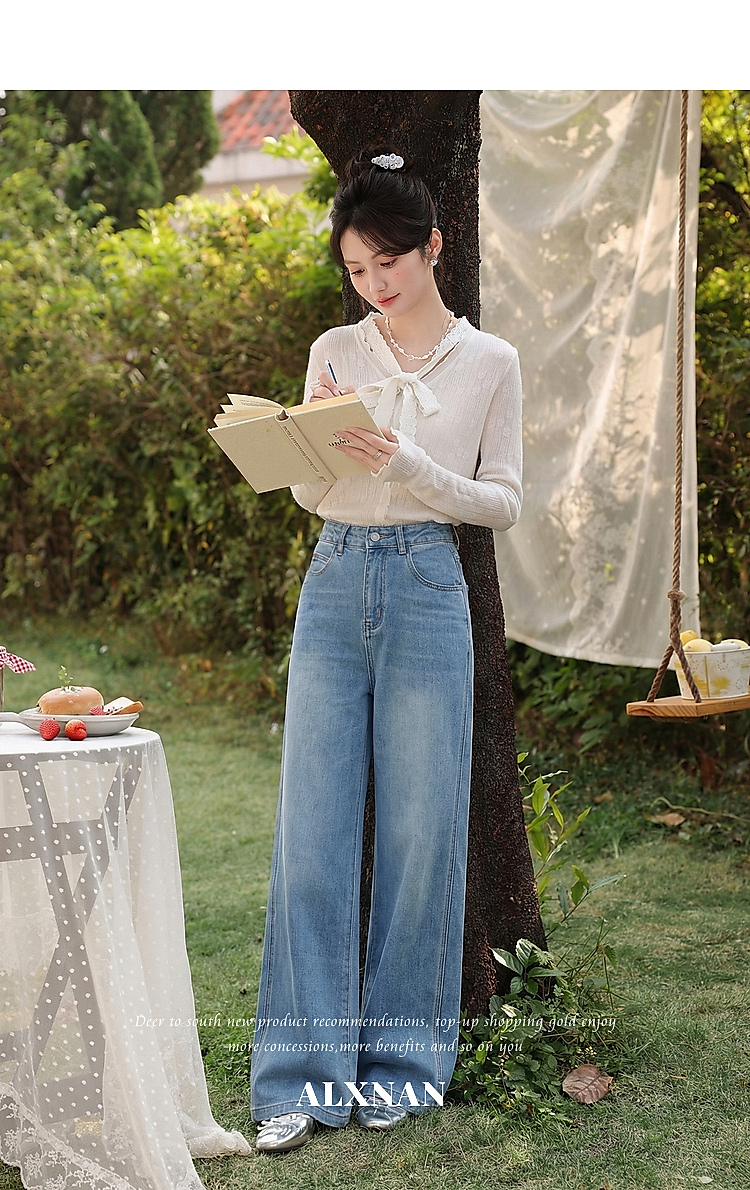 鹿向南「阔步藏海」蓝色直筒牛仔裤女夏新款修身百搭微喇高腰长裤