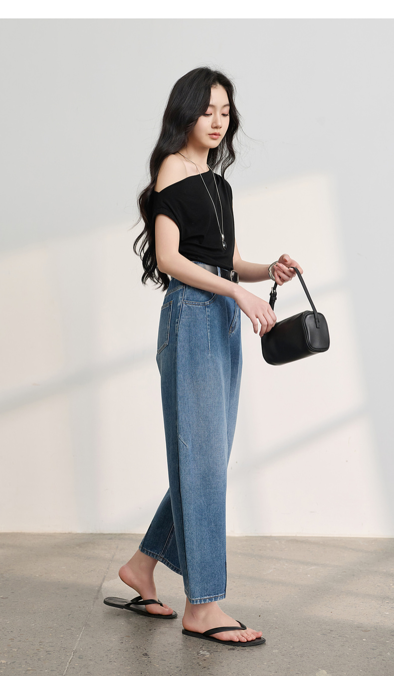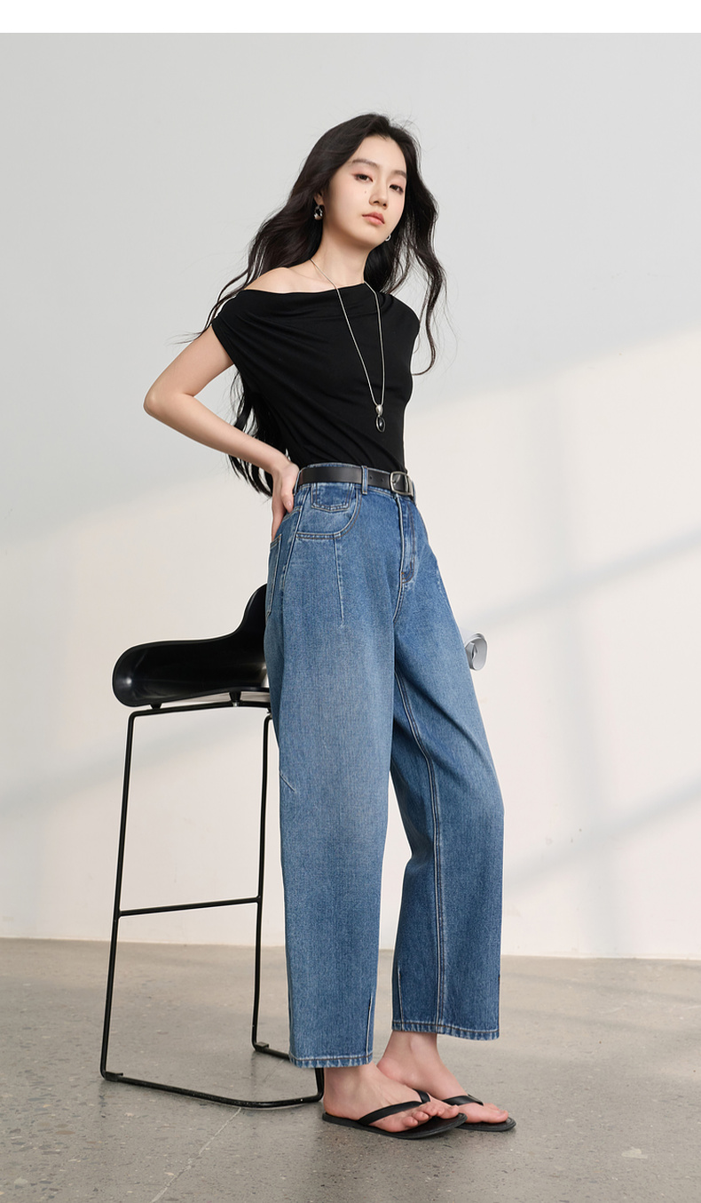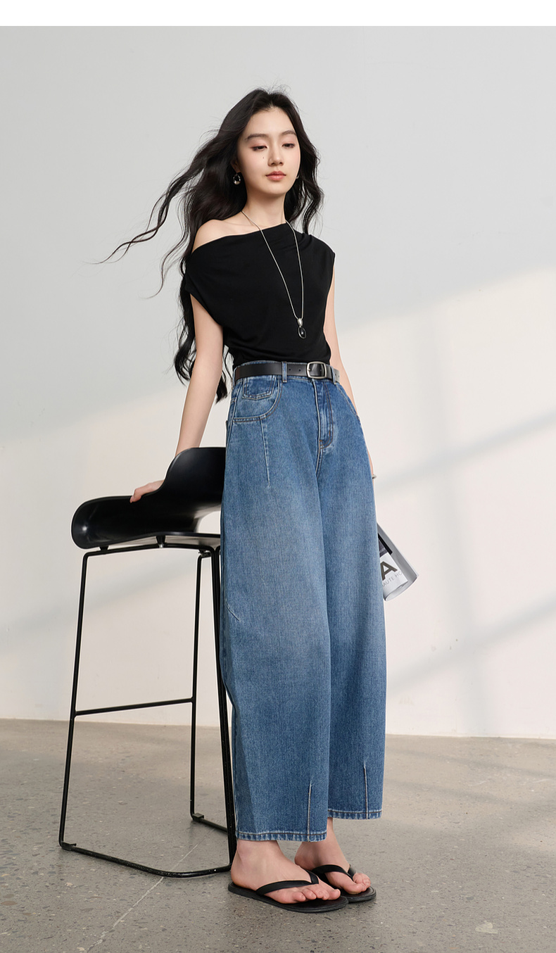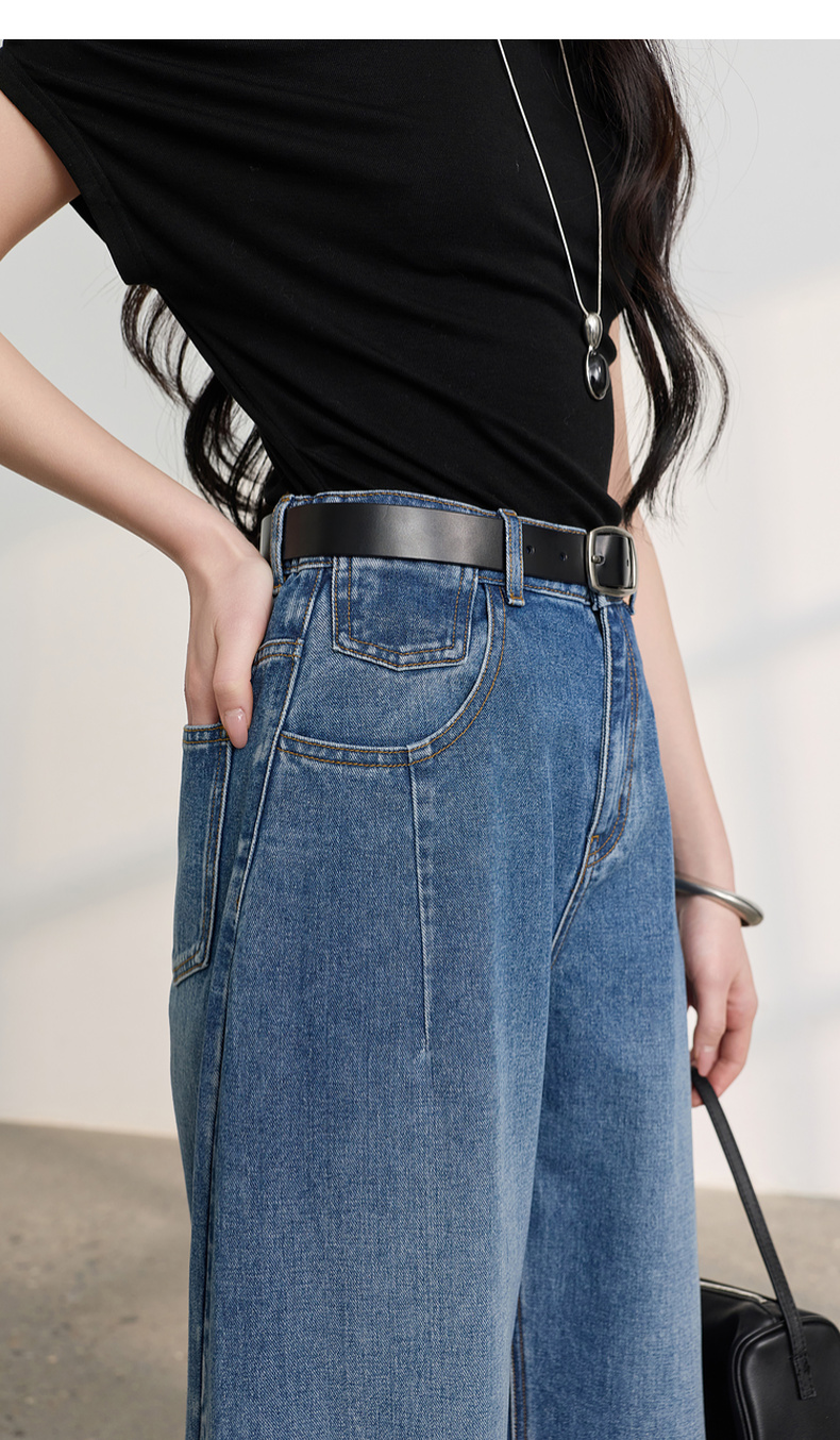 三彩2026春季新款复古休闲裤高腰牛仔裤气球裤九分裤宽松遮肉M