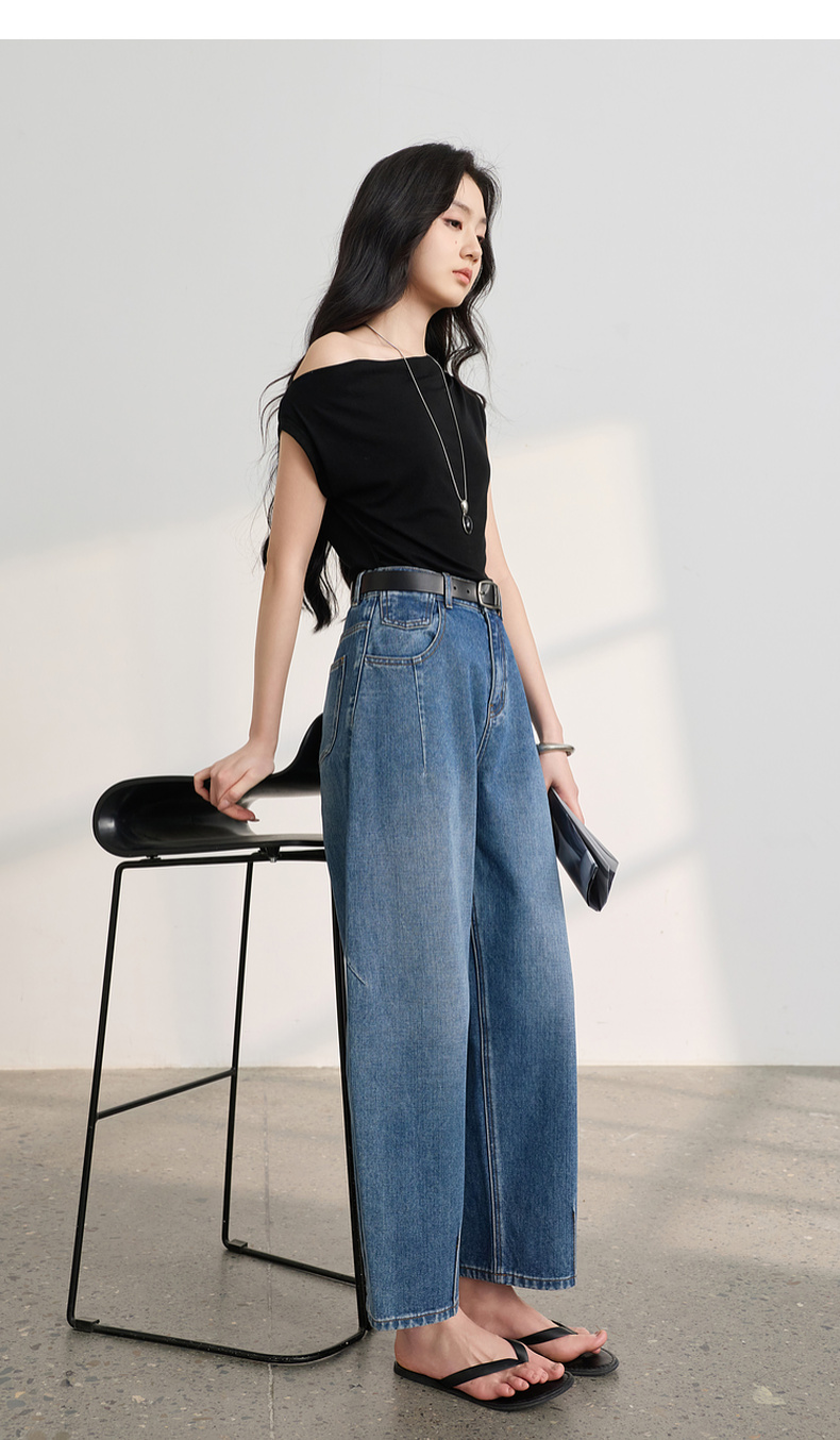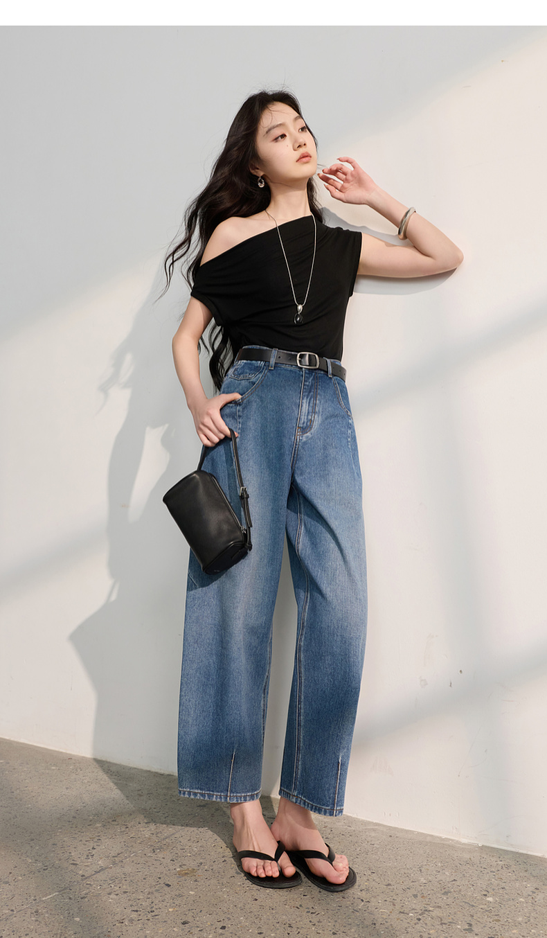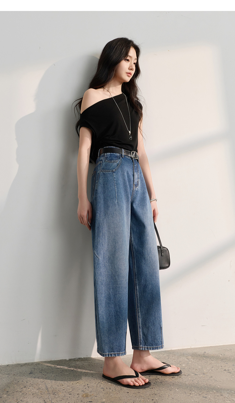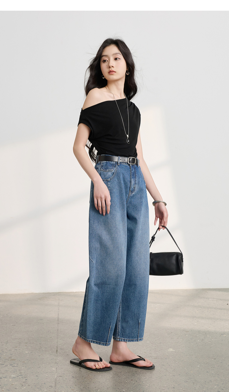 三彩2026春季新款复古休闲裤高腰牛仔裤气球裤九分裤宽松遮肉M