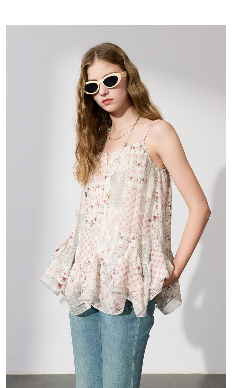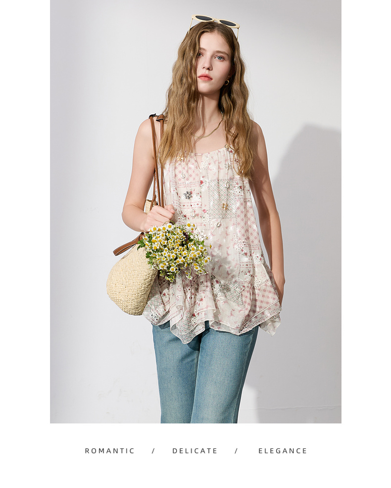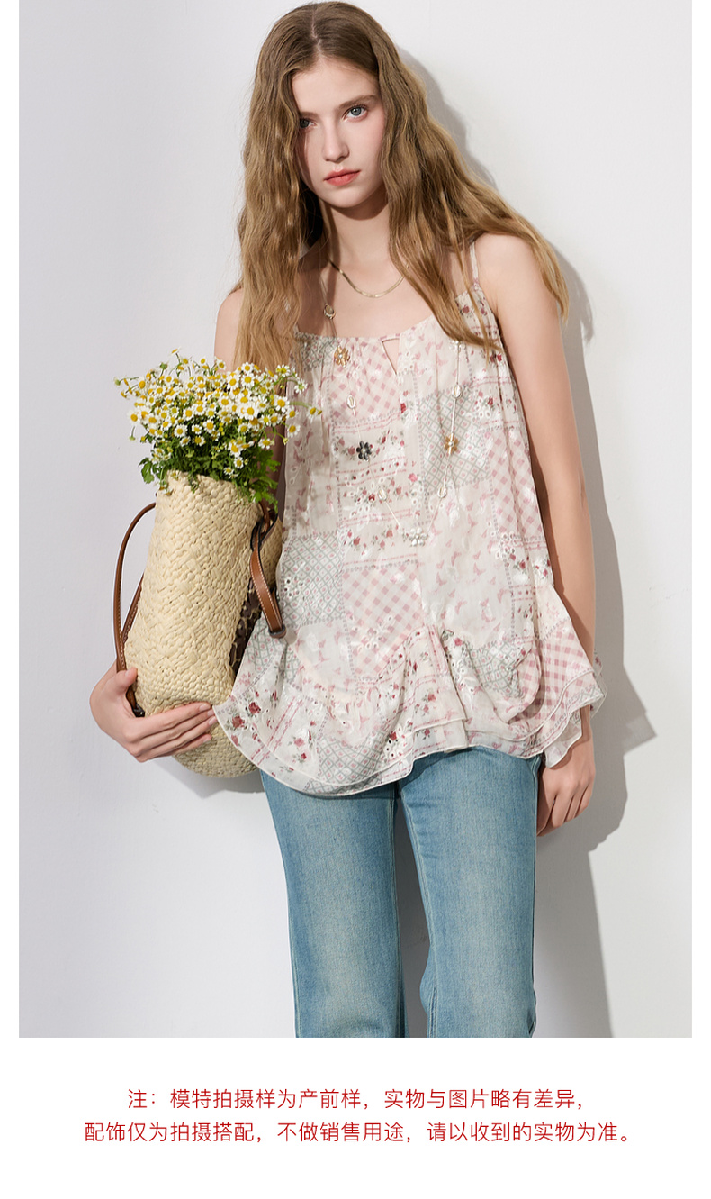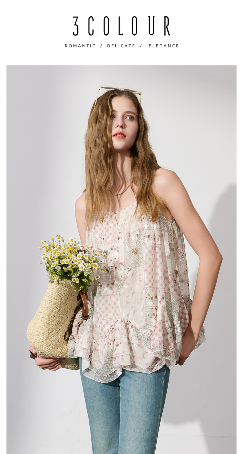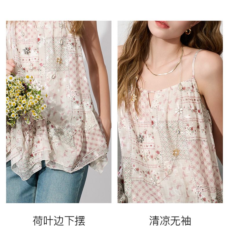 三彩独醒2025夏季新款无袖一字领吊带印花绣花荷叶边上衣小衫F