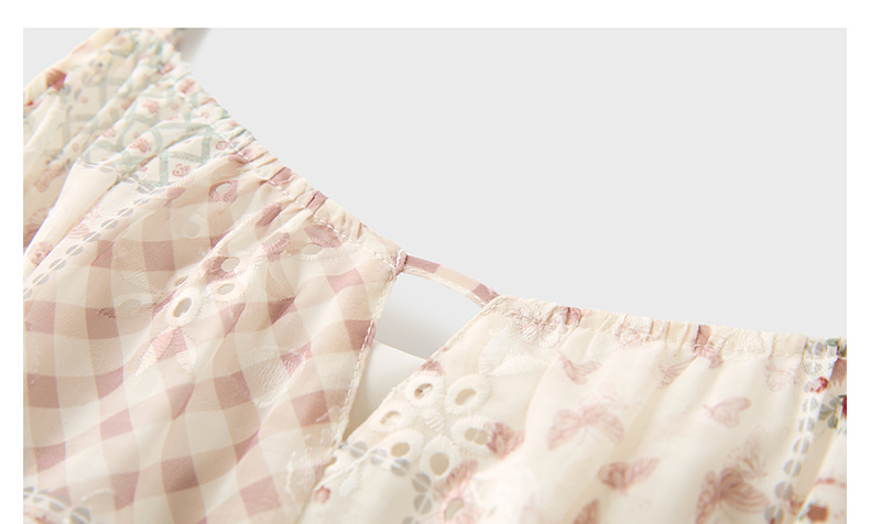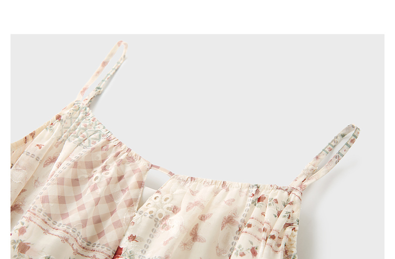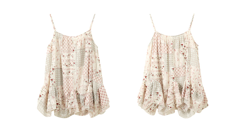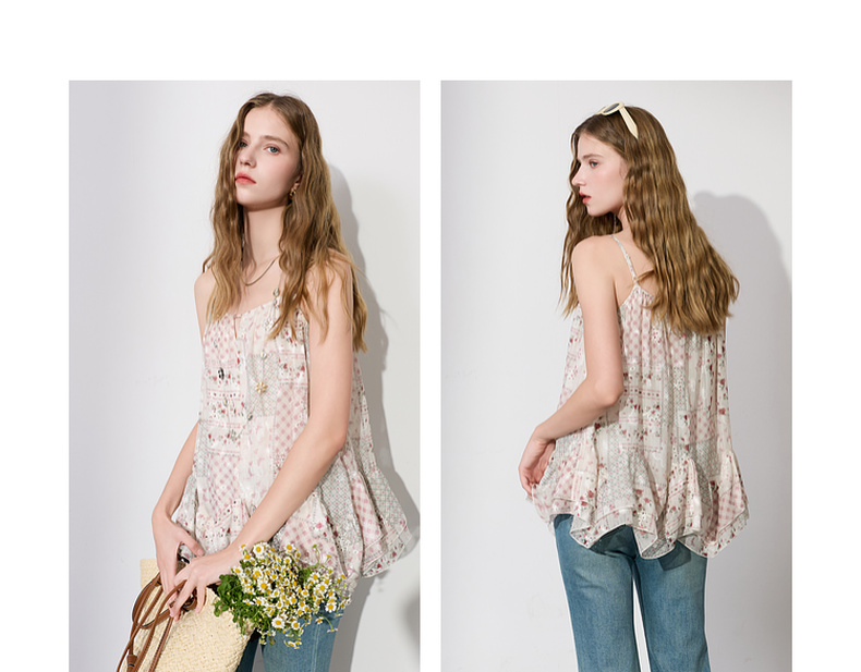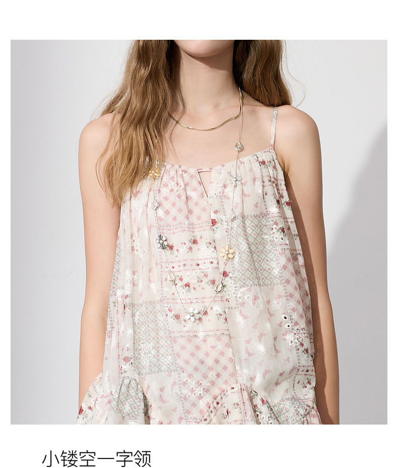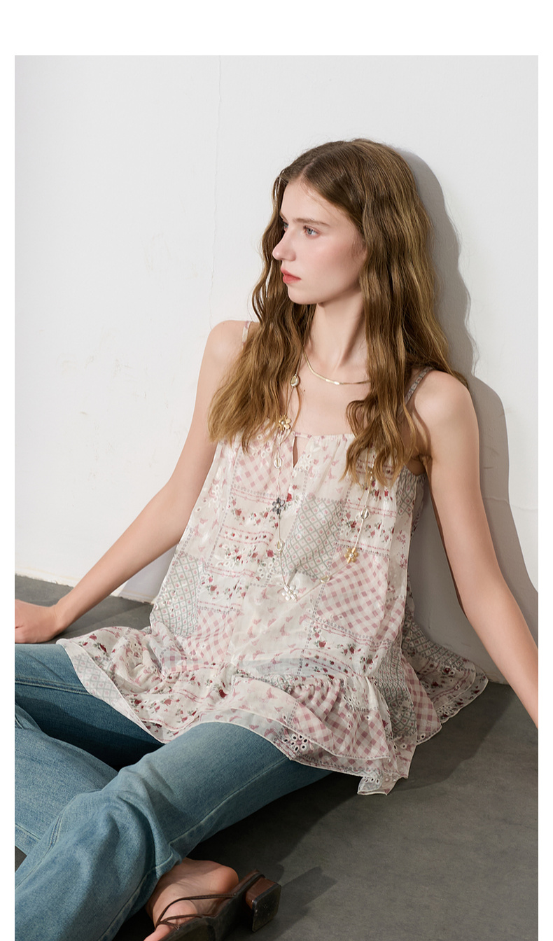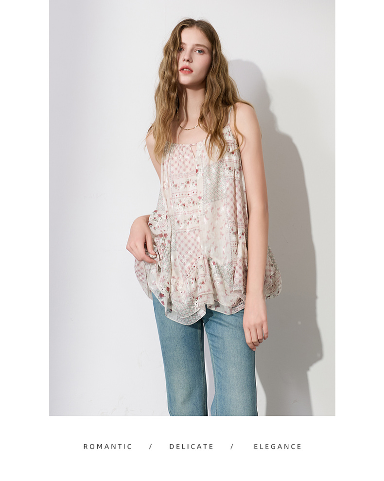 三彩独醒2025夏季新款无袖一字领吊带印花绣花荷叶边上衣小衫F