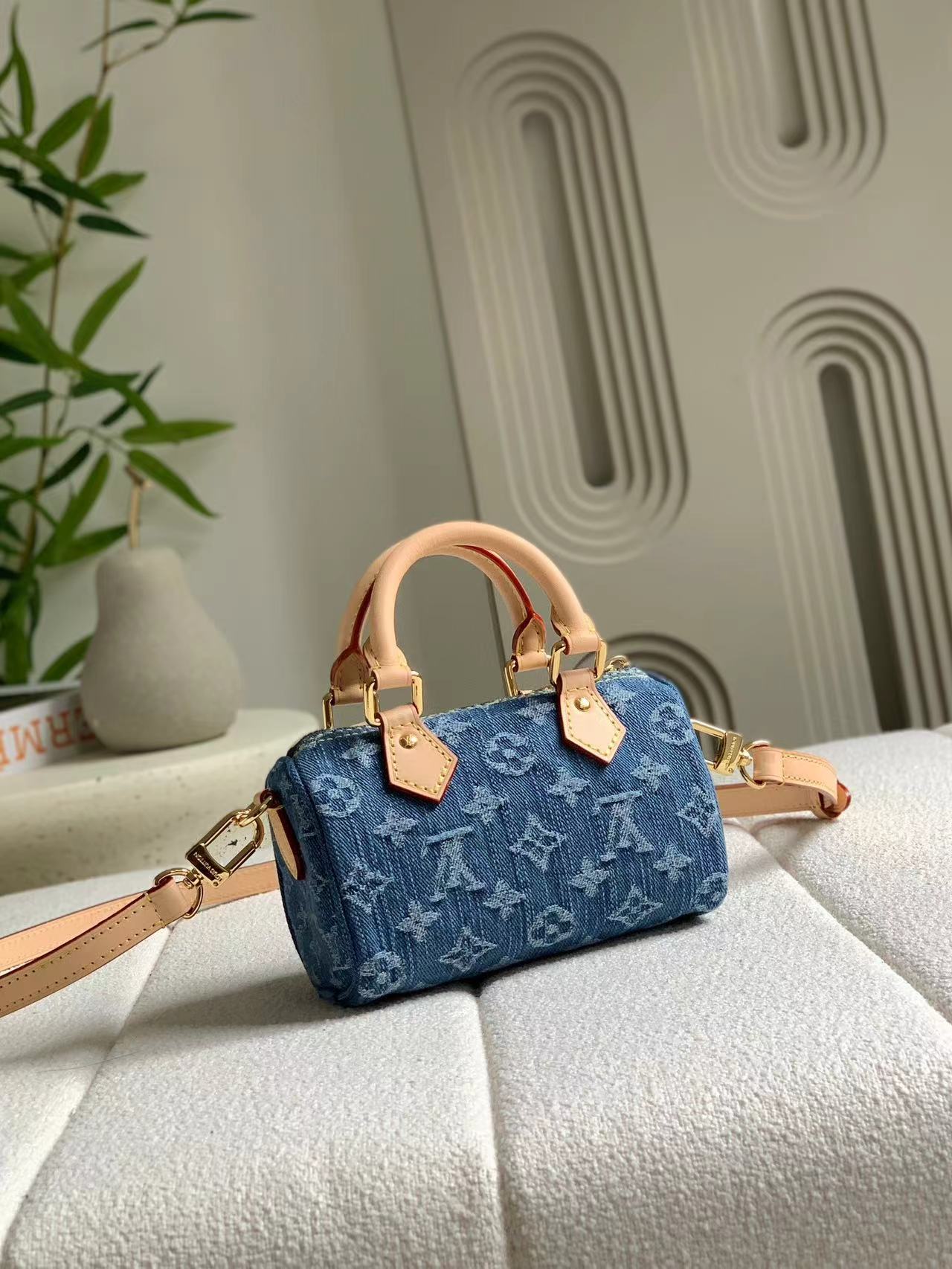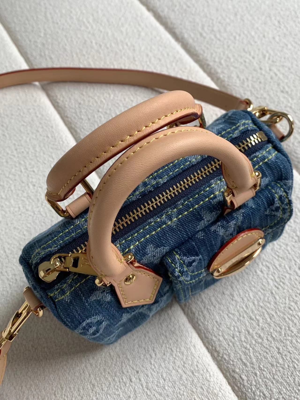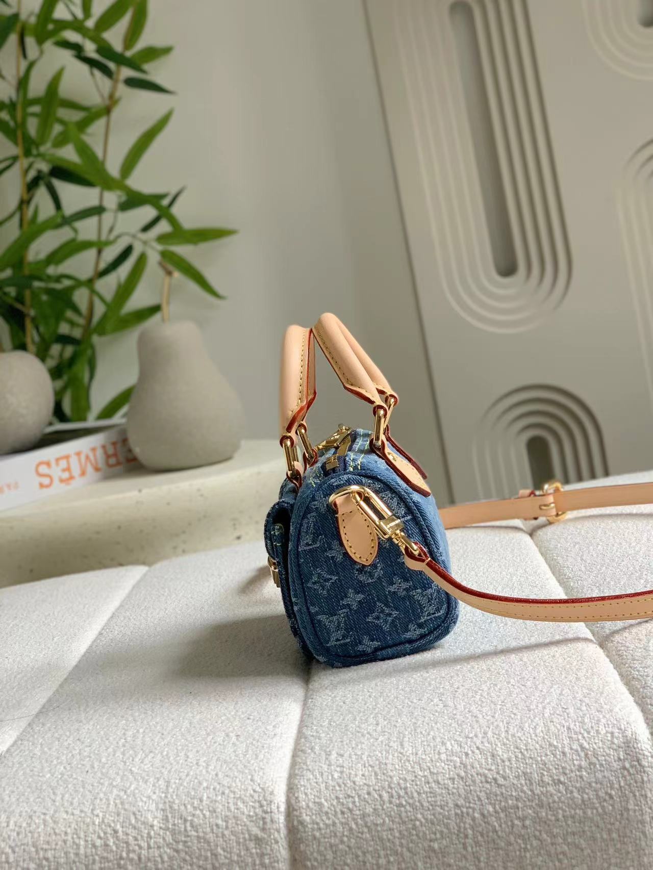 专柜新款M82950 本款 Nano Speedy手袋选用由认证棉织就的 Monogram Denim 砂洗帆布,搭配皮革手柄和可拆卸肩带。尺寸:16*10*7.5