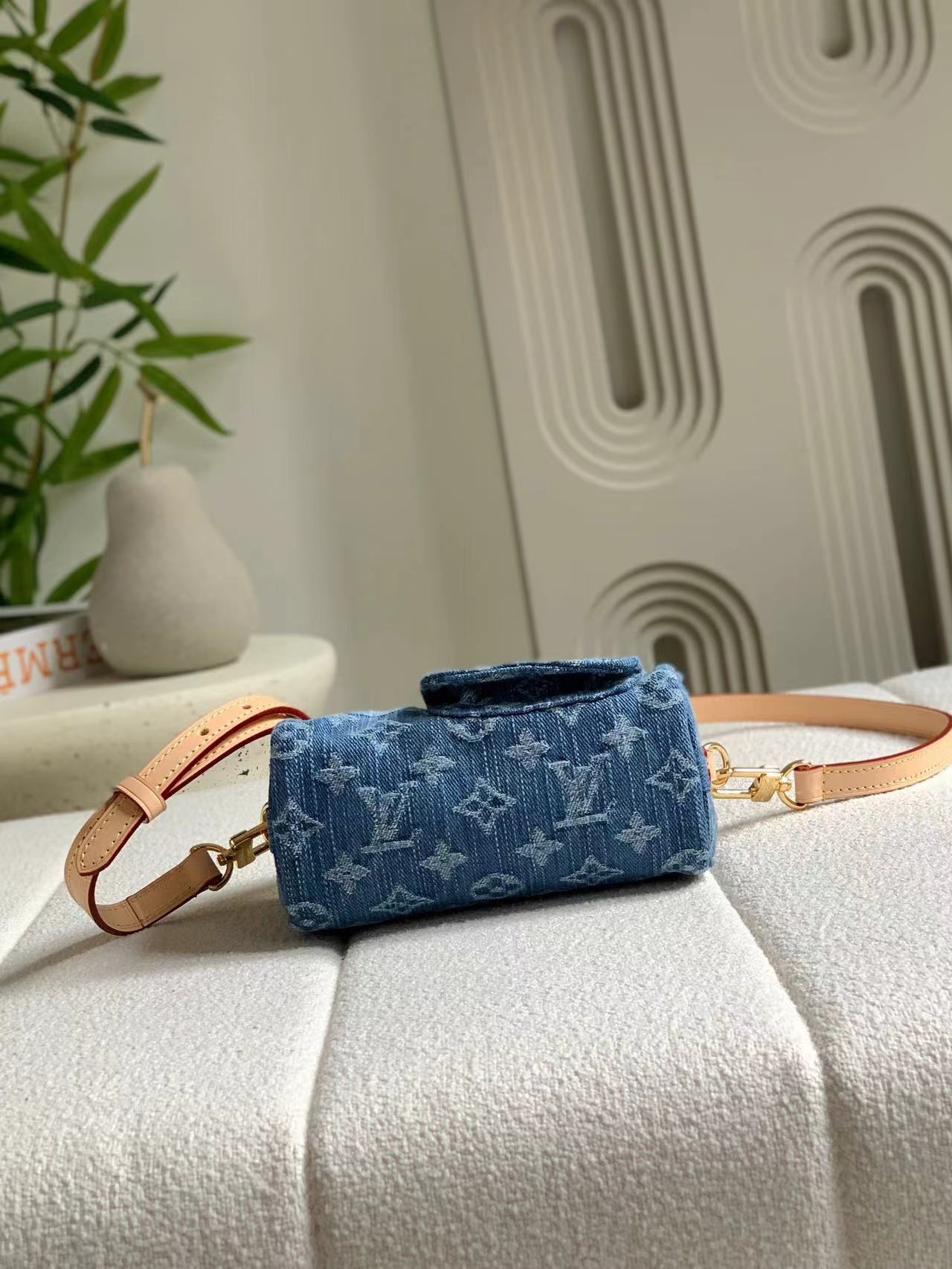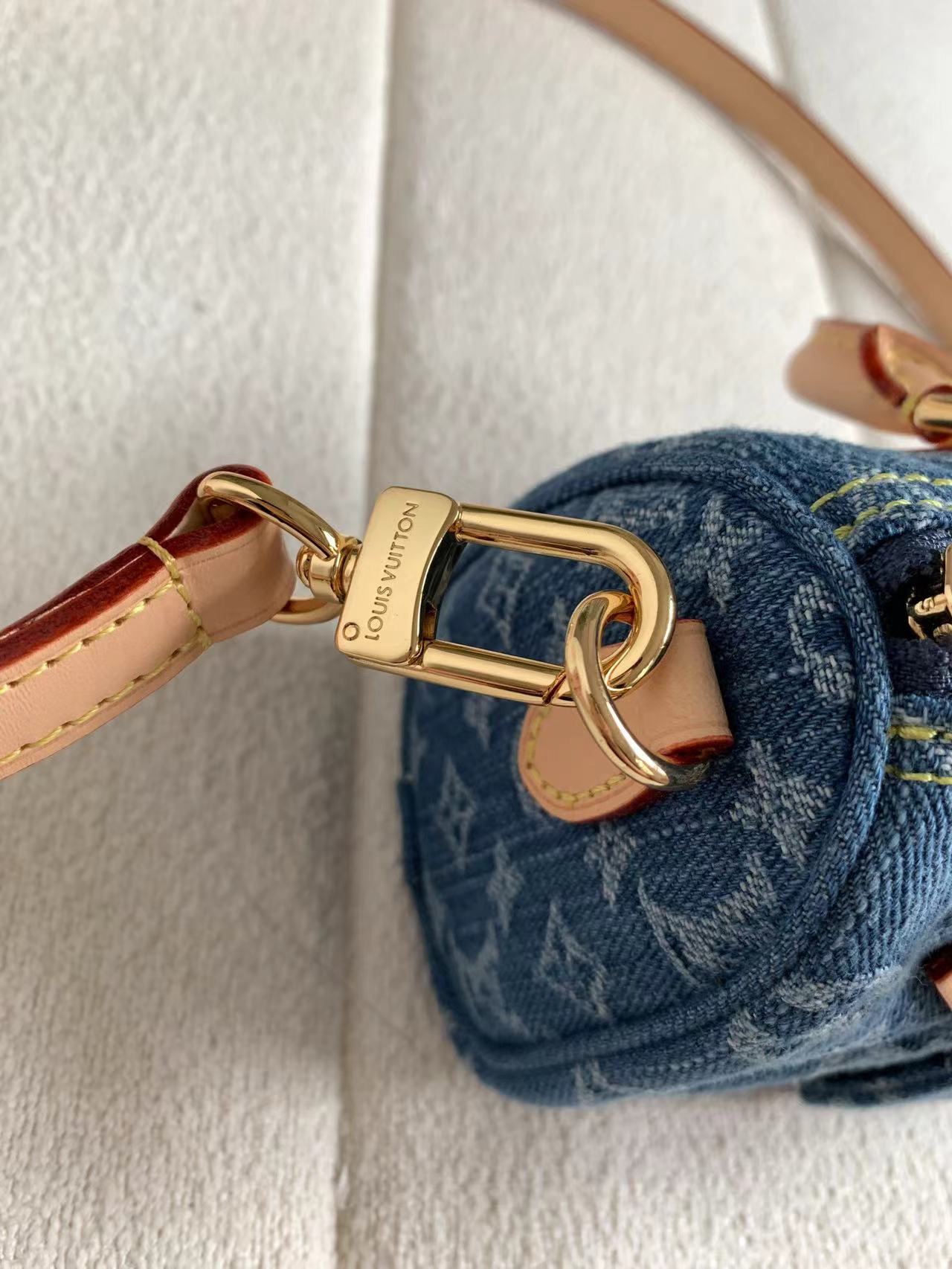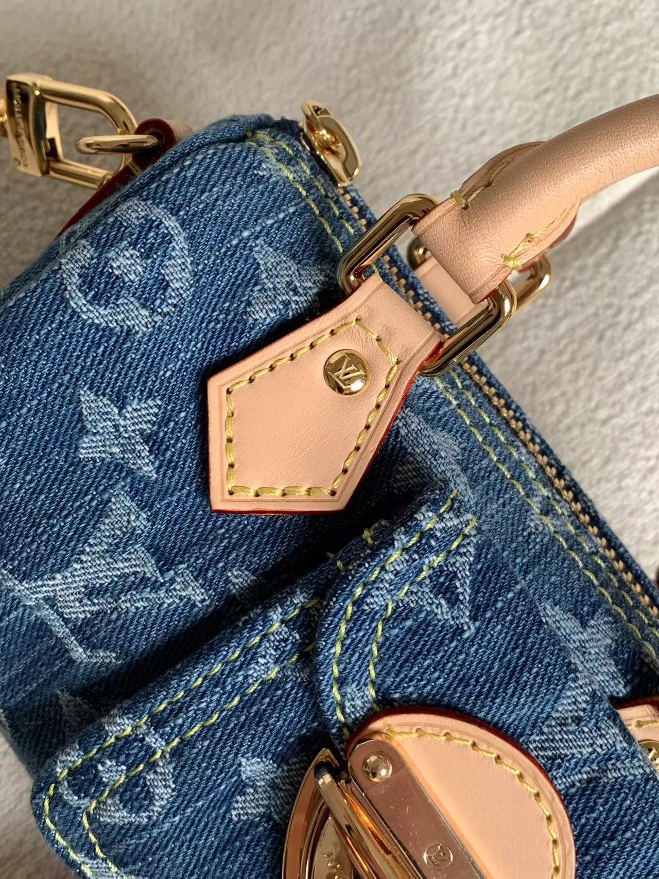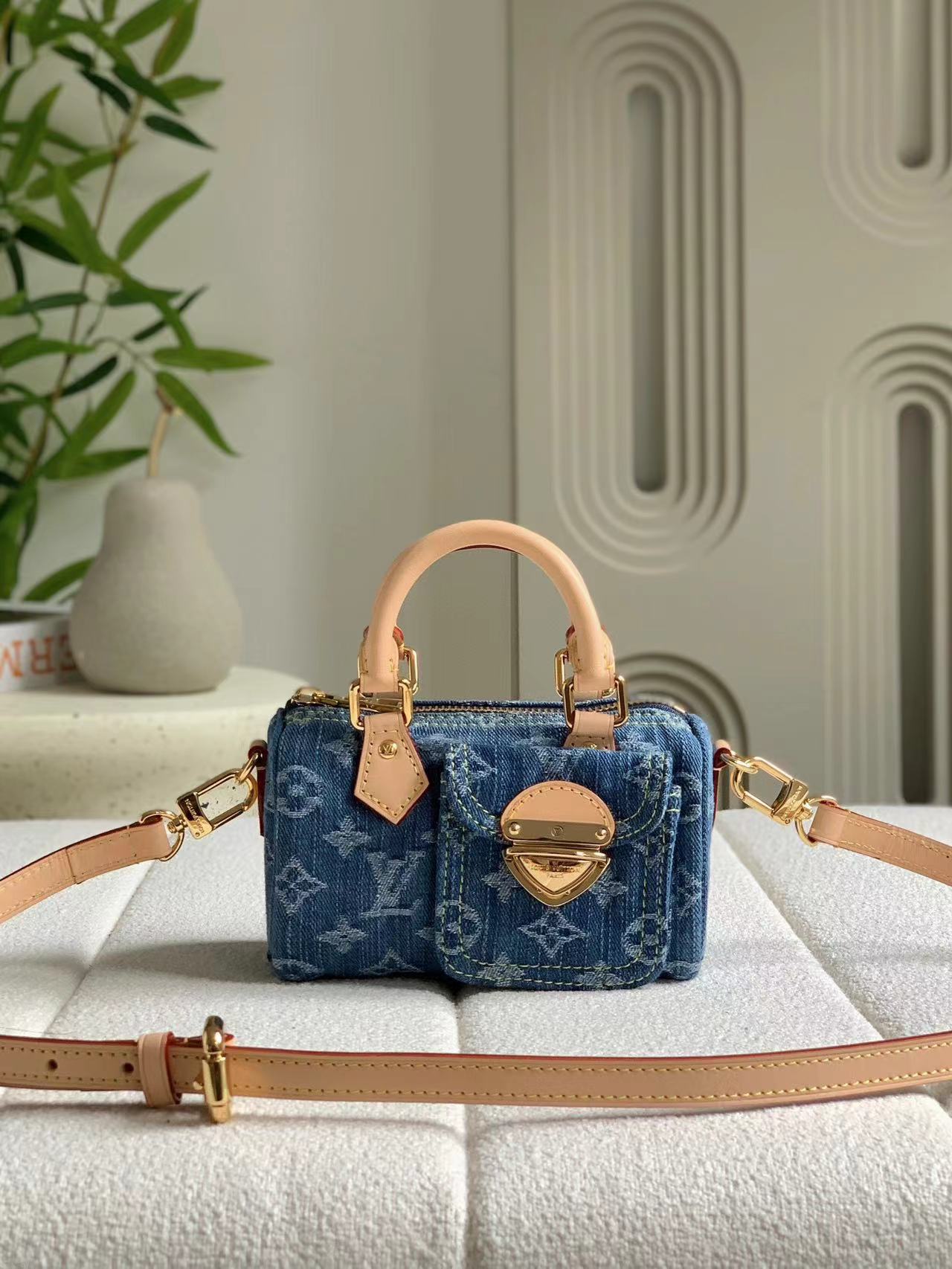 专柜新款M82950 本款 Nano Speedy手袋选用由认证棉织就的 Monogram Denim 砂洗帆布,搭配皮革手柄和可拆卸肩带。尺寸:16*10*7.5