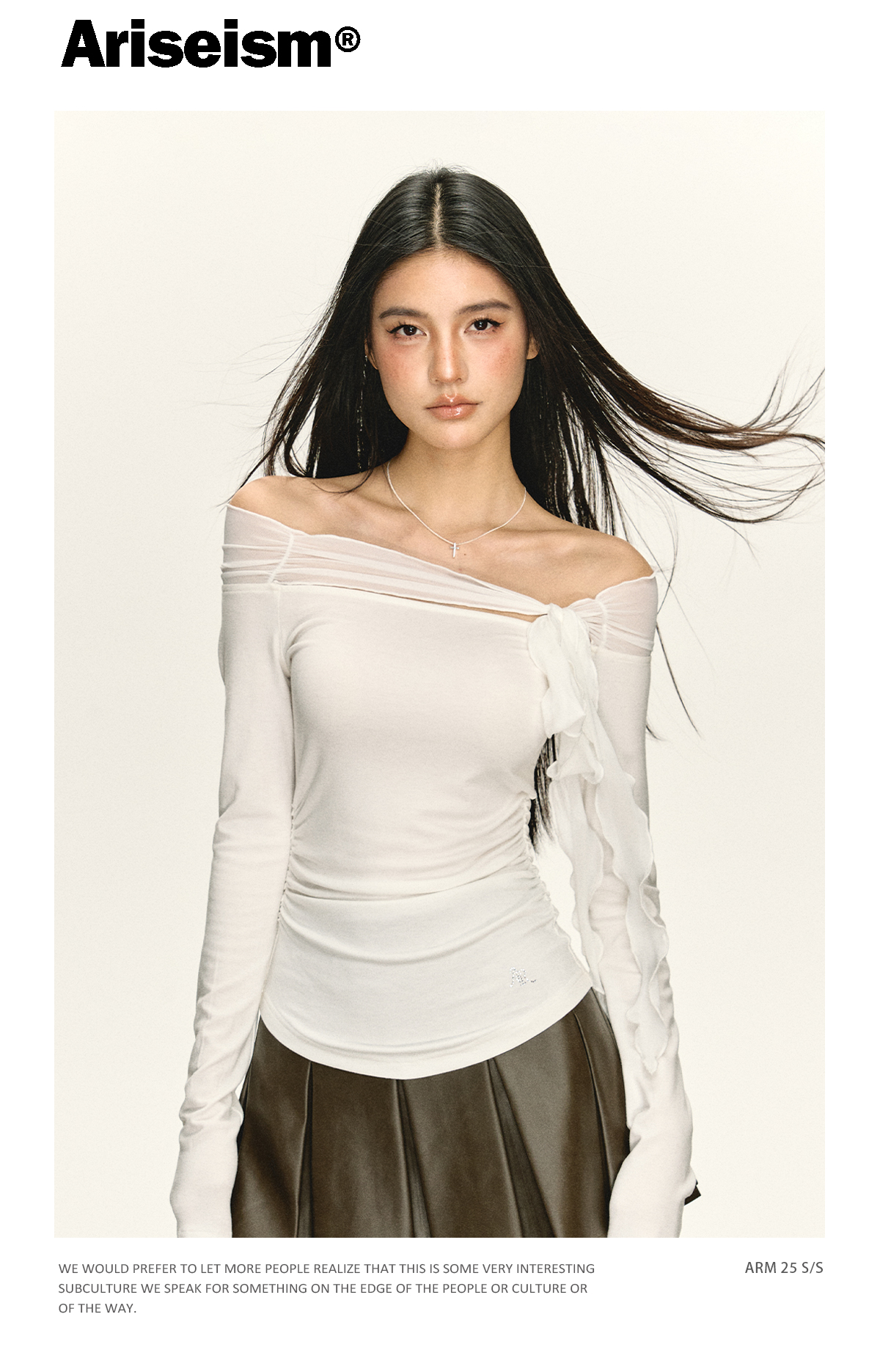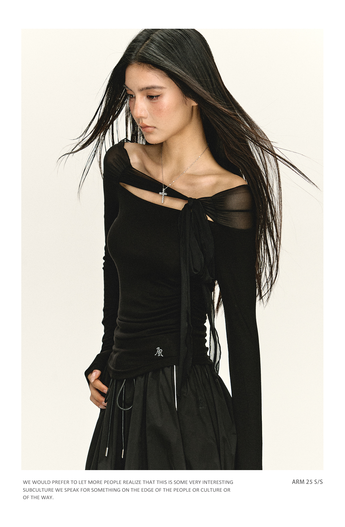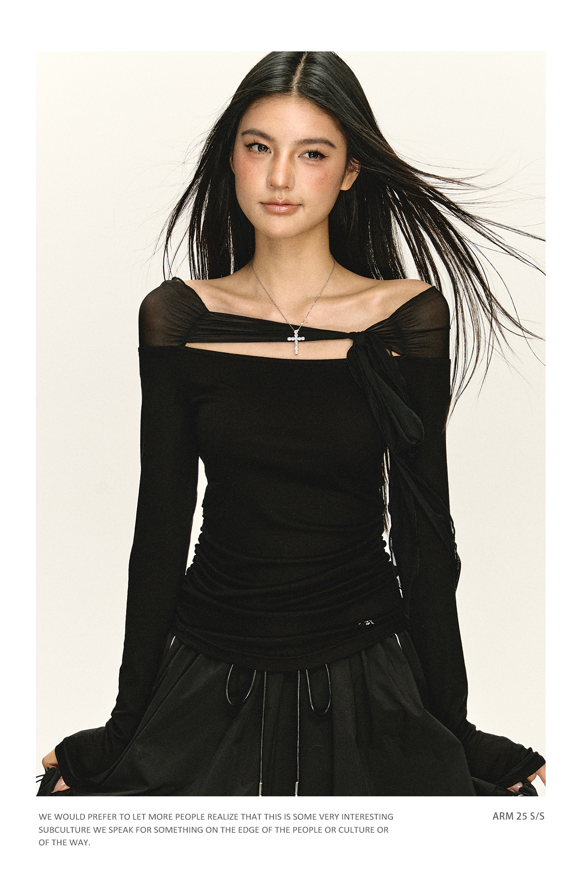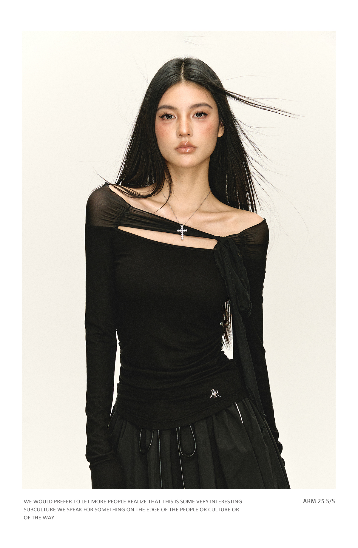 Ariseism 美式复古设计感双色网纱绑带一字肩长袖t恤女秋修身上衣