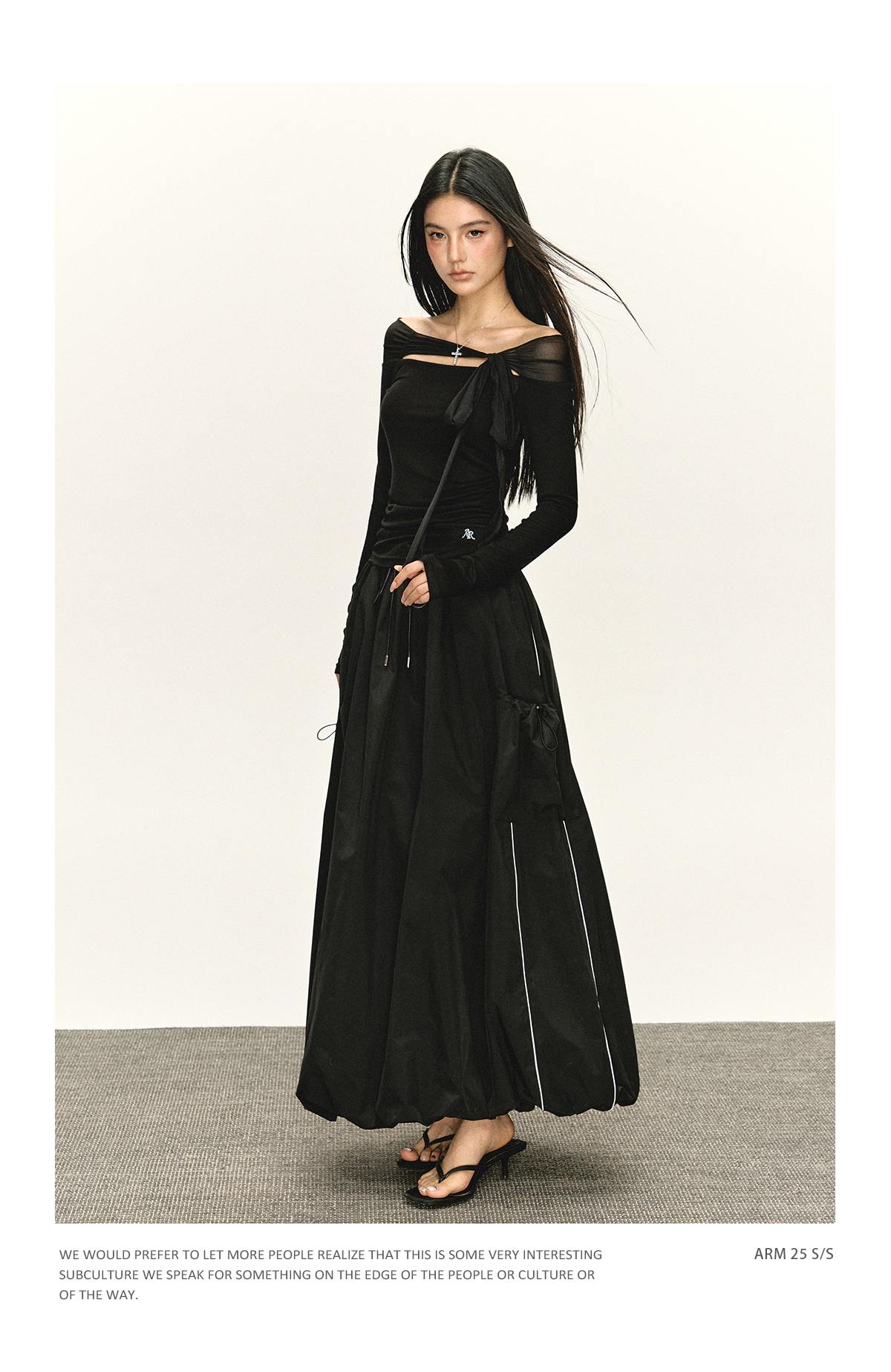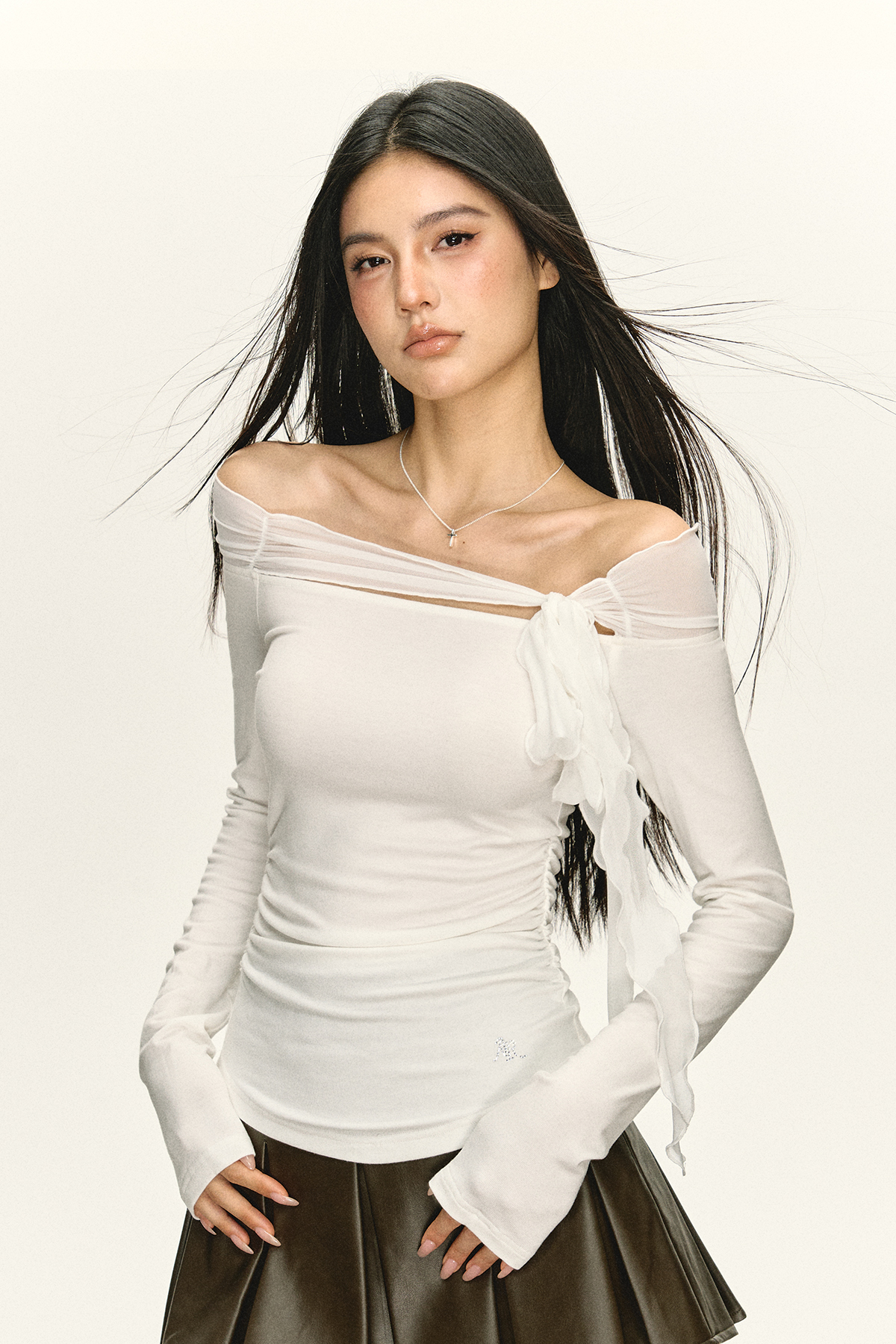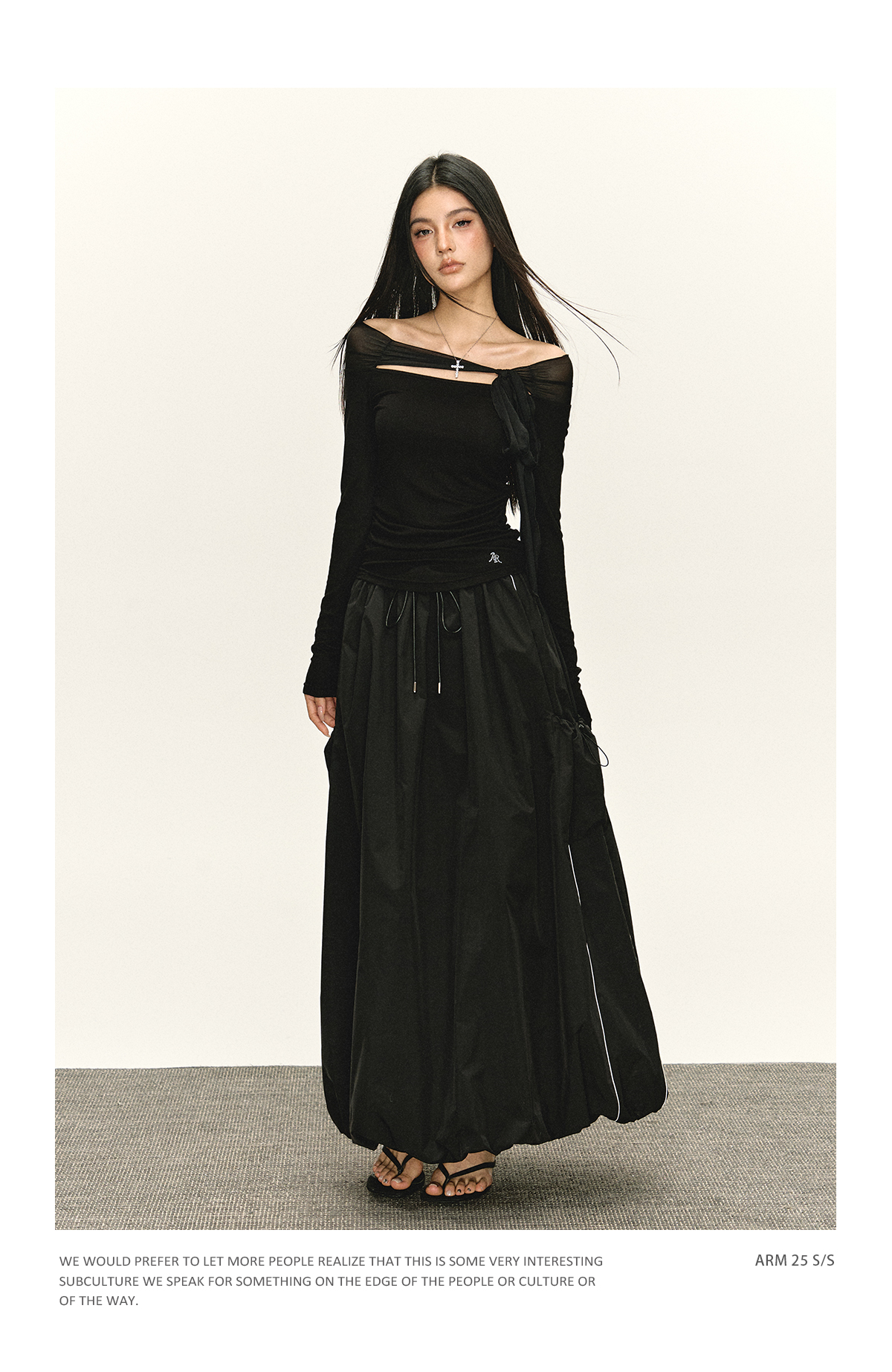 Ariseism 美式复古设计感双色网纱绑带一字肩长袖t恤女秋修身上衣