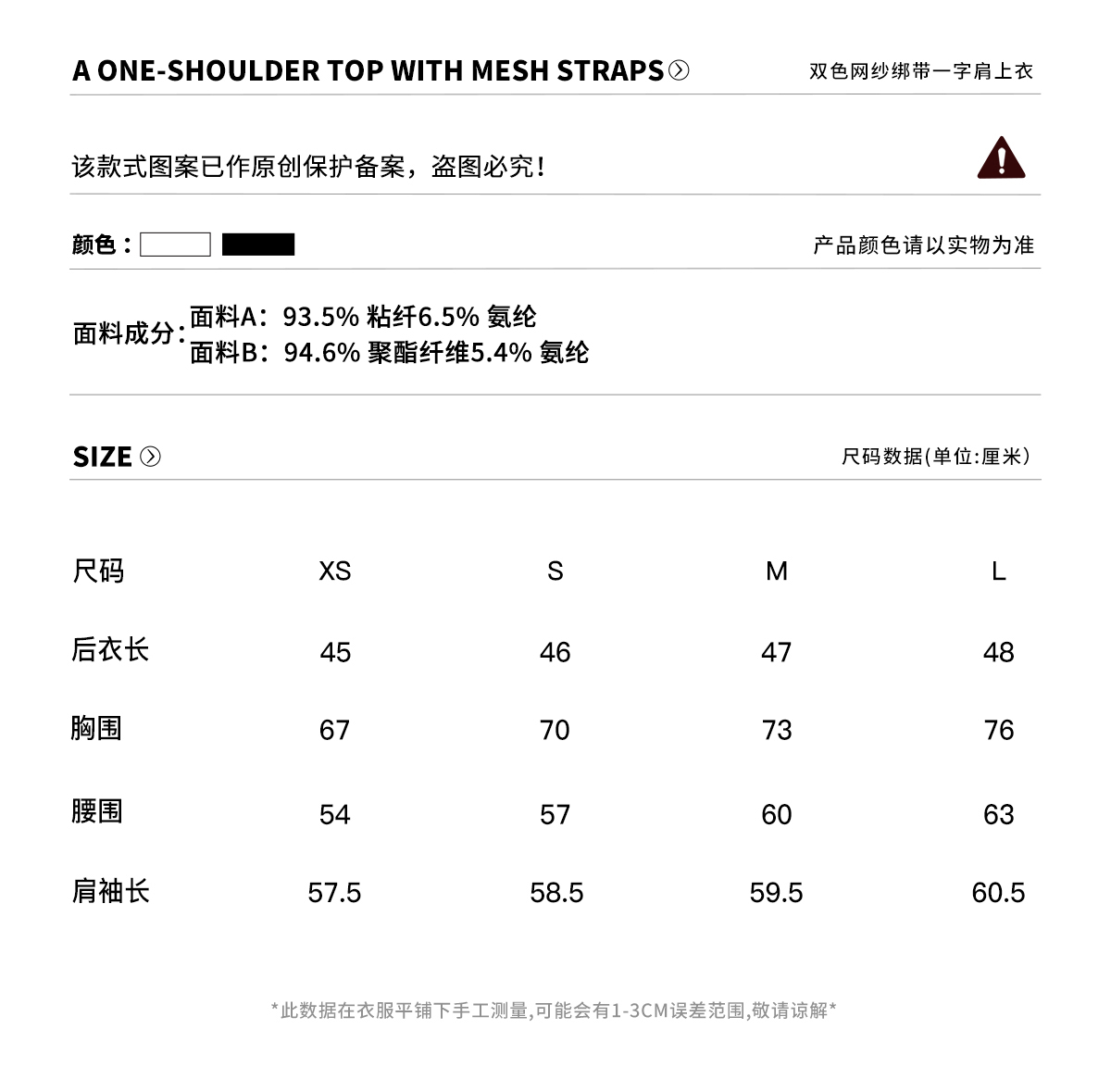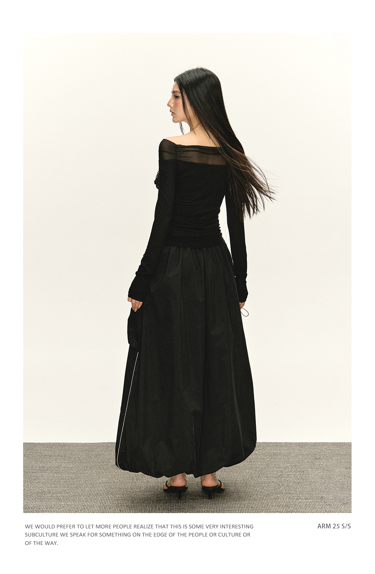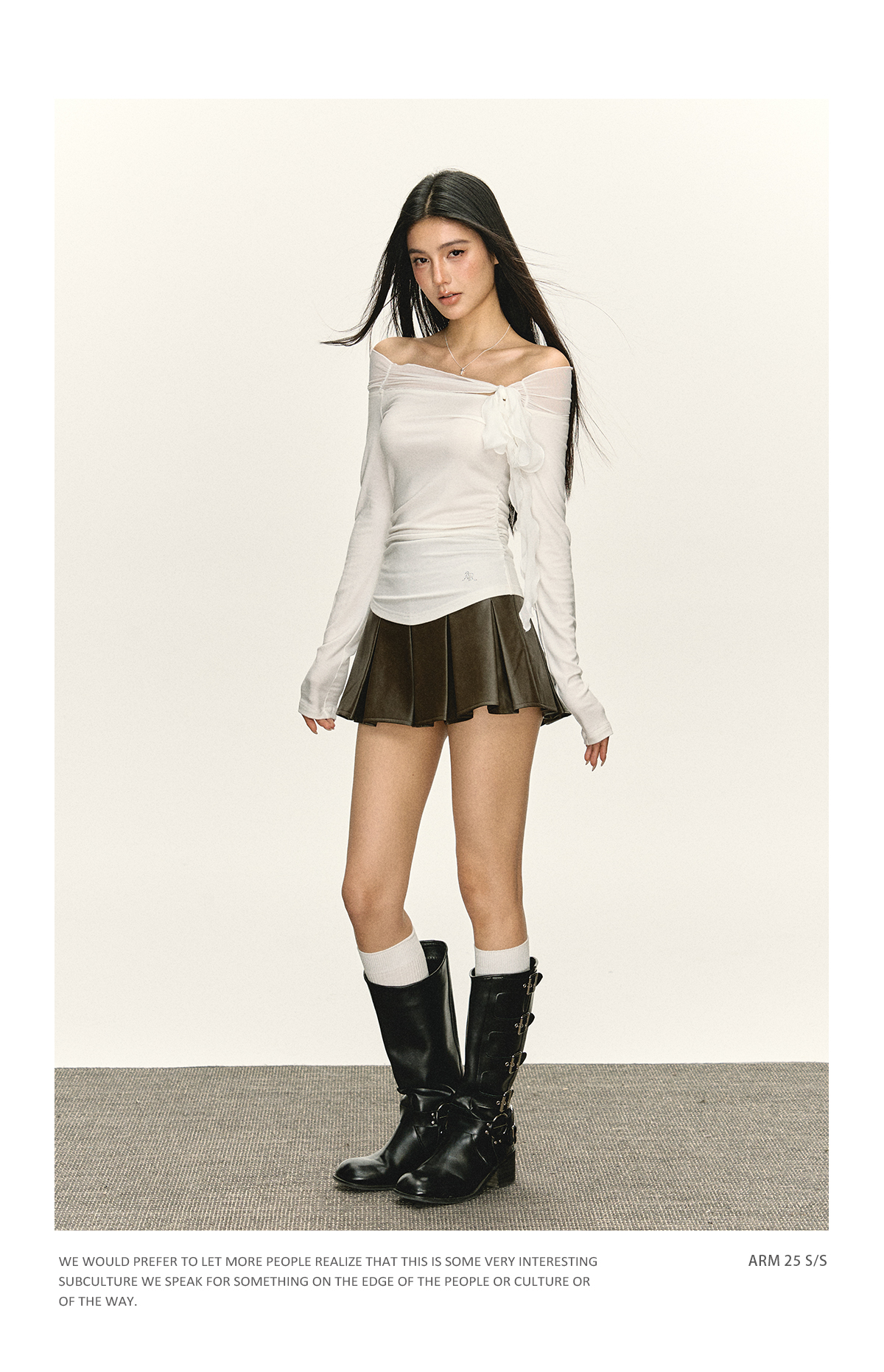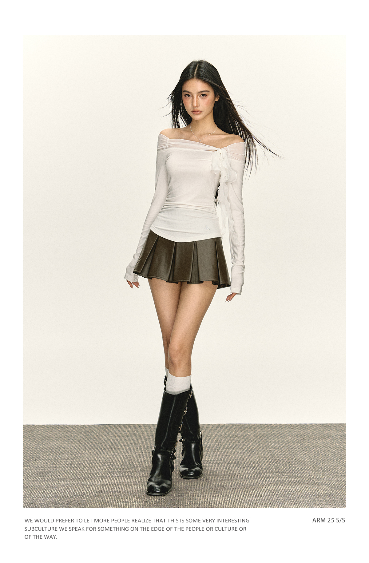 Ariseism 美式复古设计感双色网纱绑带一字肩长袖t恤女秋修身上衣