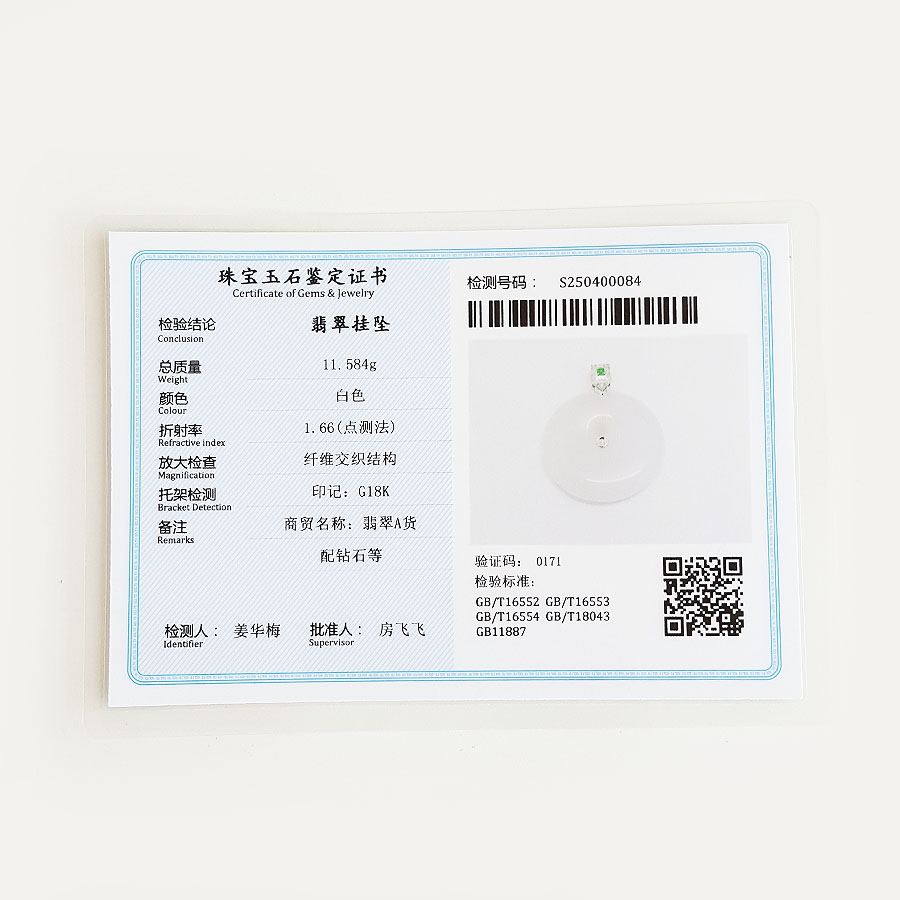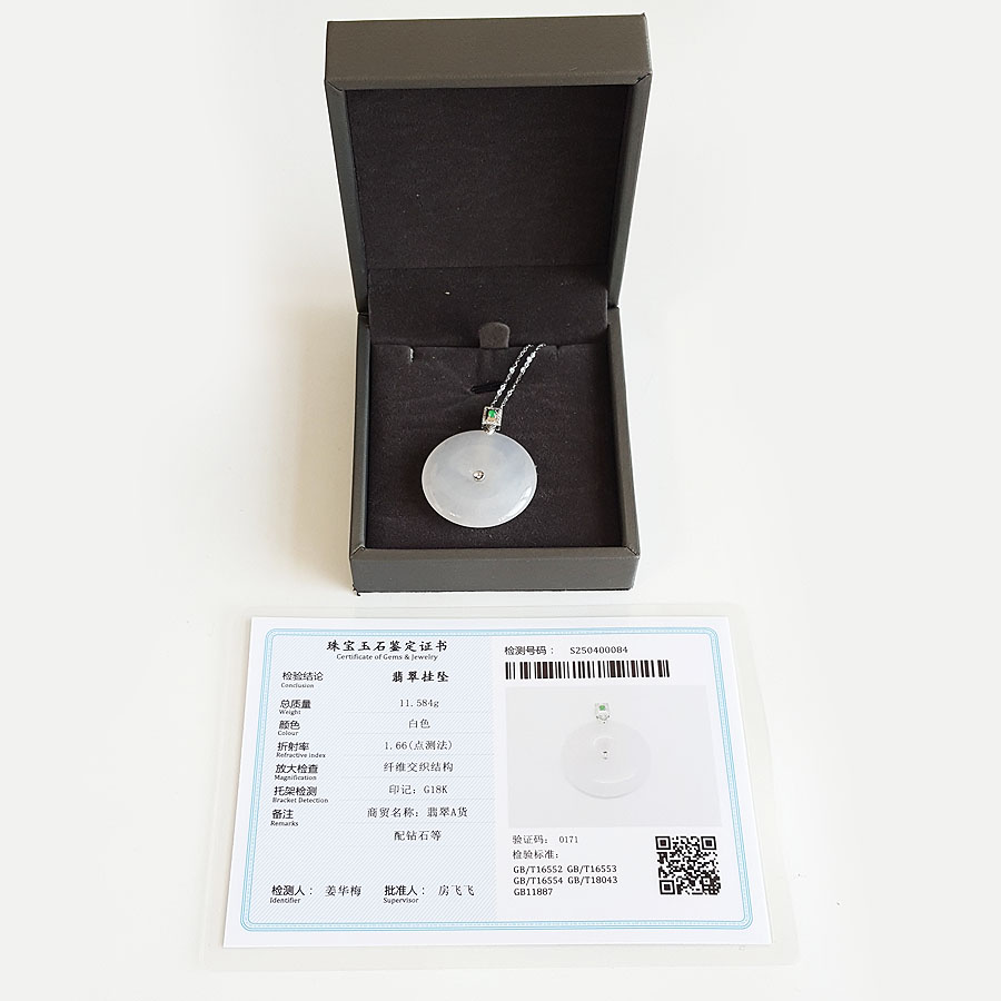 【天然正品】AU750白金镶钻镶天然细腻无裂纹糯冰种平安扣翡翠吊坠项链38.4*30.4*6.2MM(皆取最大值)女士现售价 :3980!020425AH69