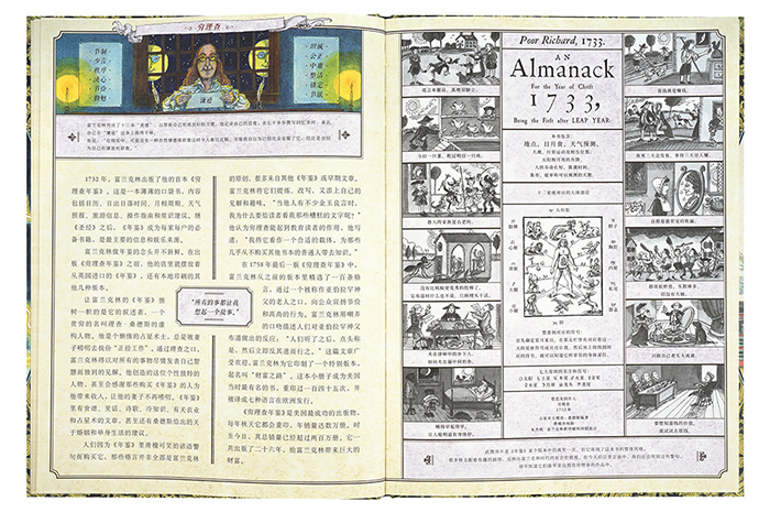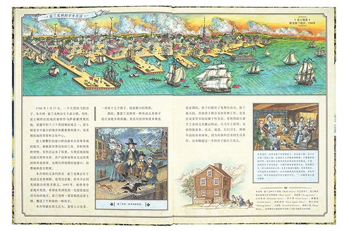1月,小富兰克林出生。作者罗伯特·伯德用细腻的笔触还原了殖民地时期繁忙的波士顿港口,右下角的房子就是当年富兰克林住过的。