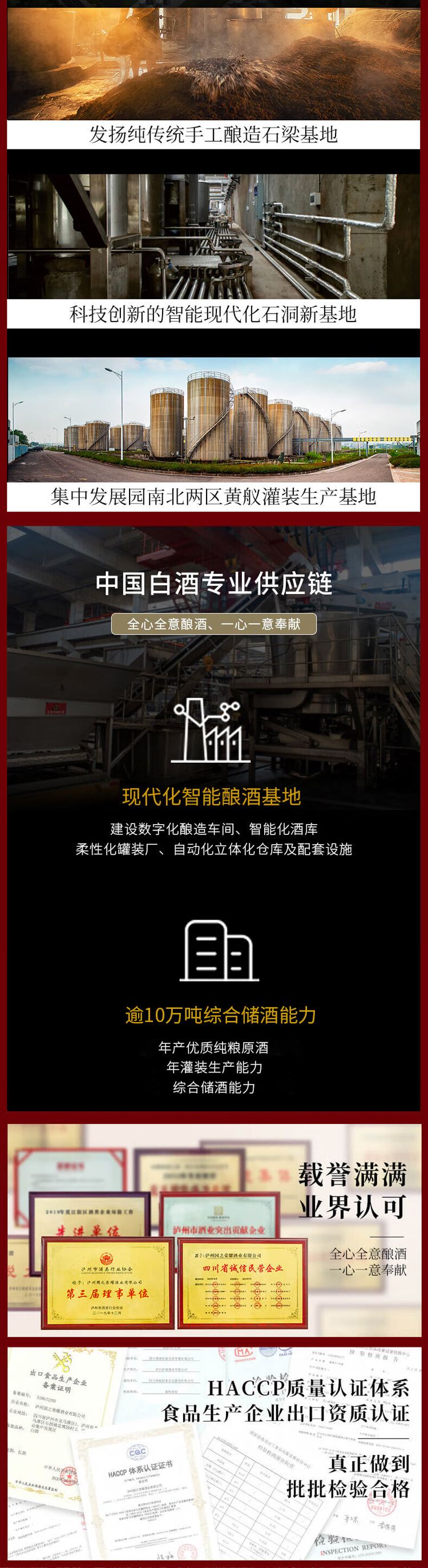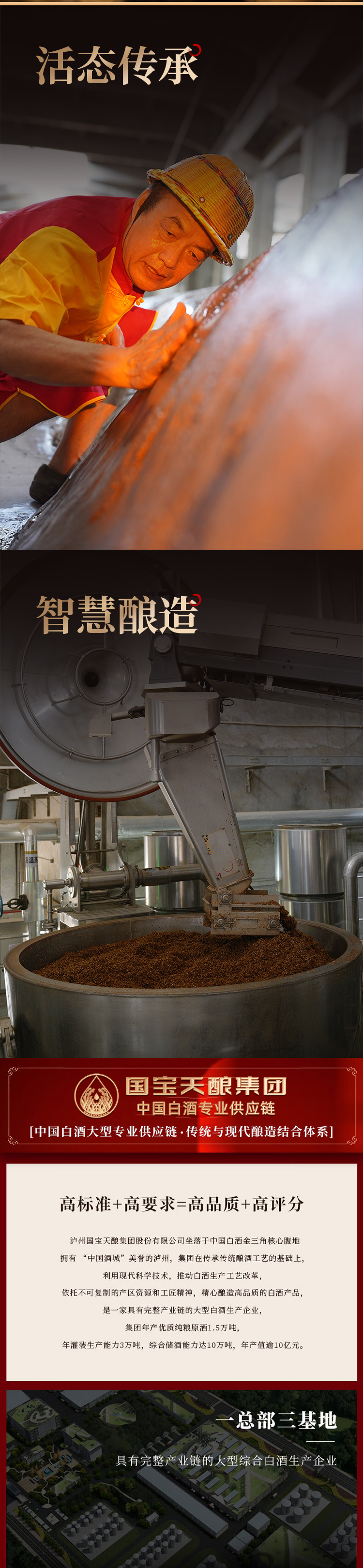 泸州国宝天酿集团股份有限公司是一家拥有完整产业链的大型白酒生产企业。集团年产优质纯粮原酒1.5万吨,年灌装生产能力3万吨,综合储酒能力达10万吨,年产值逾10亿元。