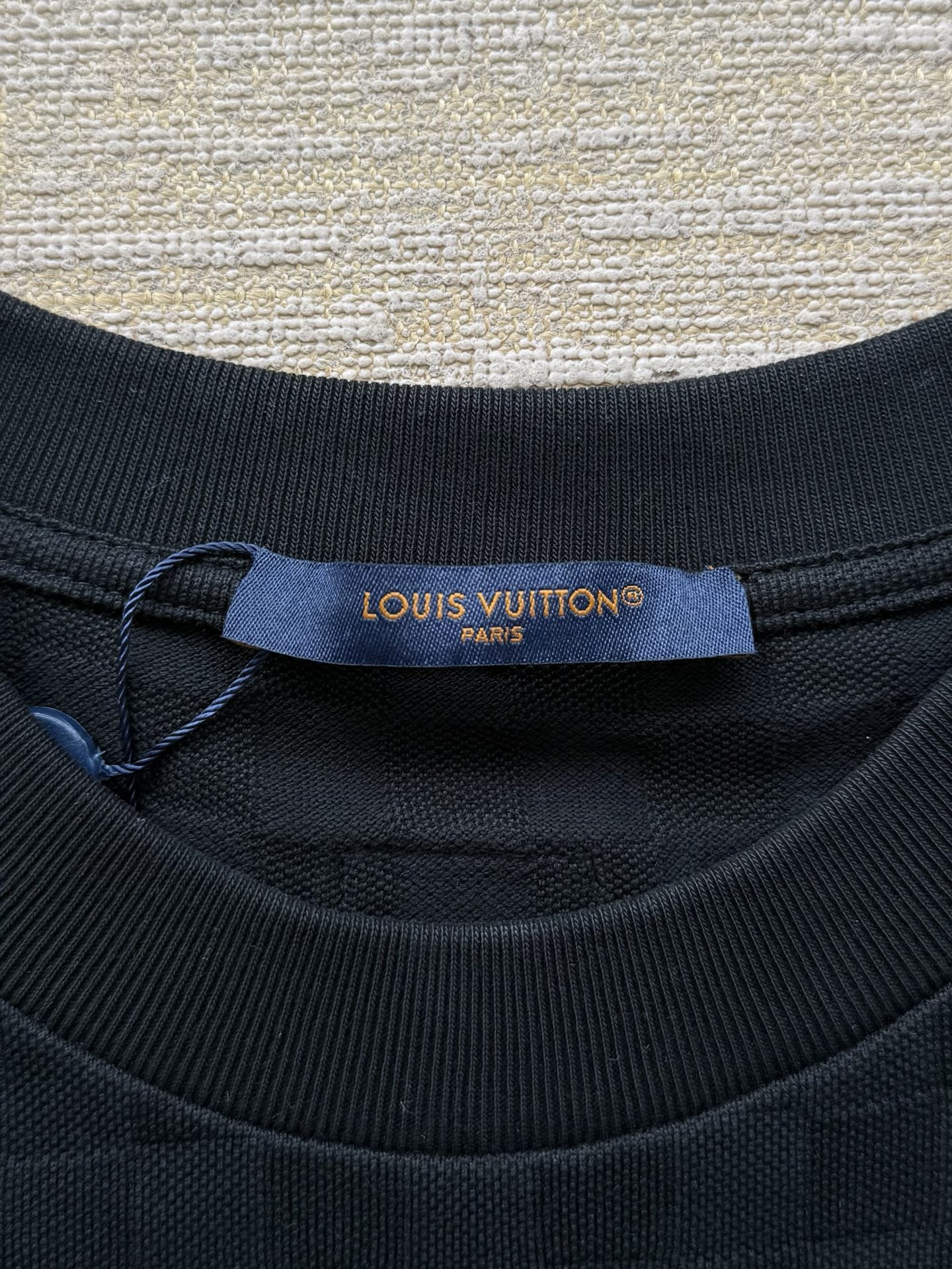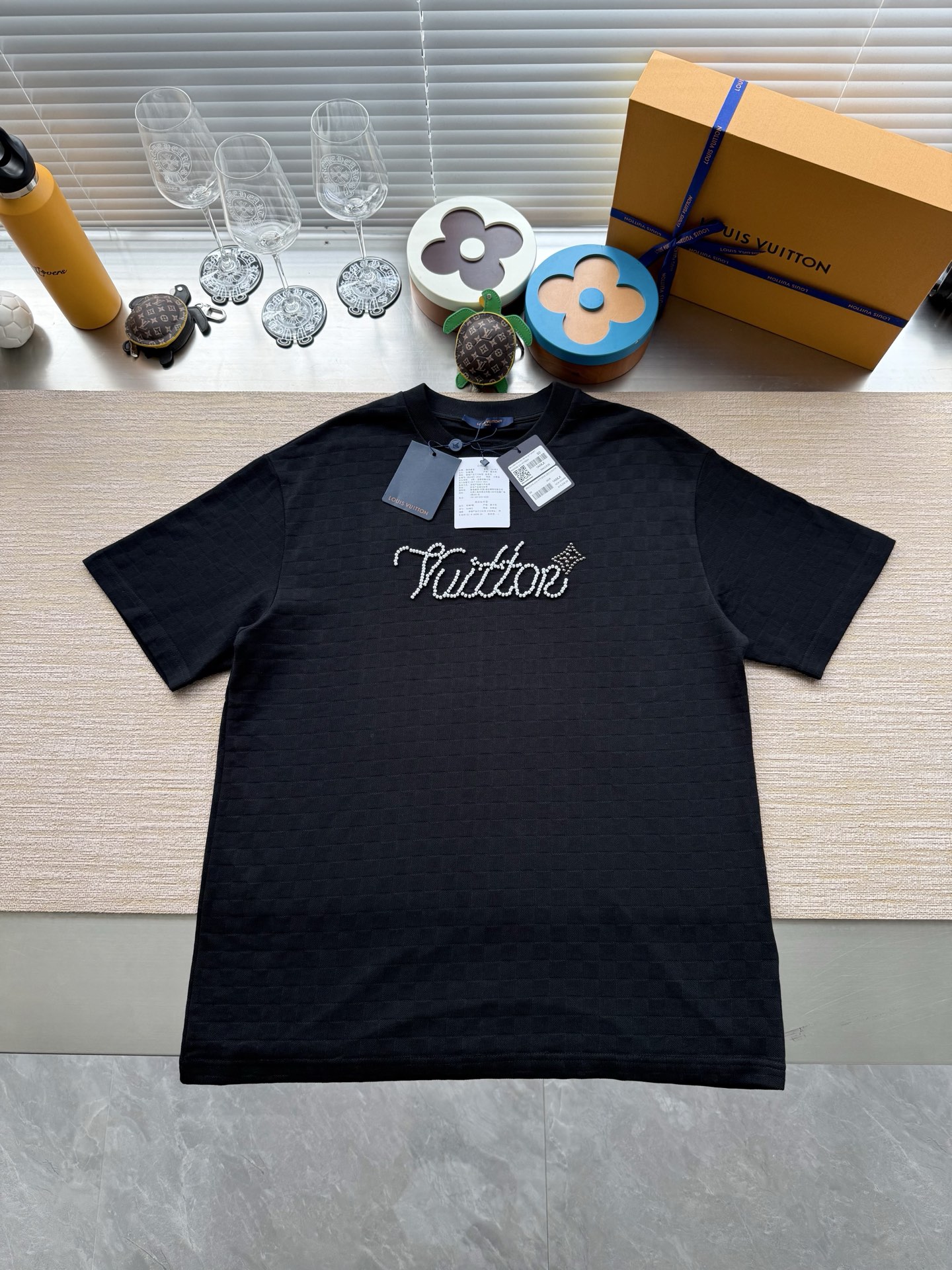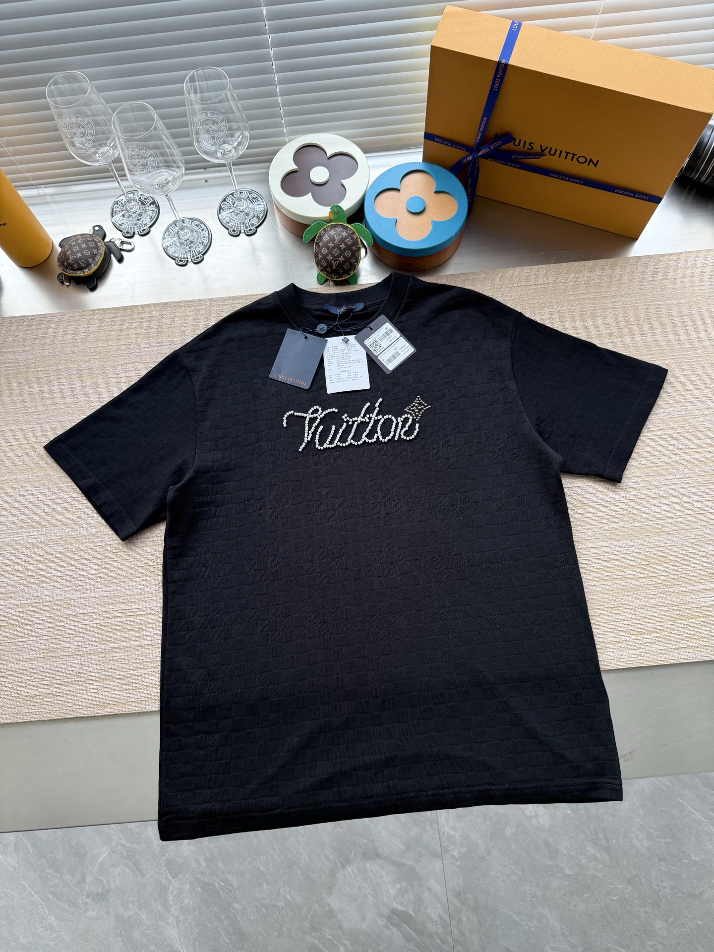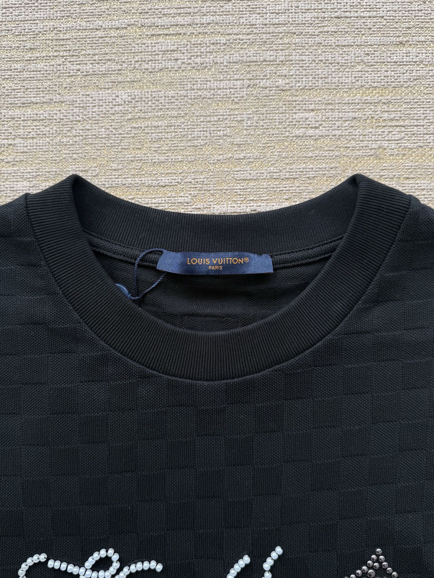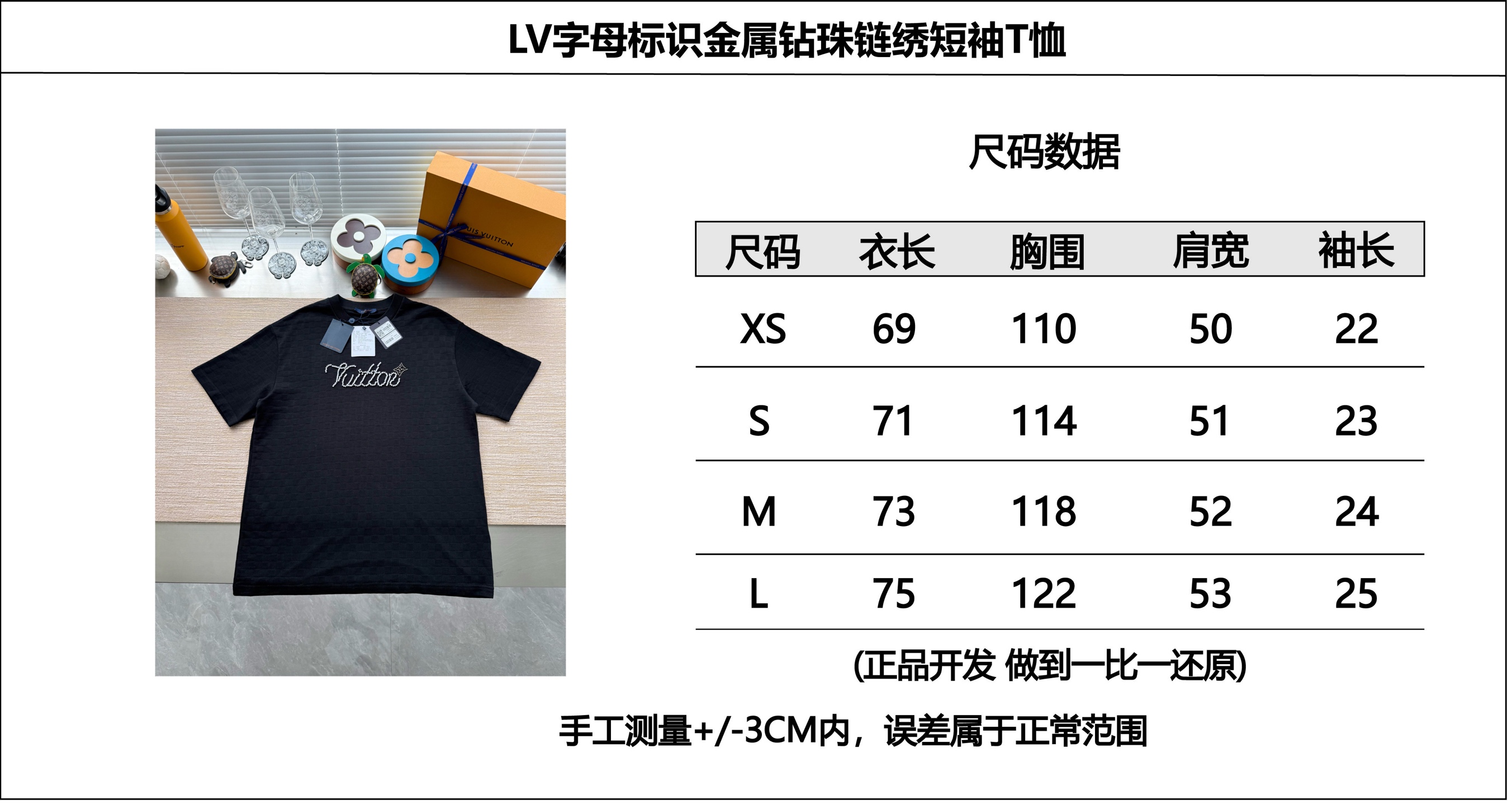 Louis Vuitton25ss字母标识金属钻珠链绣短袖T恤‼️整件衣服10200购买ZP拆解打造,采用定制黑色纯棉面料,做到100%全棉进口纱线,意大利制造,前幅饰以字母标识珠饰刺绣,定织标志性罗纹领口,超紧密度局部编织,真正做到1:1copy 码数:XS S M L