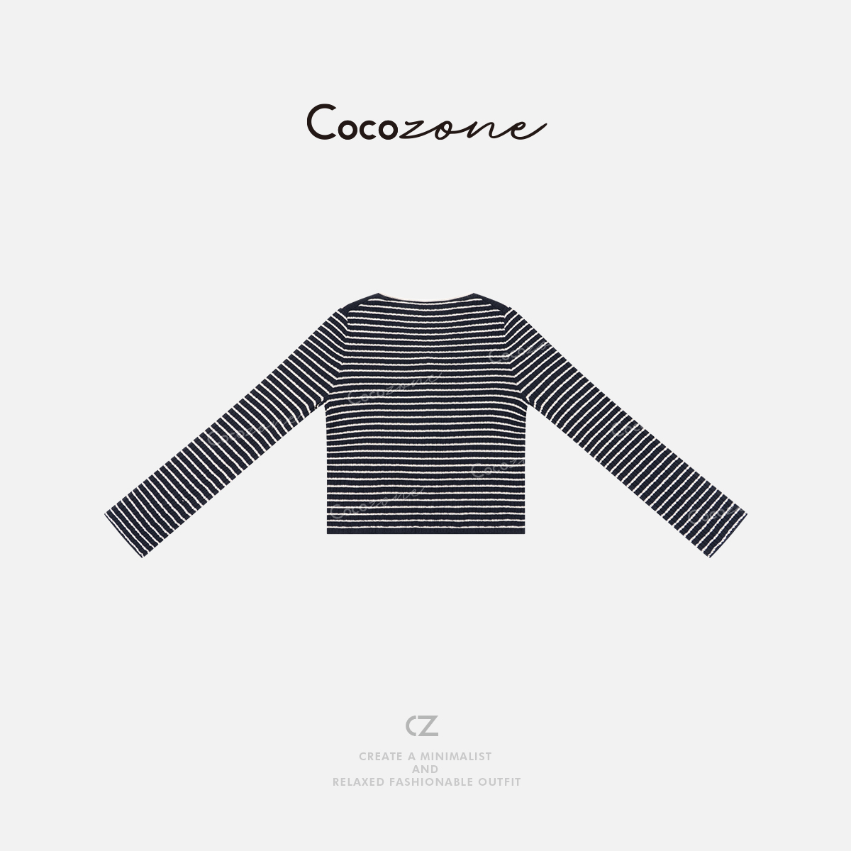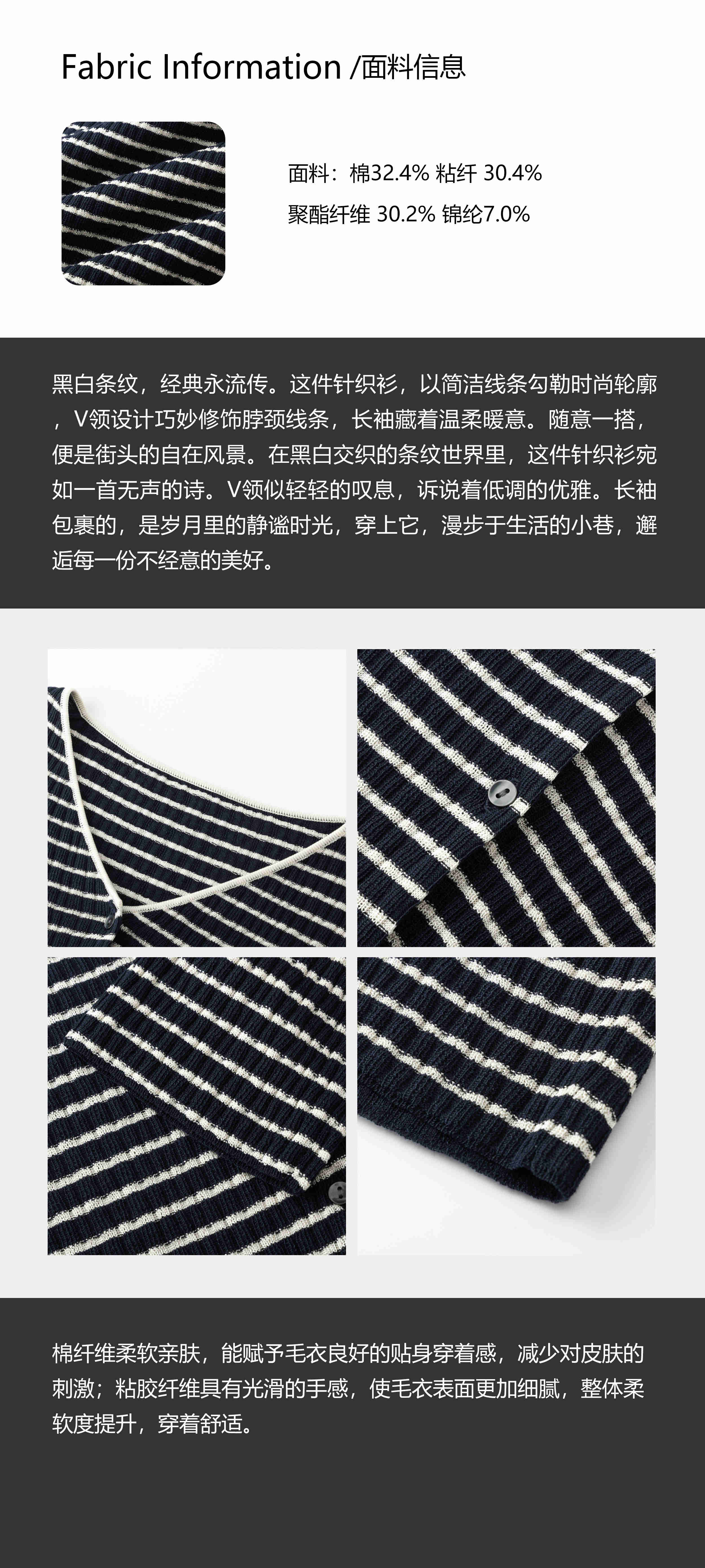 COCO ZONE 刘一一 简洁温柔黑白条纹V领单排扣毛织开衫CD1A0954