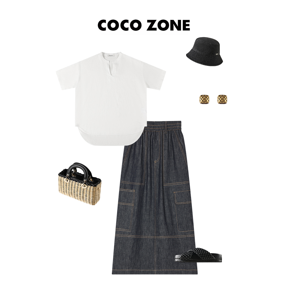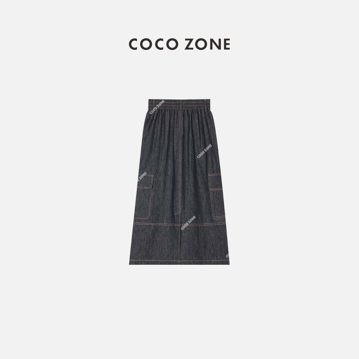 COCO ZONE 复古风撞色线牛仔半裙松紧腰下摆开衩 23C18916