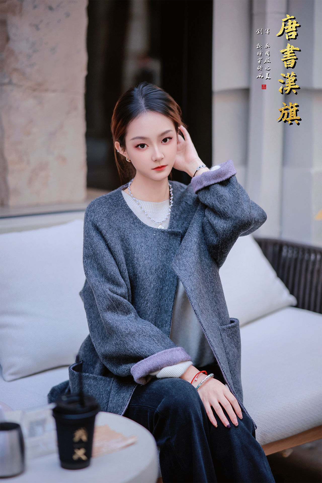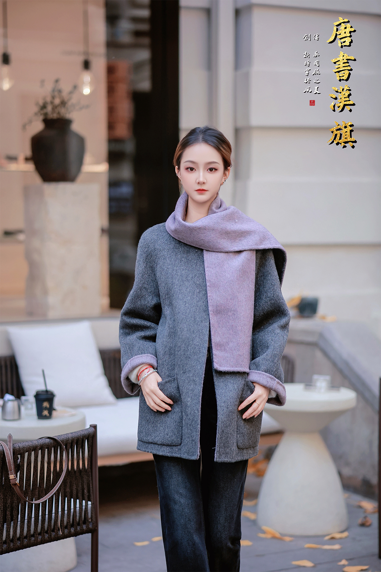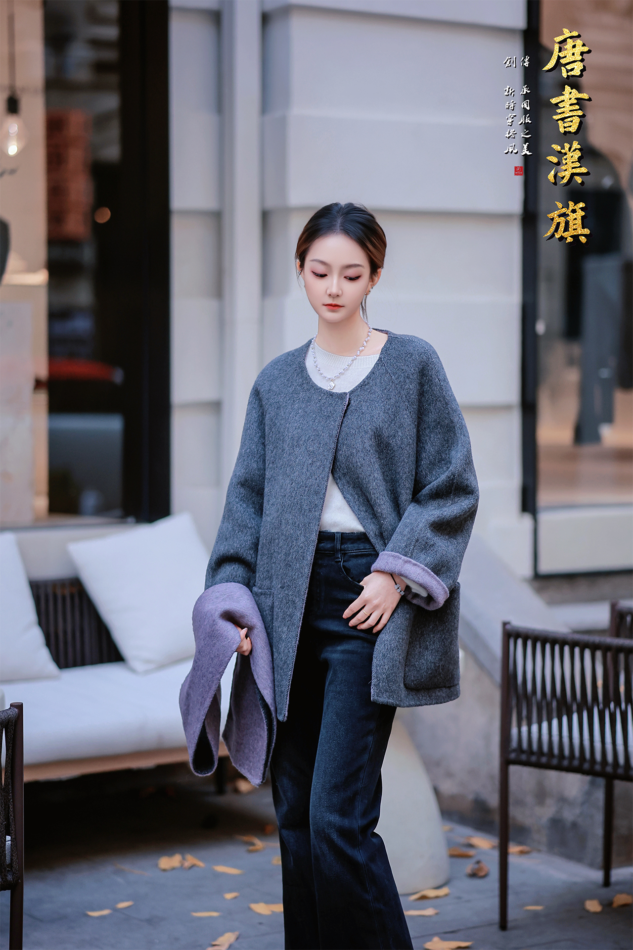 【紫烟】深灰色羊毛面料自带低调奢华质感,精选羊毛面料,触感软糯厚实,保暖性拉满,冬日穿着轻盈不压身,兼顾温度与质感。无领圆襟设计搭配oversize廓形,不挑身材,藏肉显瘦还能修饰肩颈线条