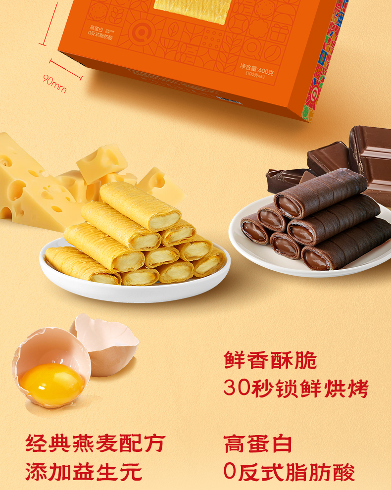 流心燕麦蛋卷礼盒600g(低GI咸蛋黄味100g*2盒 低糖巧克力味100g*2盒 低糖芝士味100g*2盒)