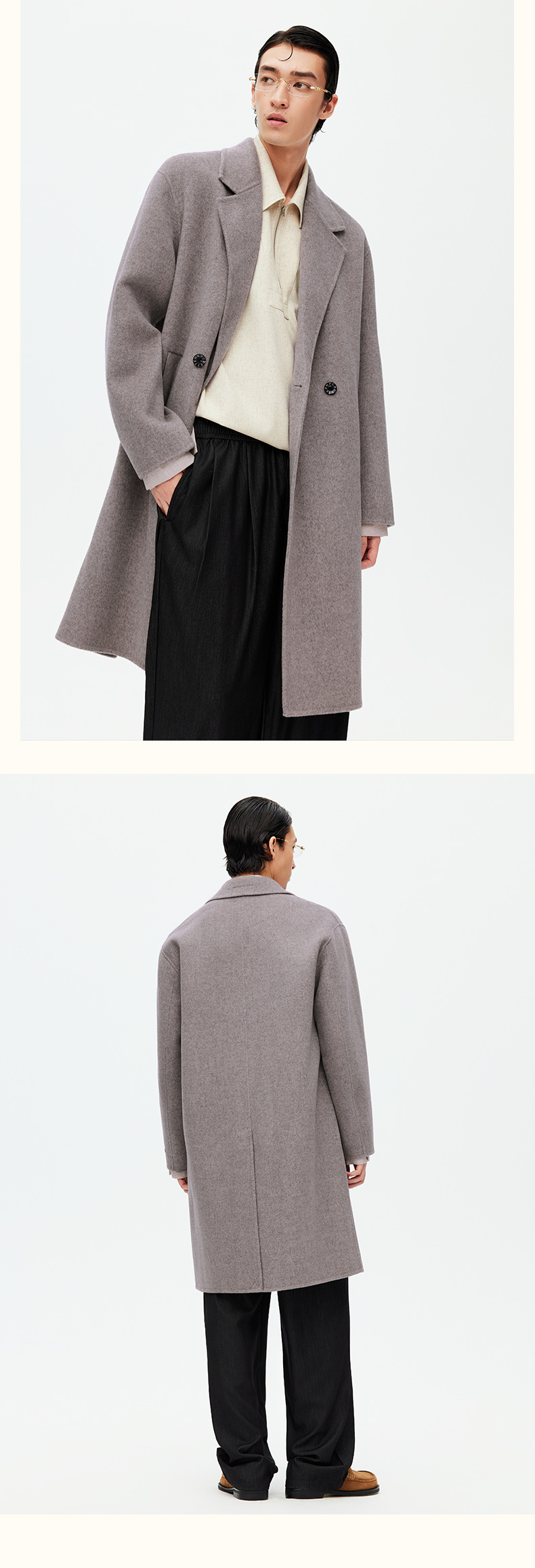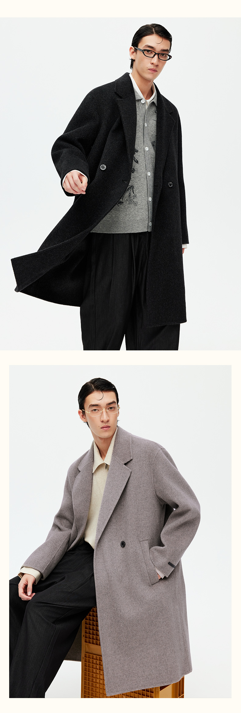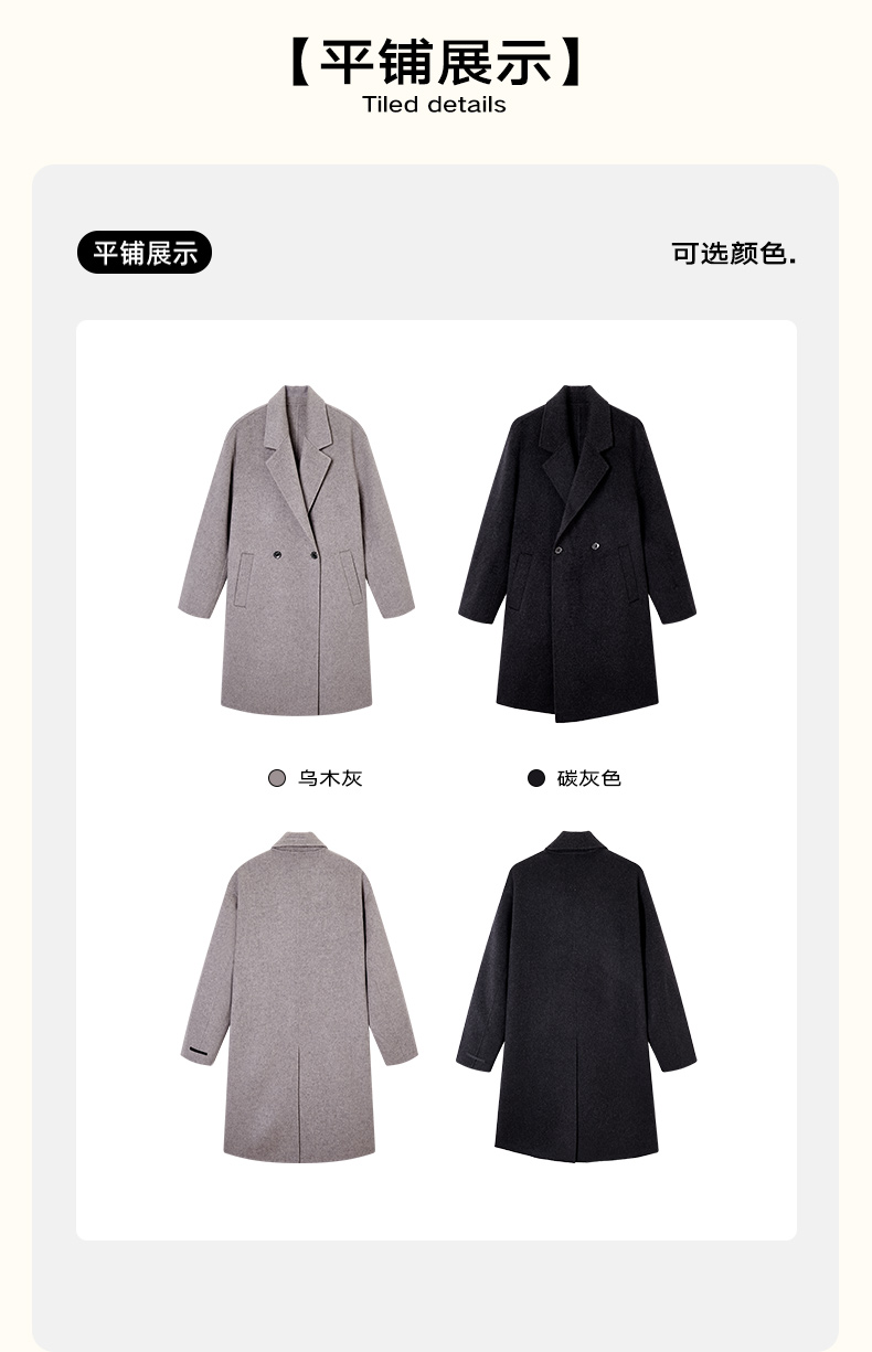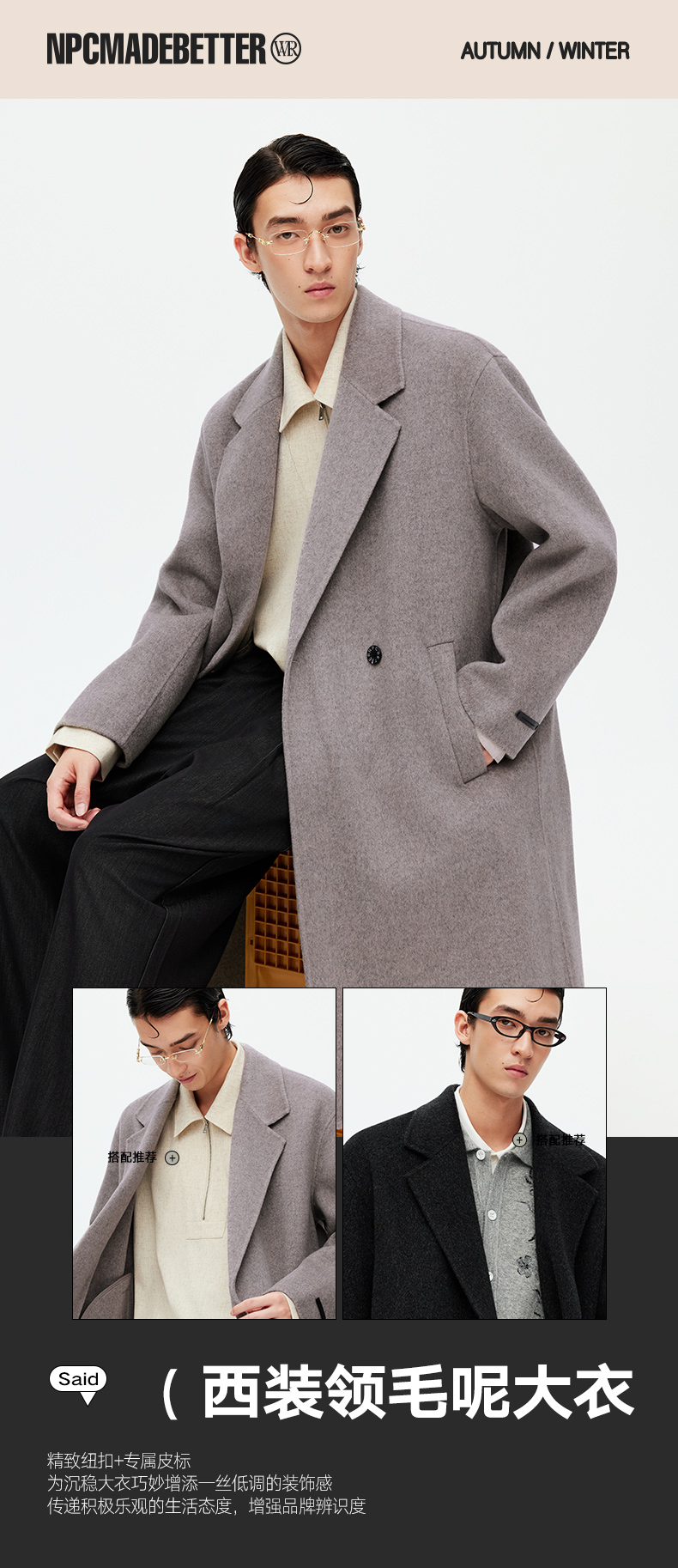 NPC潮牌100%绵羊毛平驳领毛呢长款大衣双排扣男冬上新NP58WC34&35