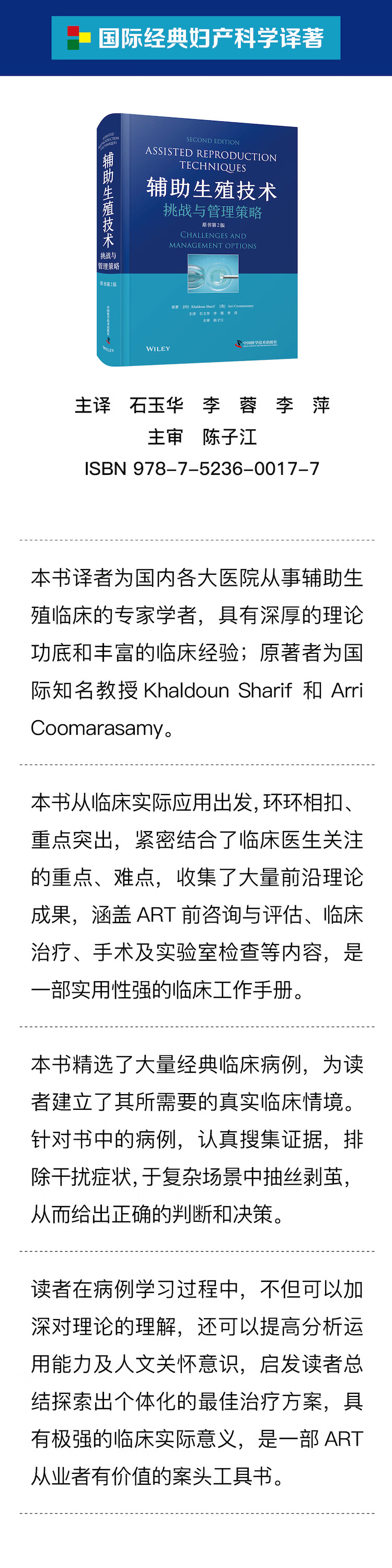 译者前言 近年来,辅助生殖研究进入发展快车道,正如雨后春笋,欣欣向荣,且硕果累累,临床诊疗方案焕然一新,但与此同时,许多新的挑战不断出现。Assisted Reproduction Techniques: Challenges and Management Options, 2e 一书由 Khaldoun Sharif 和 Arri Coomarasamy两位国际知名教授主编,从临床实际应用出发,紧密结合临床医生关注的重点难点,收集了最前沿的理论成果,涵盖了 ART 前的咨询与评估、临床治疗、手术及实验室部分,环环相扣、重点突出。 本书精选了大量经典临床病例,读者需要在真实的临床情境中,认真搜集证据,排除干扰症状,于复杂场景中抽丝剥茧,做出正确的判断和决策。在病例学习过程中不但可以加深对理论的理解,还可以提高分析运用能力及人文关怀意识,启发读者总结探索出个体化的治疗方案,具有极强的临床实际意义,可作为 ART 工作者的案头工具书。 本书的译者均为国内各大医院的专家学者,他们在临床工作学习中发现了本书并成为其忠实读者。在翻译过程中,我们坚持“忠实原文、理论精准、流畅连贯”的原 则,进行了反复审校和修改润色,力求将最好的效果呈现给大家,但由于中外术语规范及语言表达的差异,书中可能存在一些疏漏或欠妥之处,恳请各位读者多加批评指正,我们将不断改进完善。 最后,感谢参与本书翻译的每一位译者,他们高度的工作热情、深厚的理论功底和丰富的临床经验,是本书能够顺利付印的最大倚仗,同时也感谢中国科学技术出版社给予的支持和鼓励。 广东省人民医院 石玉华 北京大学第三医院 李蓉 厦门大学附属妇女儿童医院 李萍
