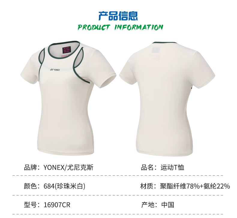 YONEX尤尼克斯yy羽毛球服女款透气舒适运动短袖16907CR