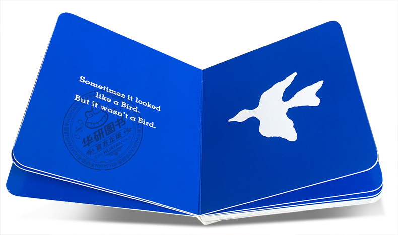 It Looked Like Spilt Milk《看上去像打翻了的牛奶》的主角是千变万化的云。全书没有过多的装饰,只有蓝底配上留白的图,就是蓝天白云的写照。全文以“Sometimes it looked like Spilt Milk. But it wasn’t Spilt Milk.”这两个句型贯穿全书,简单好读。简单的外形和纯白色的图案,比一般具象的插图更可以引发孩子们的想象力。