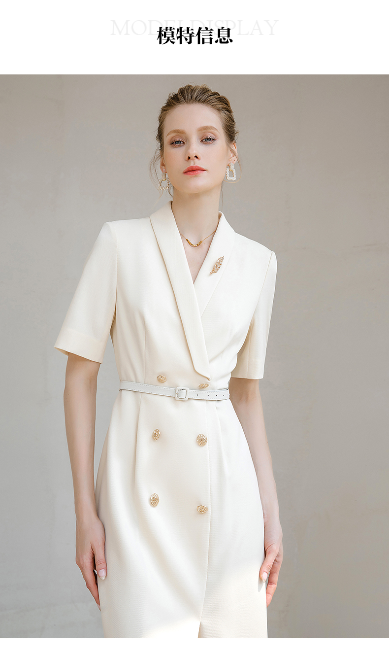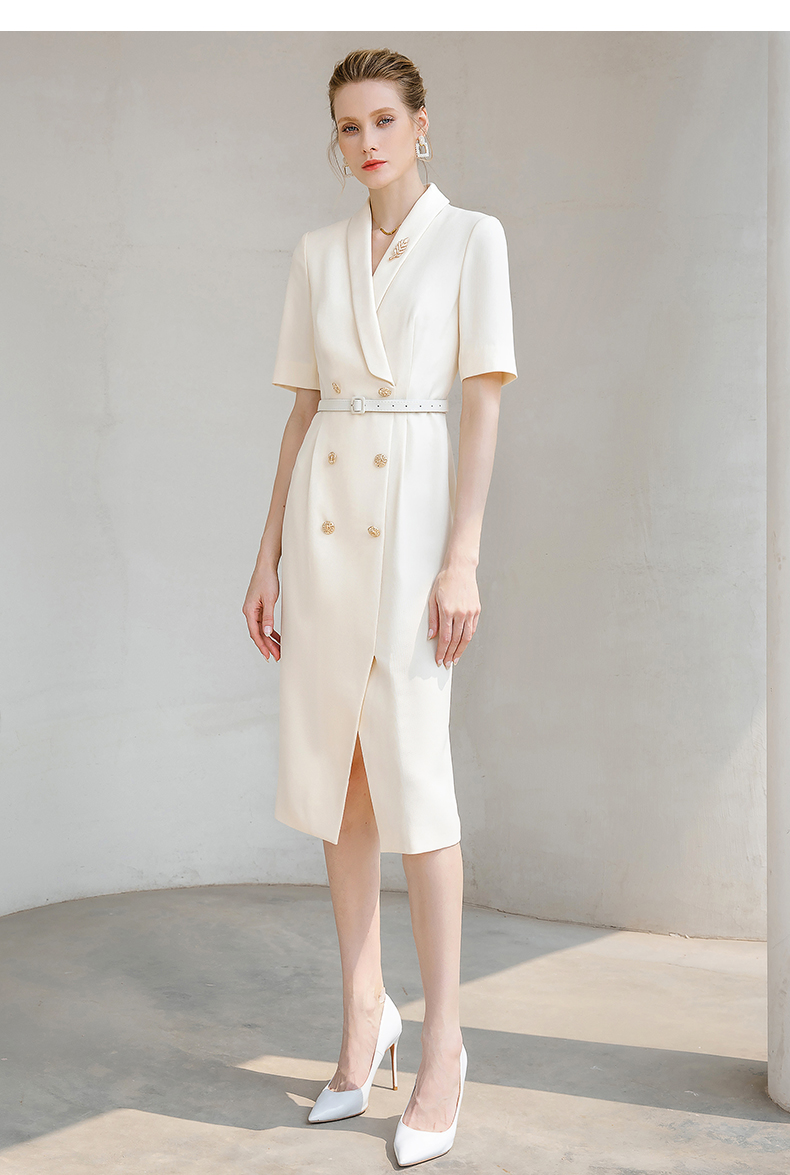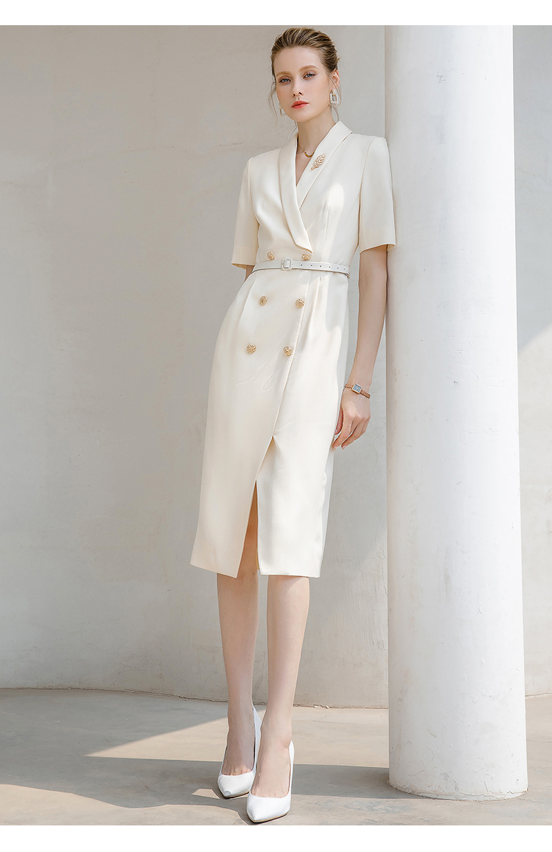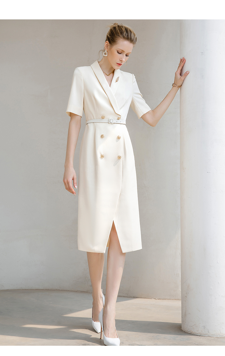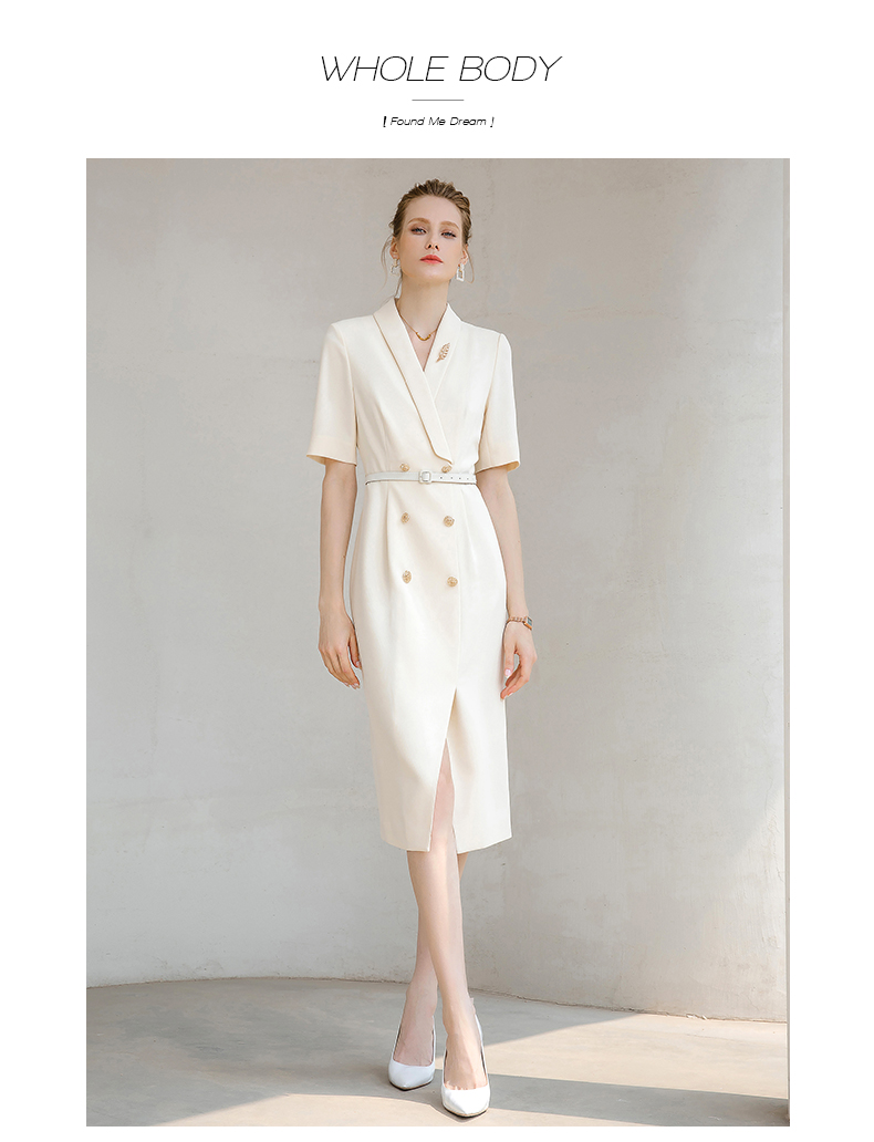 夏季高端时尚OL通勤高腰双排扣杏色连衣裙女主持人职业装西装裙