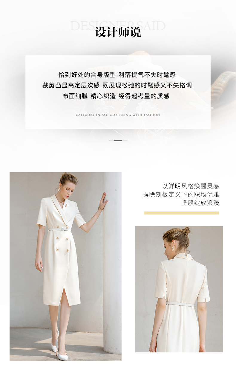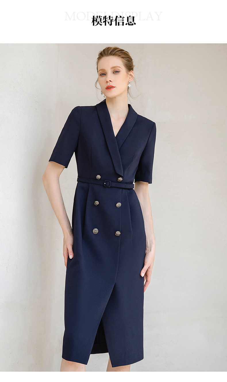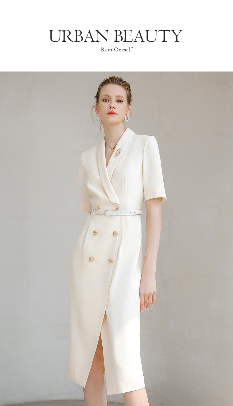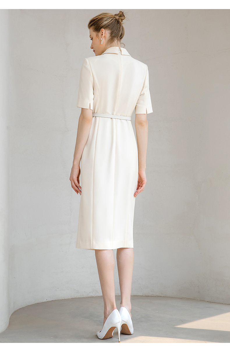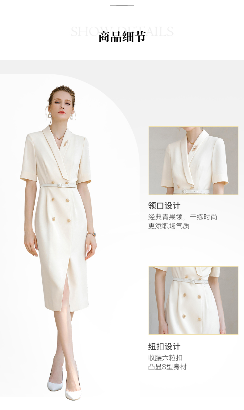 夏季高端时尚OL通勤高腰双排扣杏色连衣裙女主持人职业装西装裙
