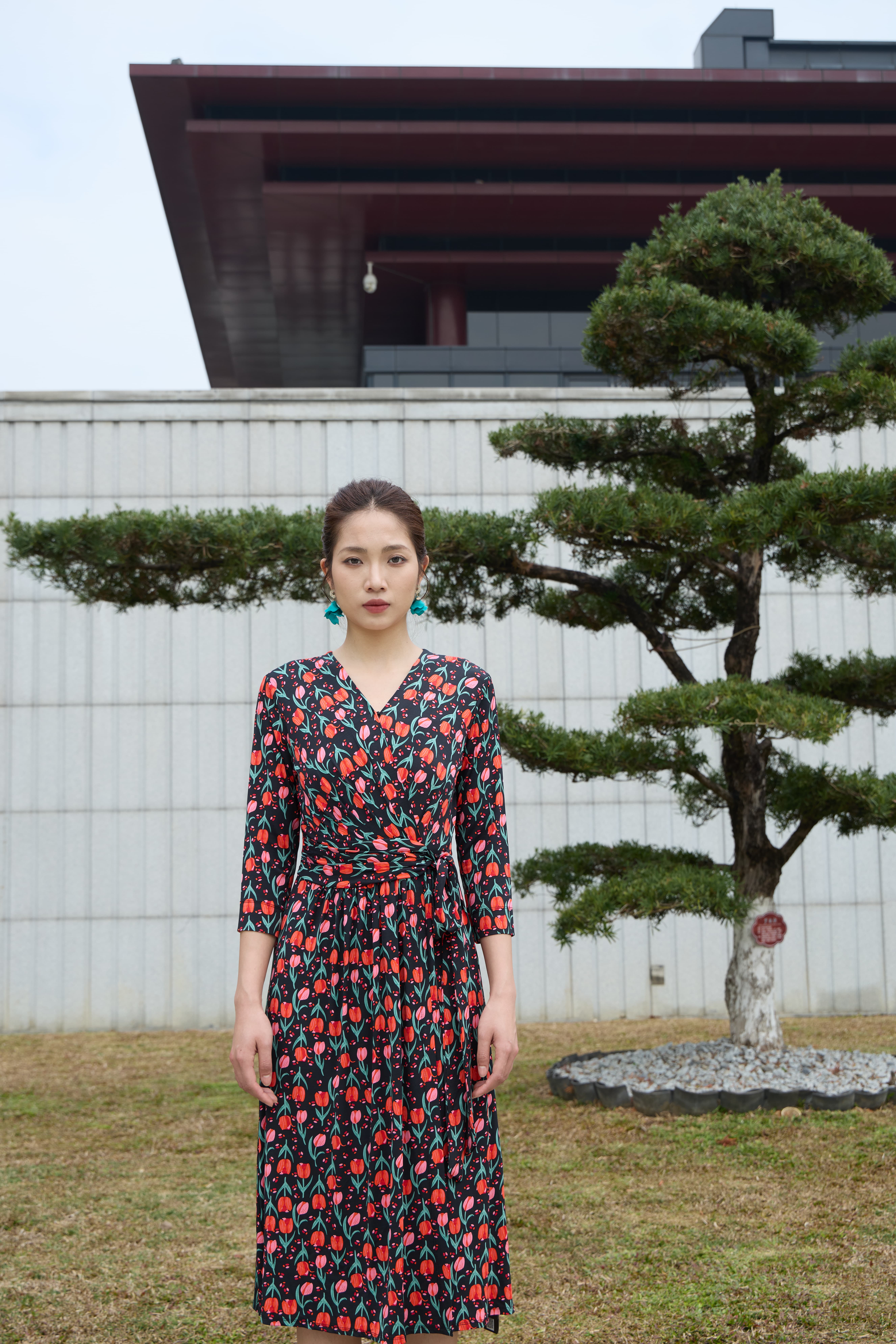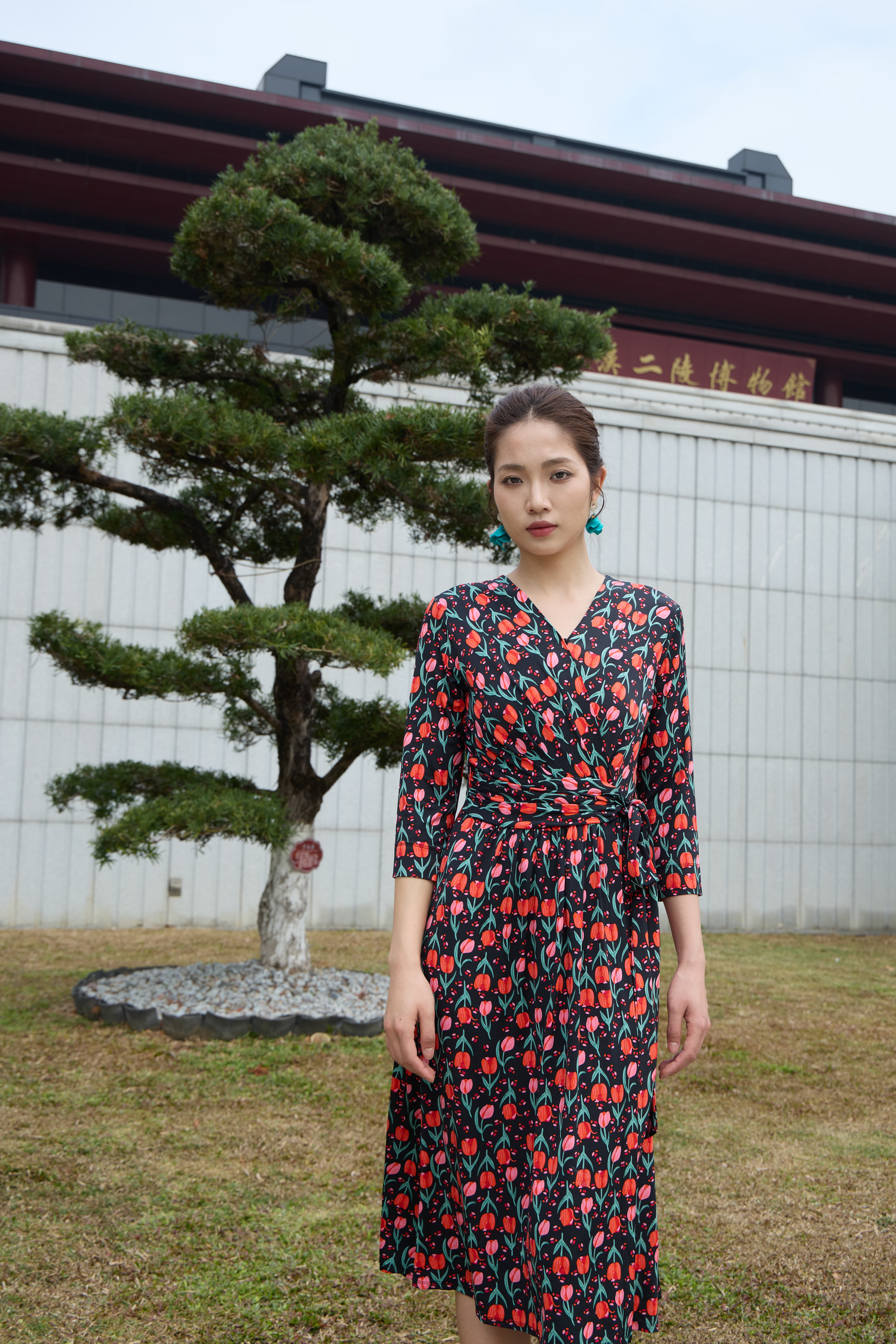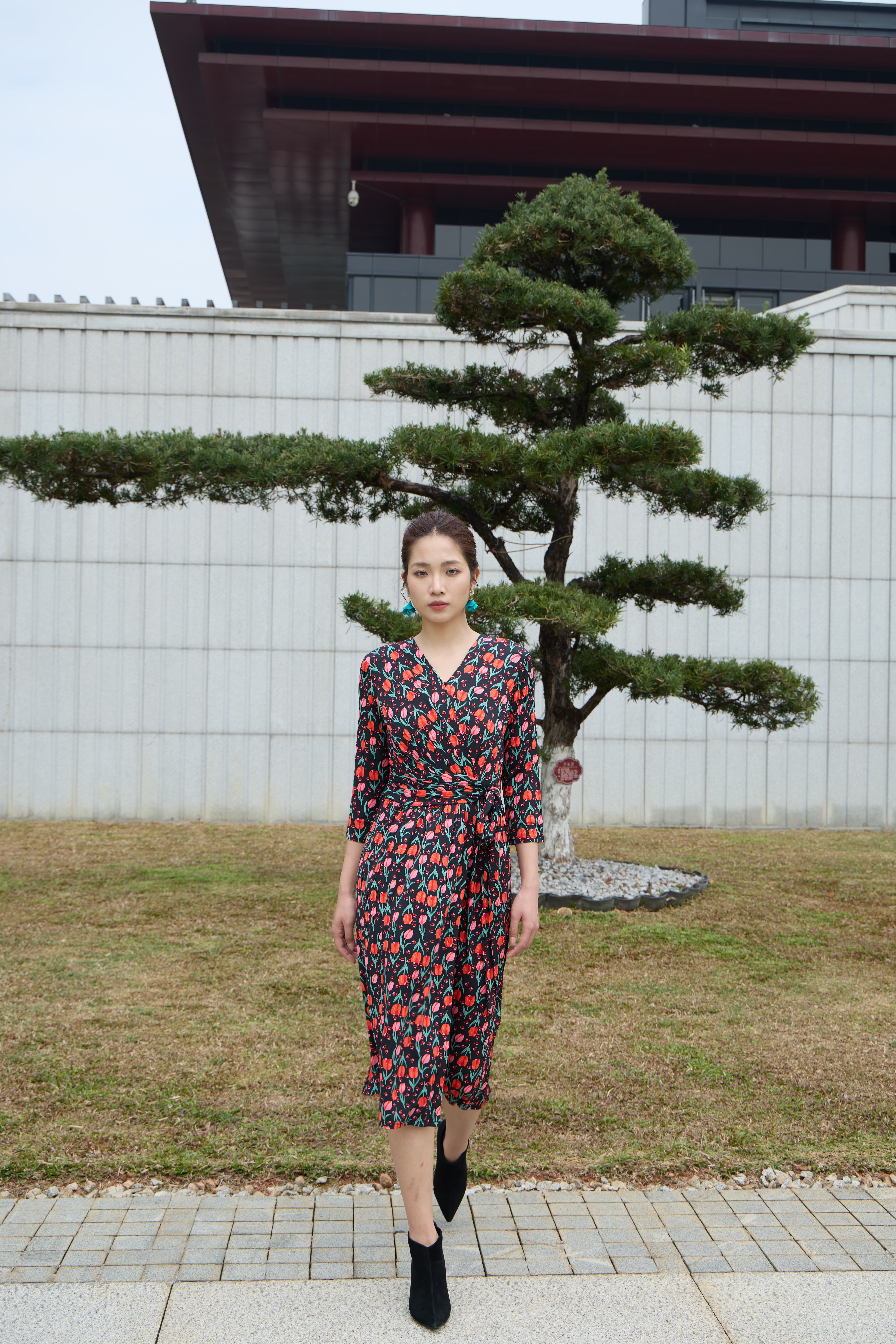 SZ1S55_胭脂色_连衣裙_春夏_V领七分袖系带收腰A字中长款_高级女装_BERNIEELEN 伯妮斯茵