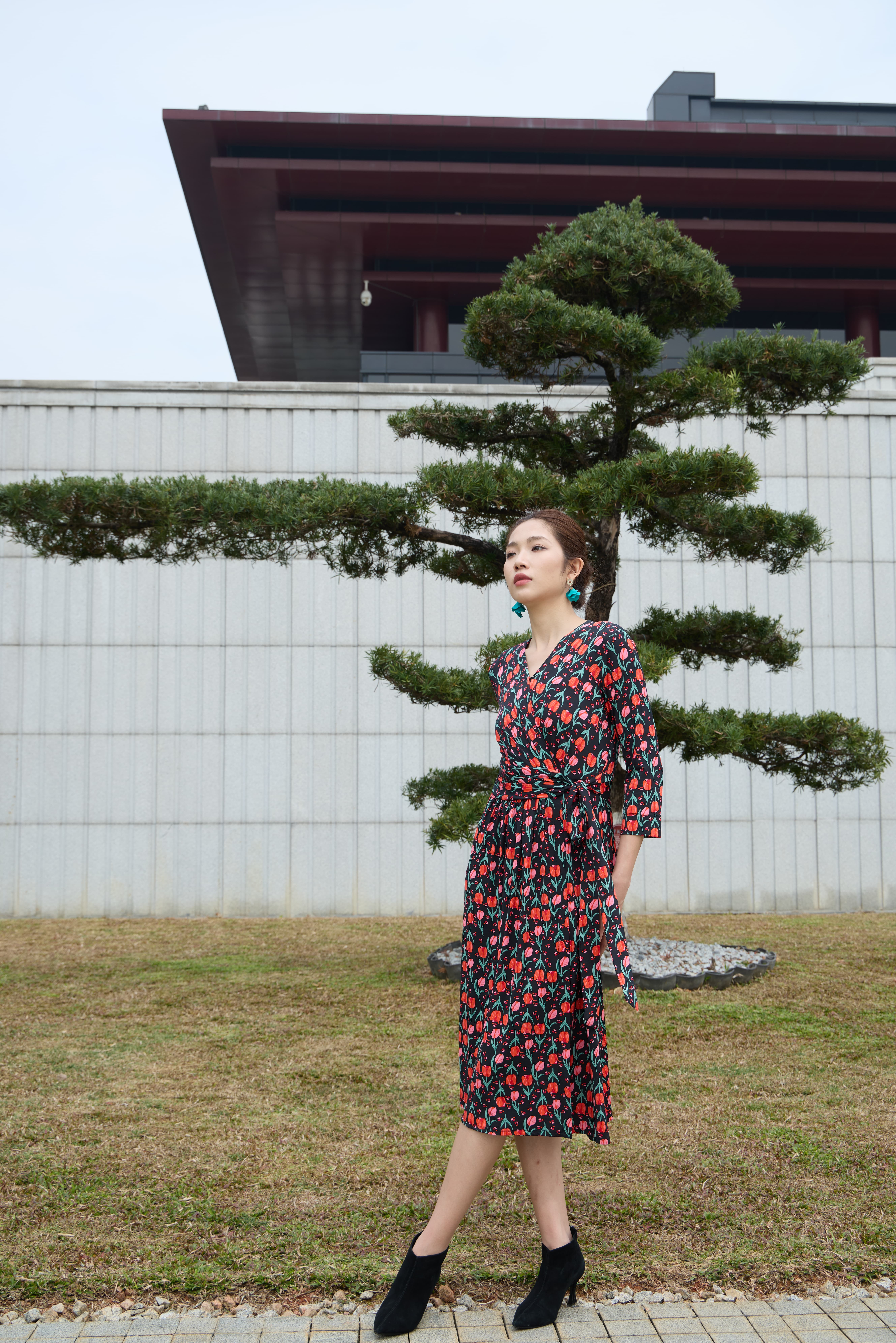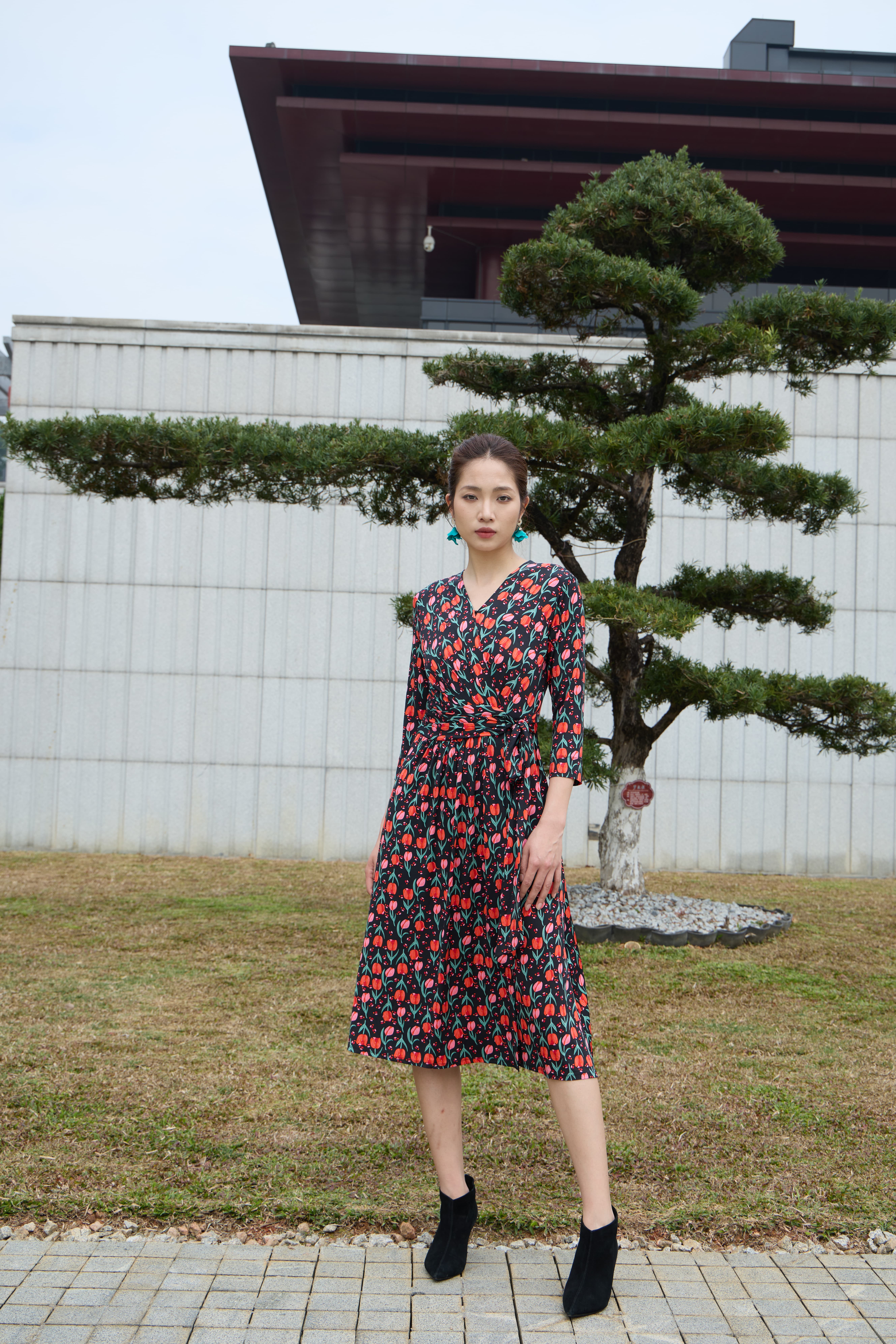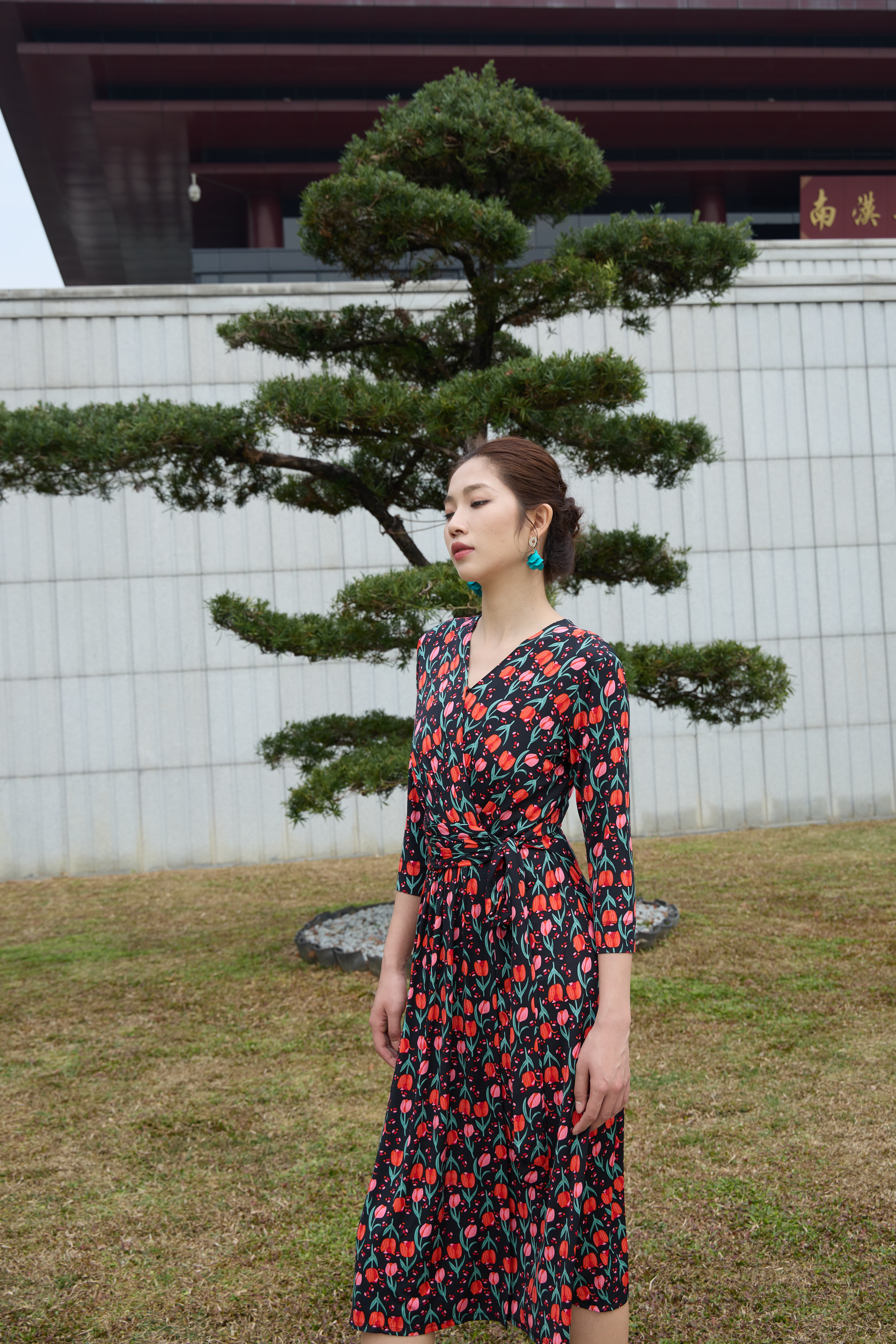 SZ1S55_胭脂色_连衣裙_春夏_V领七分袖系带收腰A字中长款_高级女装_BERNIEELEN 伯妮斯茵