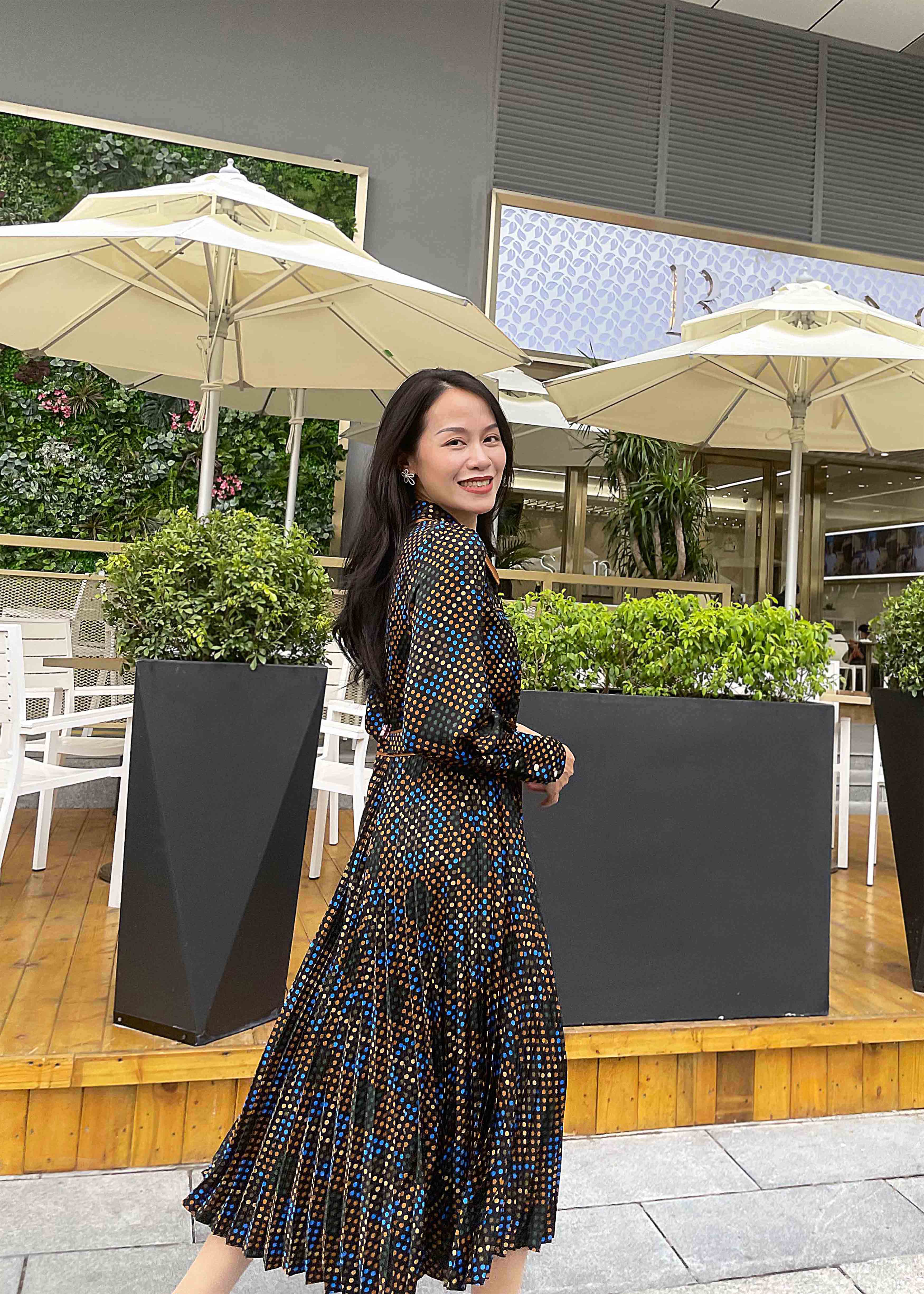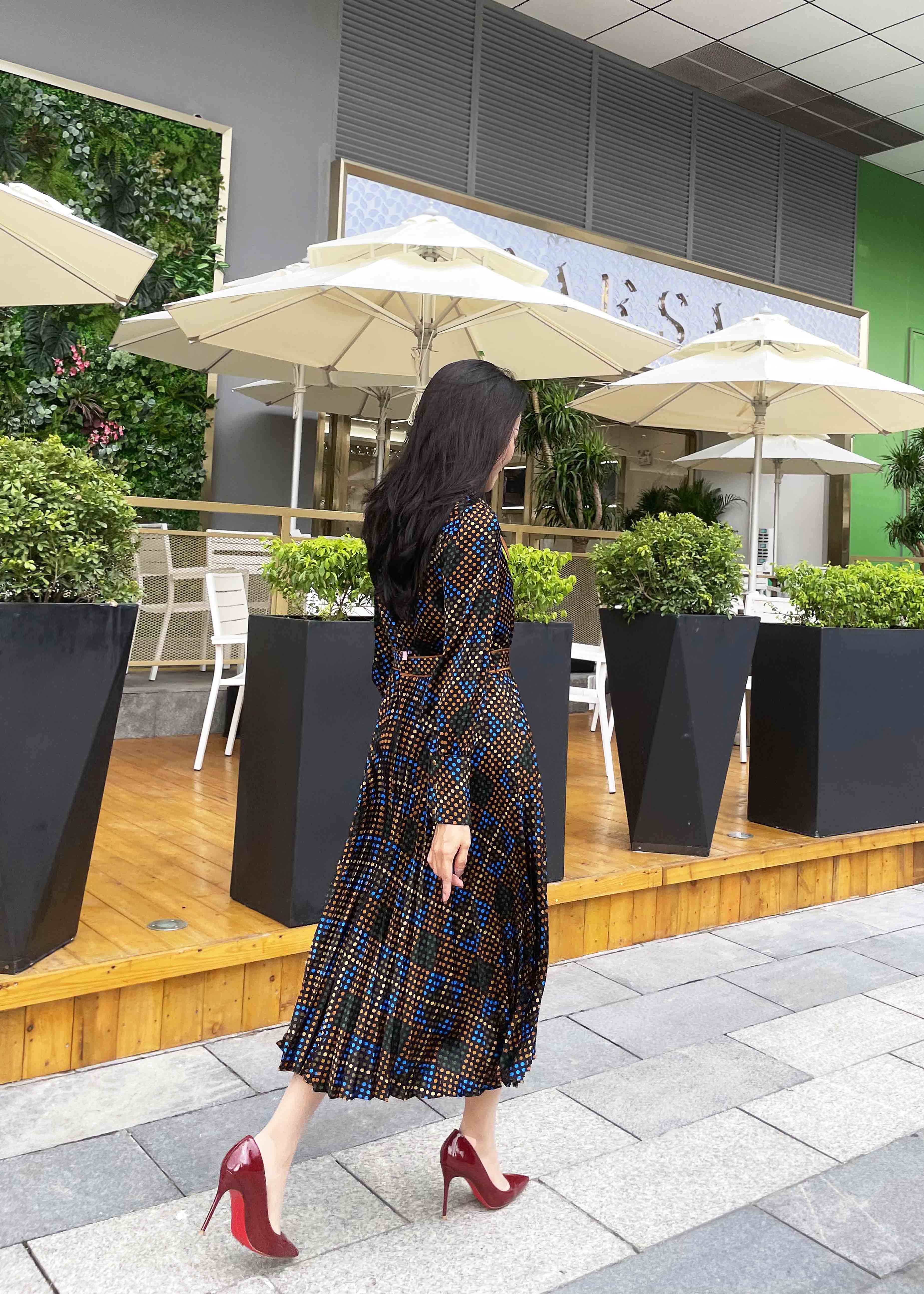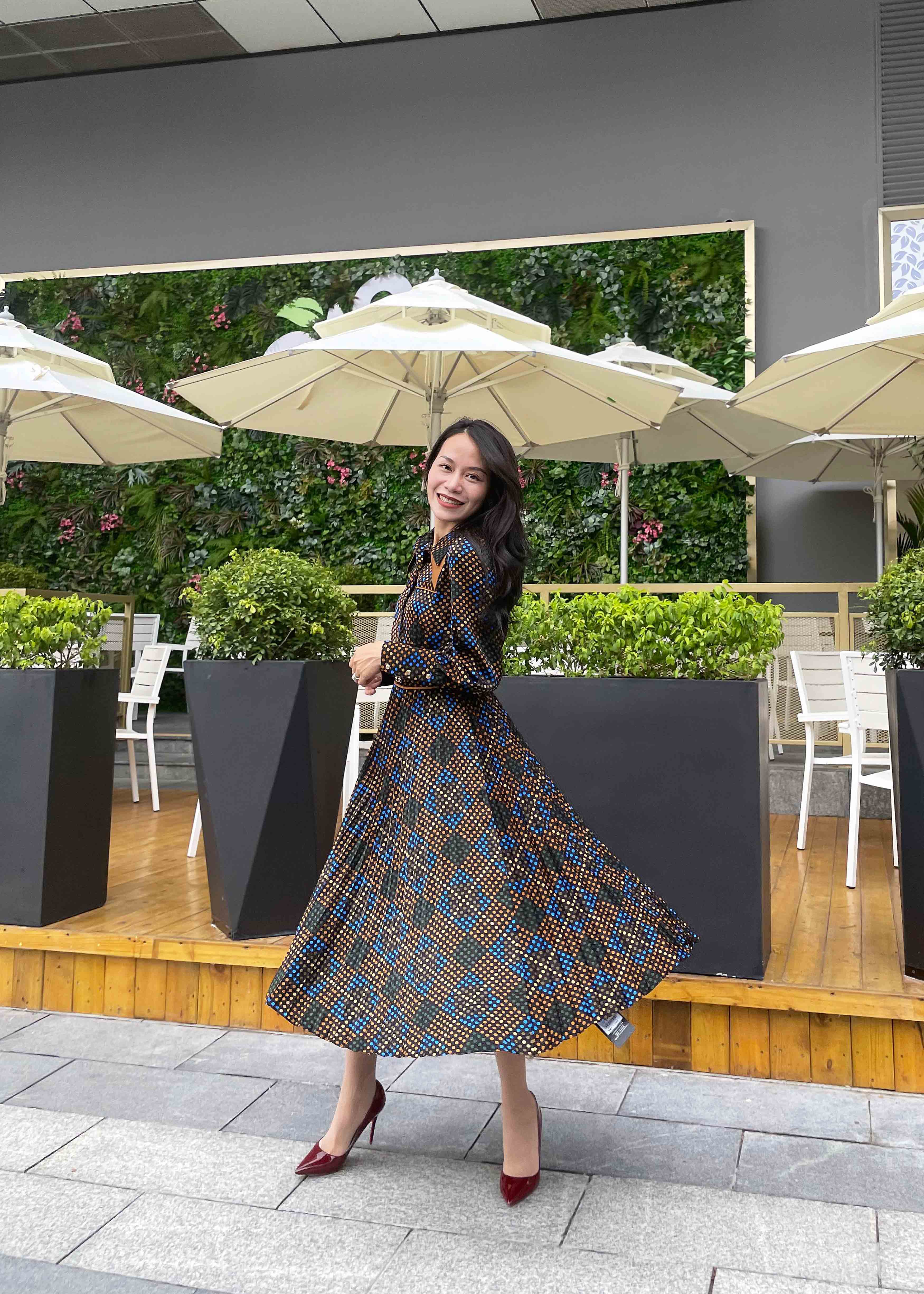 【伯妮斯茵】宝石蓝色斜纹格子宽松收腰衬衣款连衣裙 3S4552