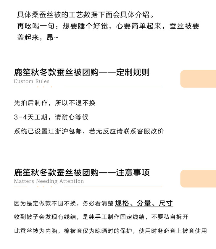 < 蚕丝被不便宜,且是定做款不退换,所以务必仔细认真看清下列介绍,尤其是斤数和尺寸,多花点时间不会错。>