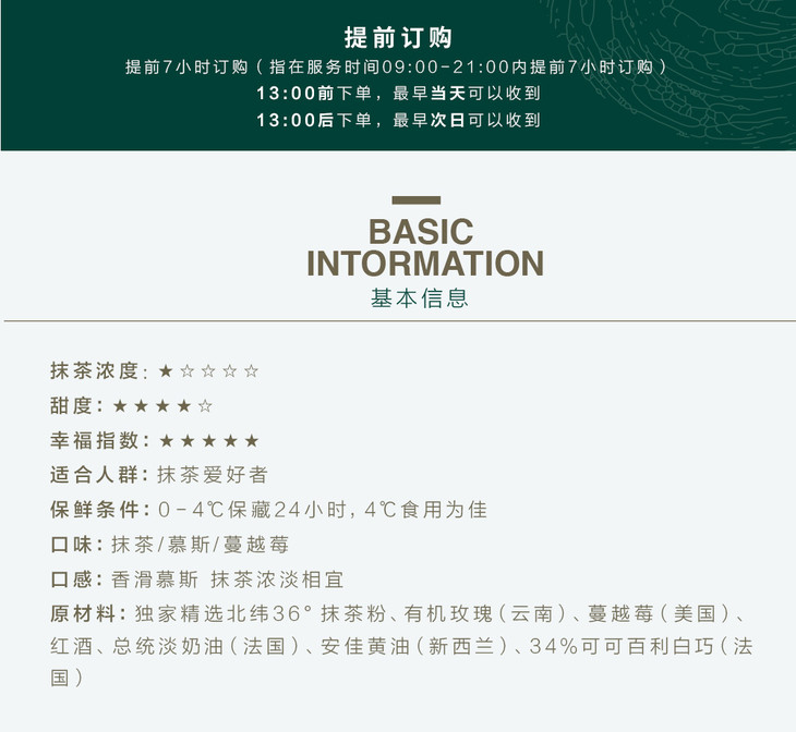 我们目前拥有36MATCHART和36cake两个品牌,主营抹茶甜品与新鲜蛋糕,深受数百万抹茶控和甜品控的拥趸。好吃安心,奶油只选法国铁塔。全城3小时免 费速达。客服热线400-016-3636