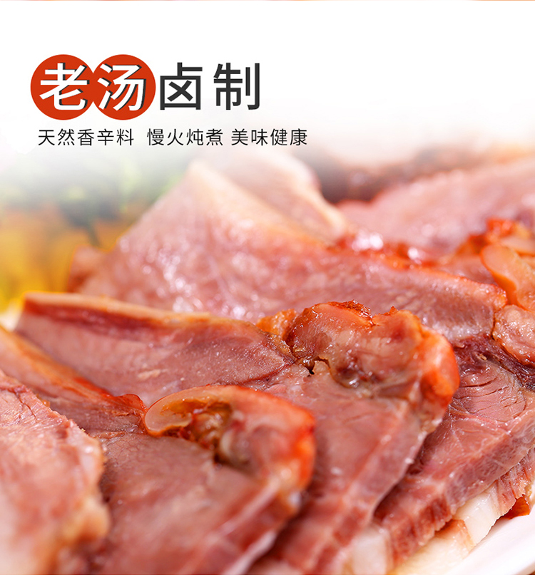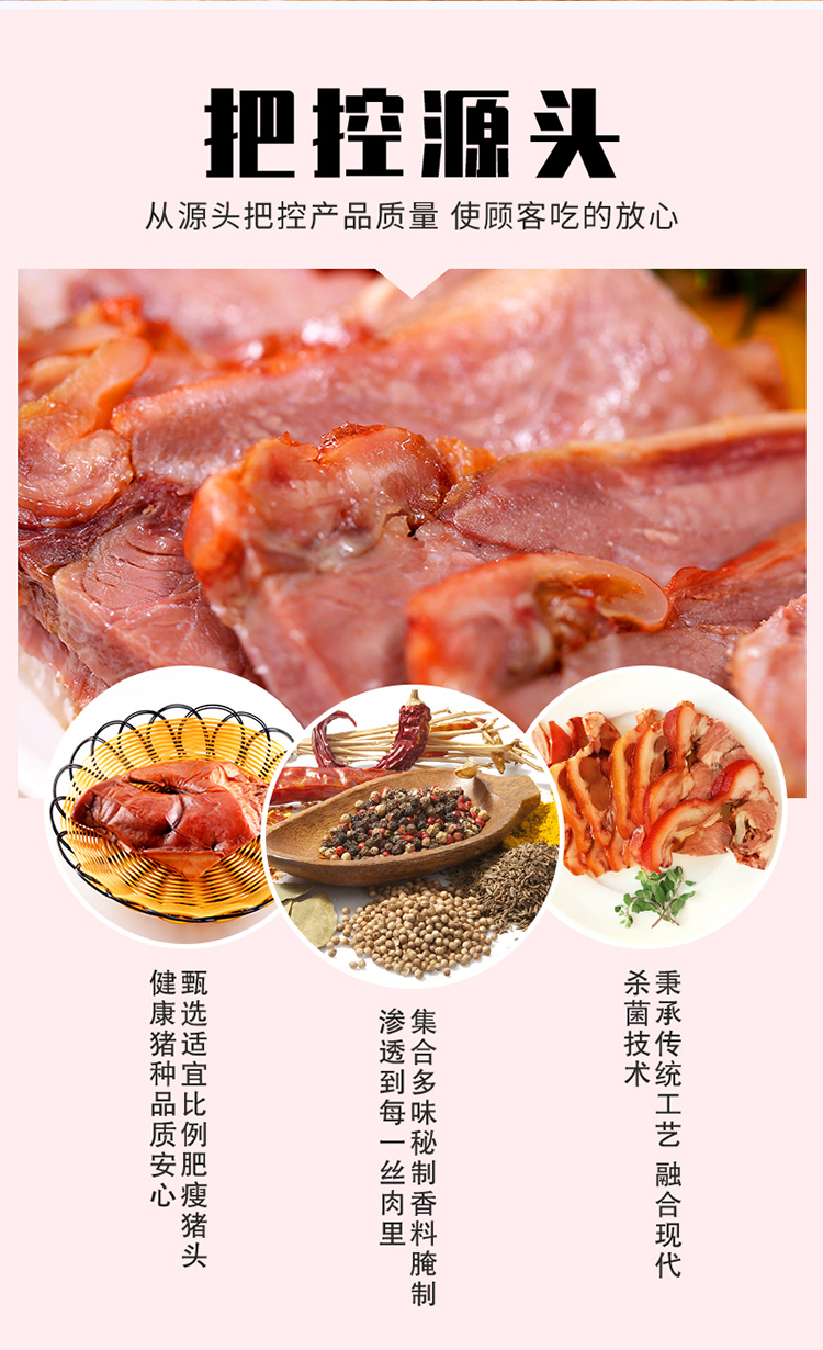 香卤猪头肉甄选自养自宰的猪头肉,搭配天然香辛料,进行12小时腌制,然后老汤卤制,老汤卤制非常讲究,大火脱脂1小时,两小时的慢炖入味,还要糟卤浸泡4小时,让我们的猪头肉美味又健康!色泽红润 香糯浓醇 肉质鲜美 肥而不腻,猪皮Q弹。