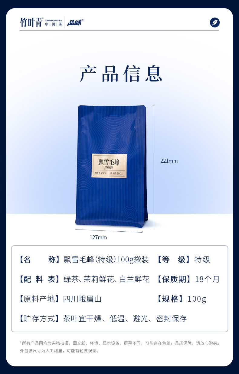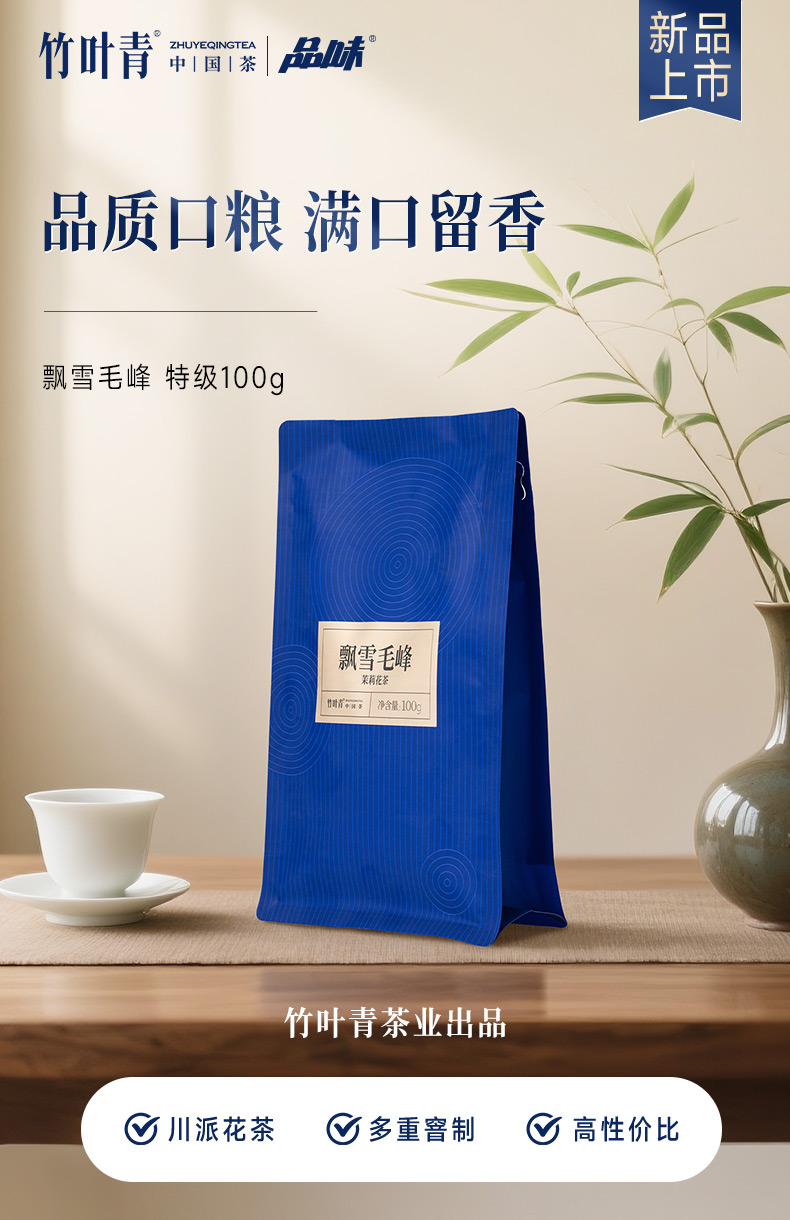 品味牌飘雪毛峰茉莉花茶特级茶叶袋装100g四川竹叶青茶业出品