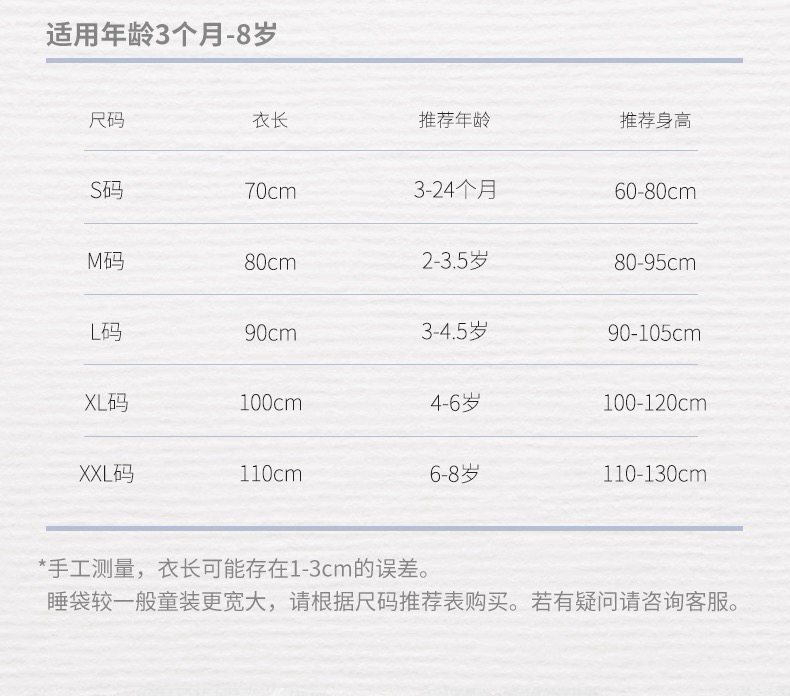 分两个厚度,中厚和加厚,我反而觉得北方有供暖的家里用中厚就够了,南方没有暖气的冬天,加厚用起。码数偏大偏宽松,建议大家按照宝宝实际身高选。