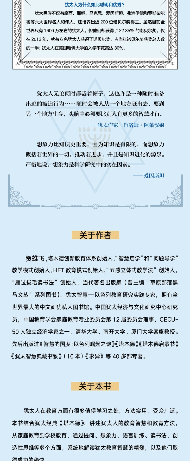 贺雄飞,塔木德创新教育体系创始人,“智慧启学”和“问题导学”教学模式创始人,HET教育模式创始人,“五感立体式教学法”创始人,“雁过拔毛读书法”创始人,当代出版家(曾主编“草原部落黑马文丛”系列图书),犹太智慧—以色列教育研究实践专家,拥有全世界很大的中文研犹私人图书馆。中国犹太经济与文化研究中心研究员,中国教育学会家庭教育专业委员会2届委员会理事,CECU-50人独立经济学家之一,清华大学、南开大学、厦门大学客座教授。先后出版过《智慧的国度:以色列崛起之谜》《塔木德》《塔木德启蒙书》《犹太智慧典藏书系》(10本)《求异》等40 多部专著。