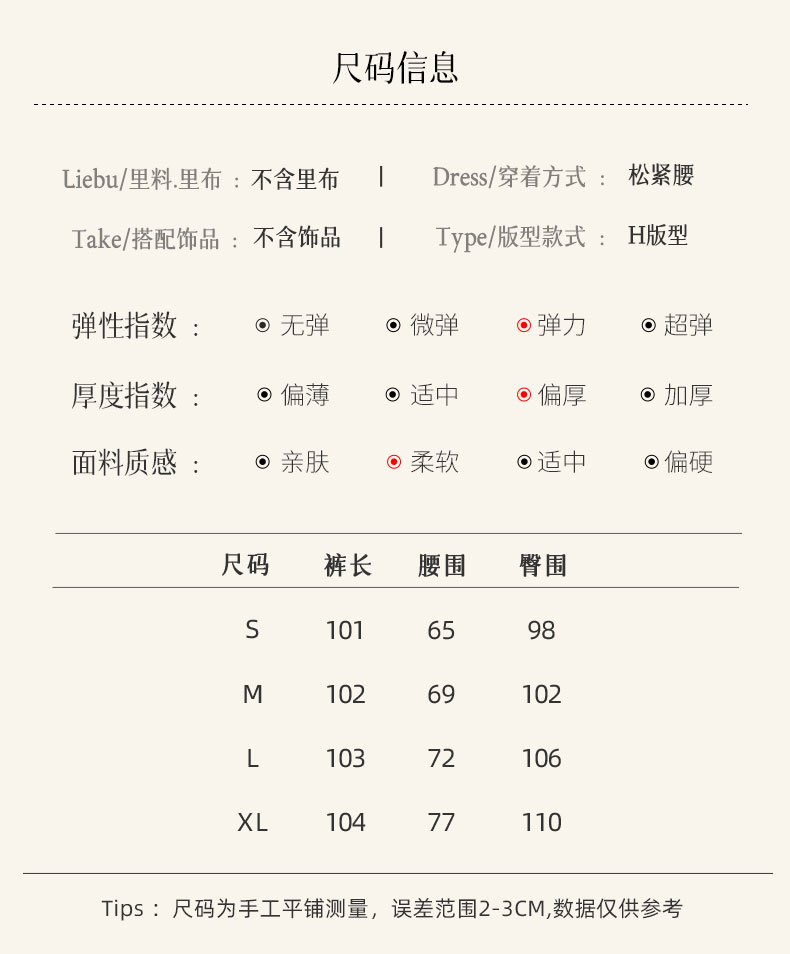 2.脚口设计:阔腿脚口,适合各种腿型,实穿性颇高。简单大方的宽松阔腿版型,穿上巨显瘦显腿直,宽松裤腿修饰能力MAX,上身秒变大长腿。