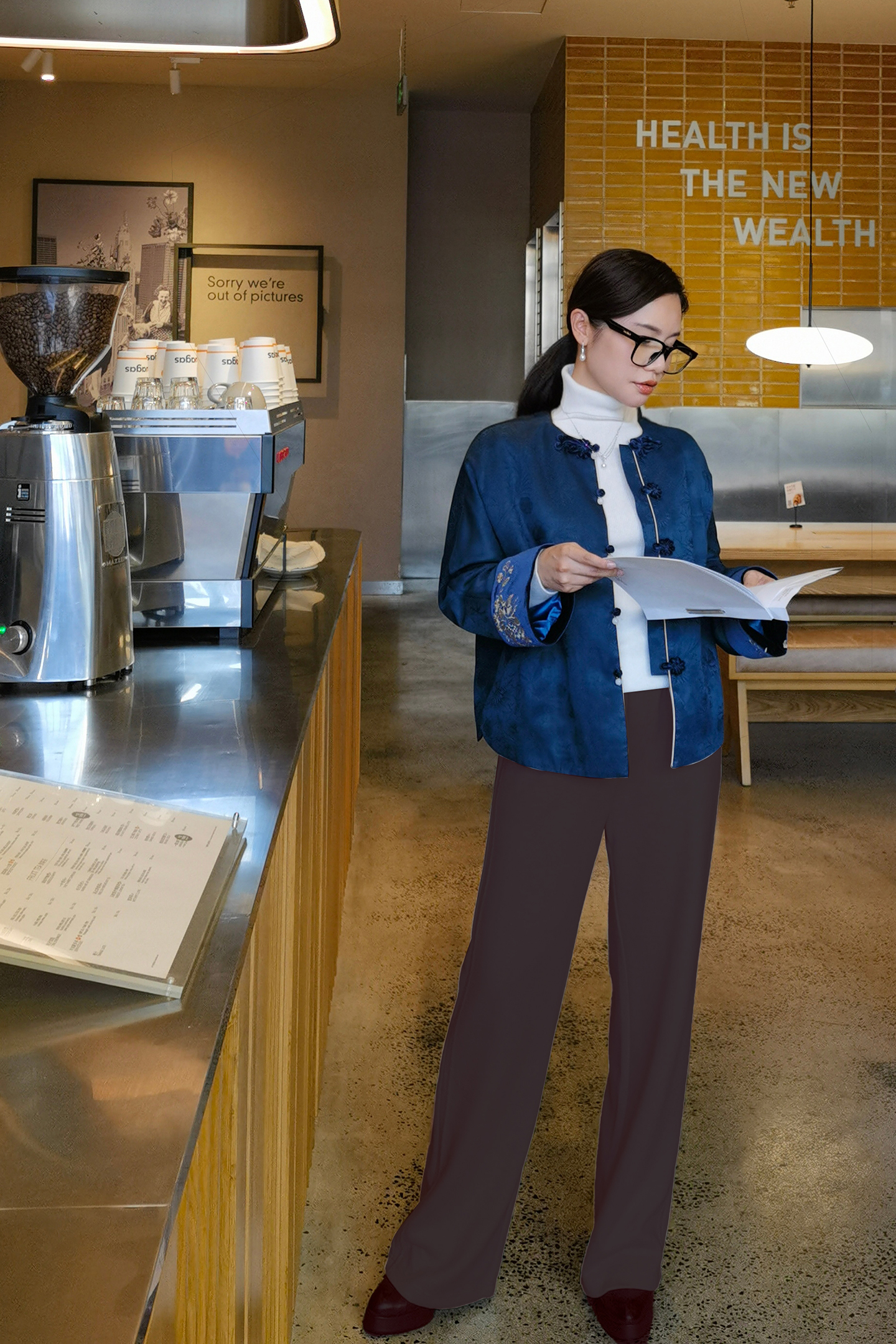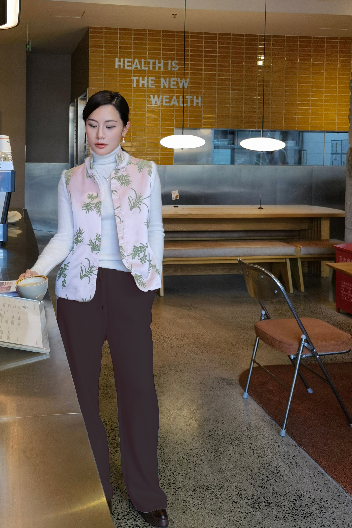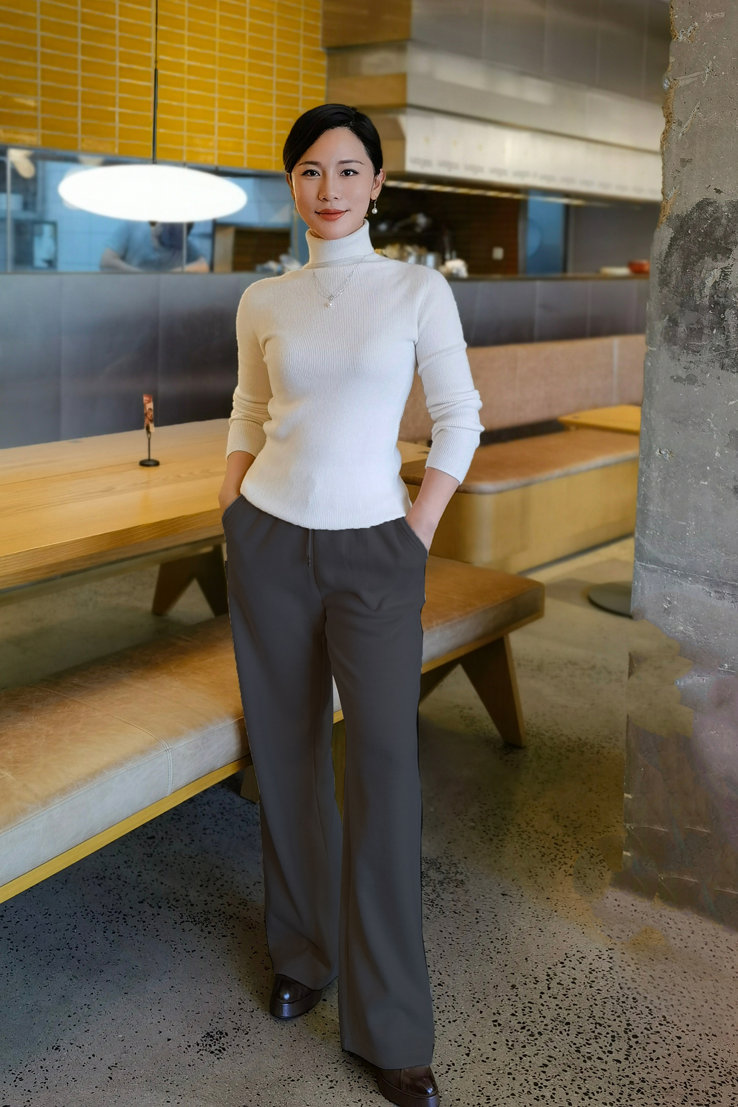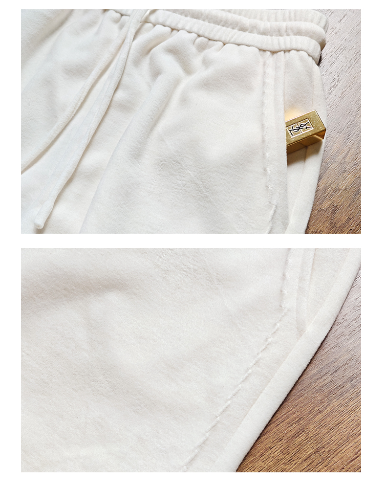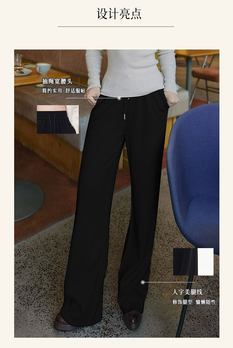 3.整体设计:人字美腿线,版型宽松阔脚,从视觉上拉长腿部,定制面料超保暖,版型显瘦显高,慵懒随性。