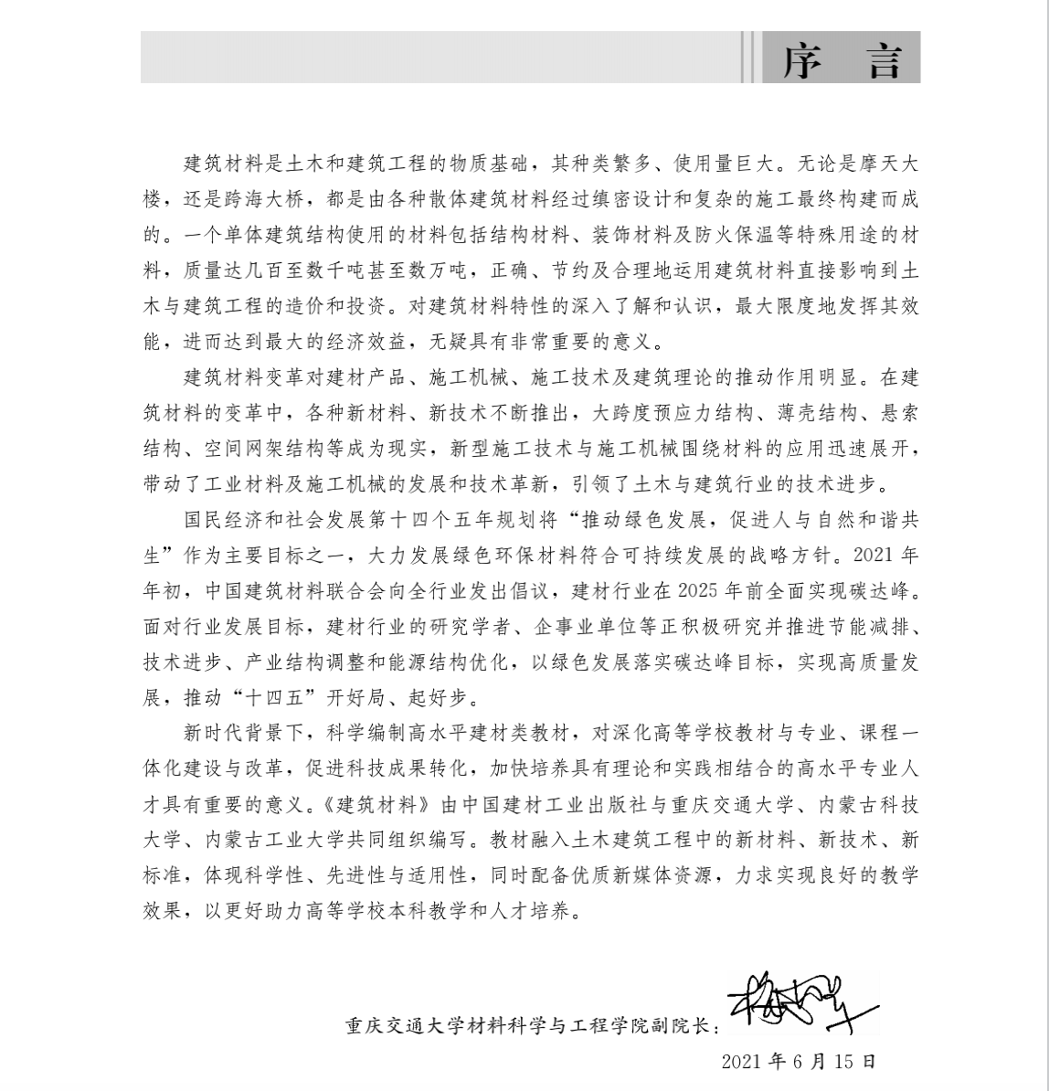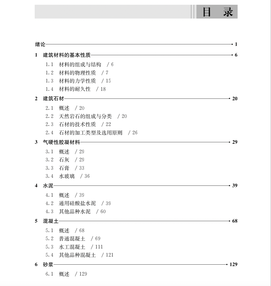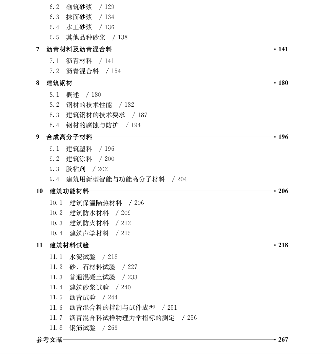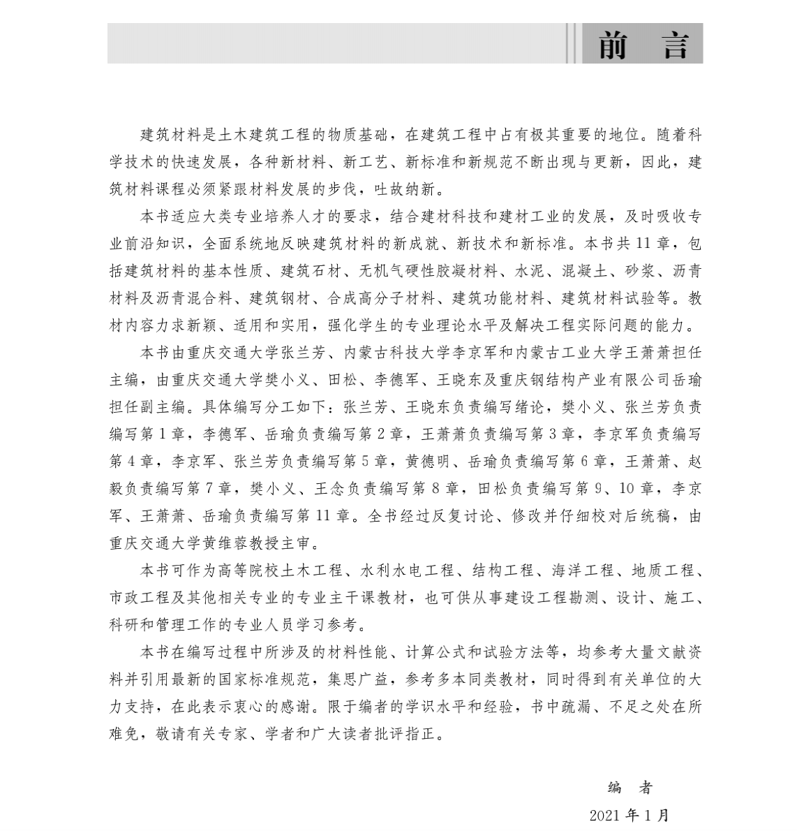 本书适应大类专业培养人才的要求,结合建材科技和建材工业的发展,及时吸收专业前沿知识, 全面系统地反映建筑材料的新成就、新技术和新标准。 本书共11章,包括建筑材料的基本性质、建筑石材、无机气硬性胶凝材料、水泥、混凝土、砂 浆、沥青材料及沥青混合料、建筑钢材、合成高分子材料、建筑功能材料、建筑材料试验等。教材内容力求新颖、适用和实用,强化学生的专业理论水平及解决工程实际问题的能力。 本书可作为高等院校土木工程、水利水电工程、结构工程、海洋工程、地质工程、市政工程及其 他相关专业的专业主干课教材,也可供从事建设工程勘测、设计、施工、科研和管理工作的专业人员 学习参考。