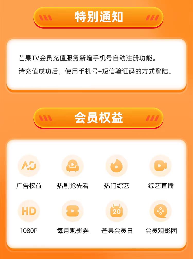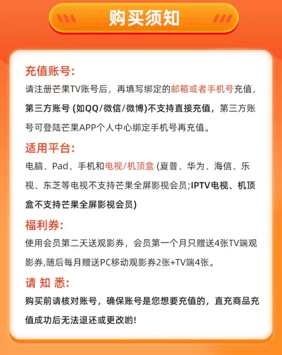 | 购买须知: ★ 下单前请您务必仔细阅读产品中各项说明,然后在下单订购 ★ 下单购买后,则视为您已仔细阅读本产品中的各项说明,并认同此声明以及产品规则,否则责任自负,不在售后服务之内 产品说明: 支持端口:手机、Pad、电脑、电视【乐视、夏普、海信等牌子的电视不支持使用芒果全屏影视会员,购买前请自行确认是否支持使用会员,不同意此协议请不要购买】 充值账号:请填写芒果TV登录绑定的手机号,不支持在备注填写充值号码,仅支持下单默认的充值手机号,请不要填错 充值时间:本产品为快速直充,下单后3-30分钟左右到账 购买限制:每笔订单限购1单,多次购买请分开下单 到账核实:下单后30分钟未到账,请先登录自己的账号查看,退出重新登录查看,如确实未到账,请及时联系客服 开票说明:本产品价格不包含发票,如需发票请联系客服咨询具体情况 注意事项: 顾客下单后自动充值,发货状态并不会立刻变成已发货,已经充值成功无法退换 虚拟充值产品不适用于七日无理由退货条款,一经购买,不退不改 因个人原因造成充值错误,责任自负,不予退款 如遇市场断货问题,平台将无条件为客户进行退 |