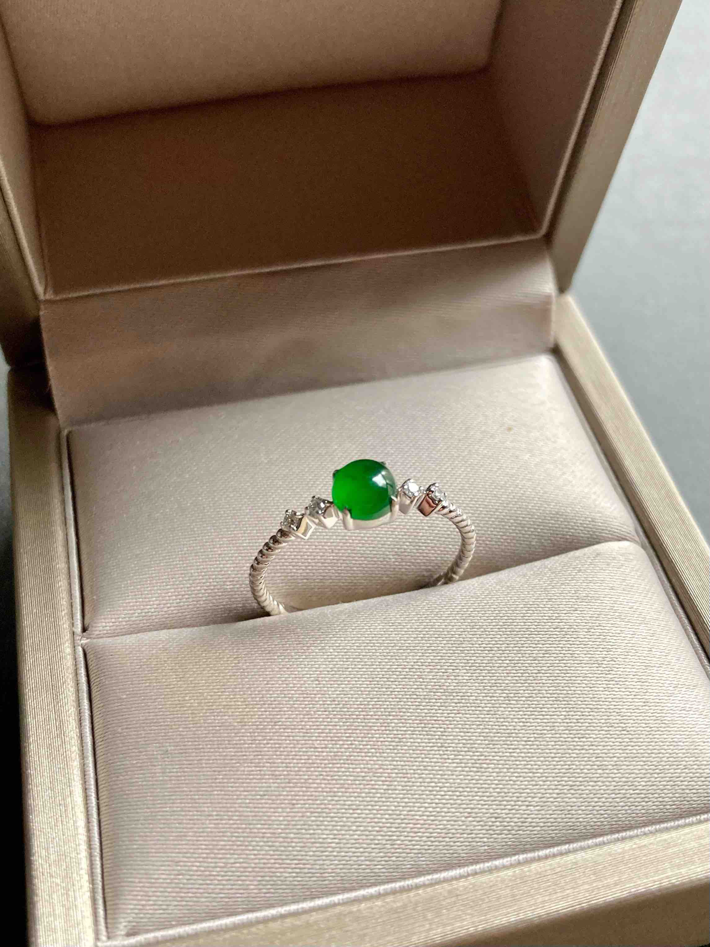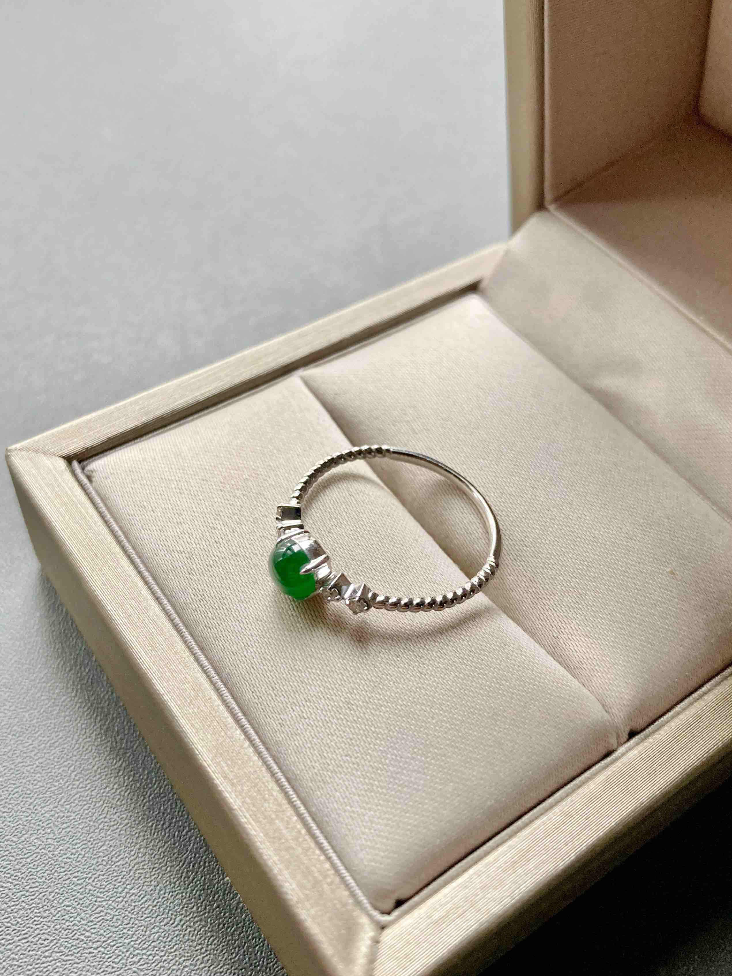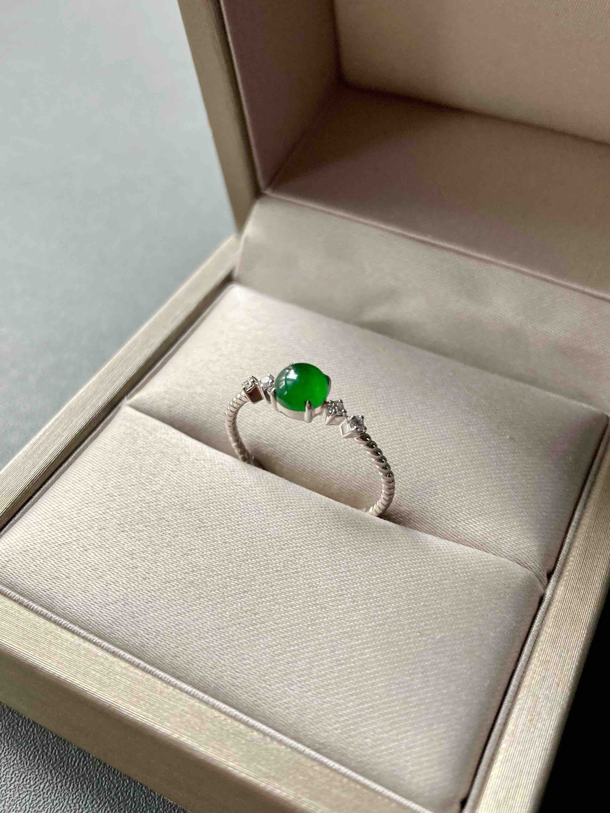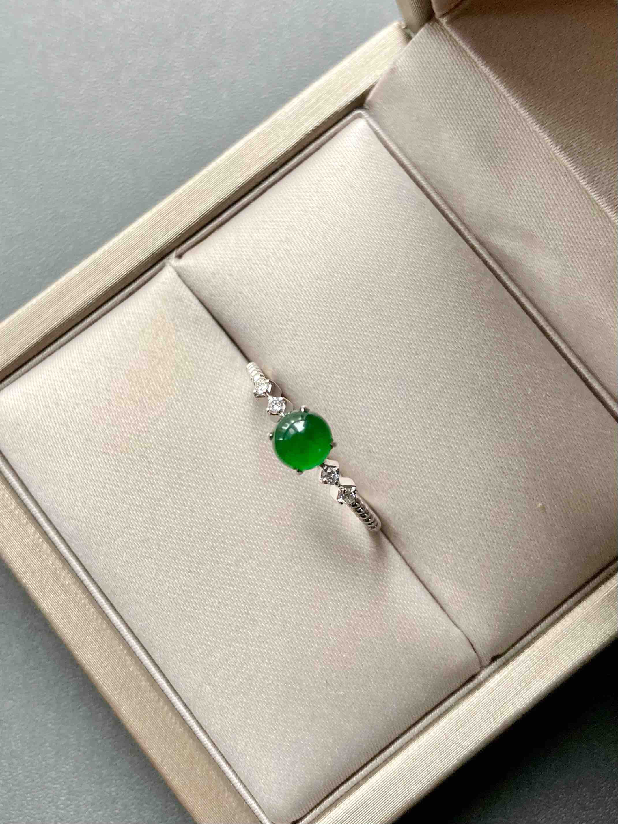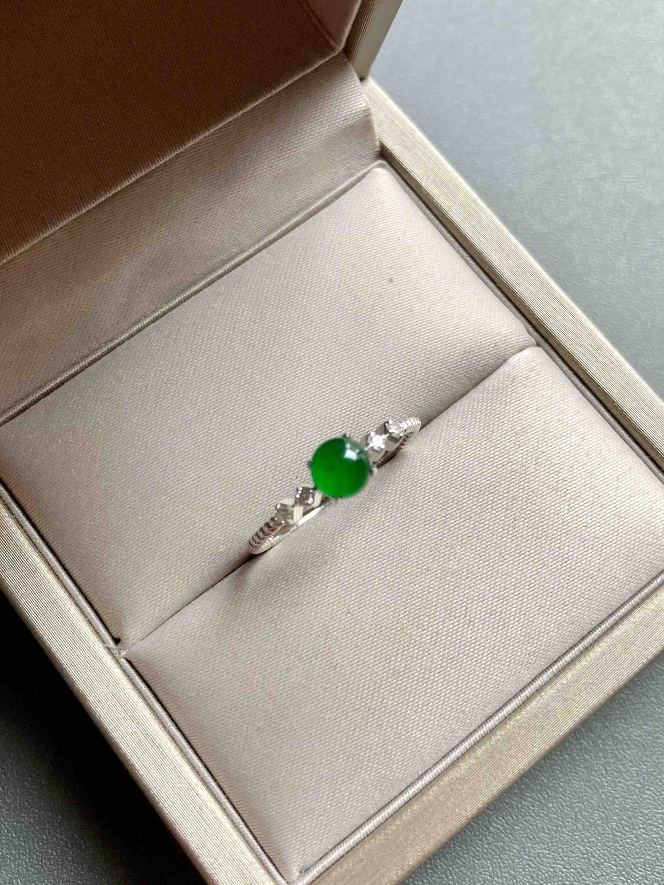 只要小四价位,对标老坑帝王绿的小戒指,阳绿贵气,种水荧光四射,品质惊艳,18k白金钻石镶嵌,稍微大点都是五位数以上的,我们这个性价比绝了,只有一个,拼手速,蛋面5.1×5.1×2.2mm,圈号13可改大小