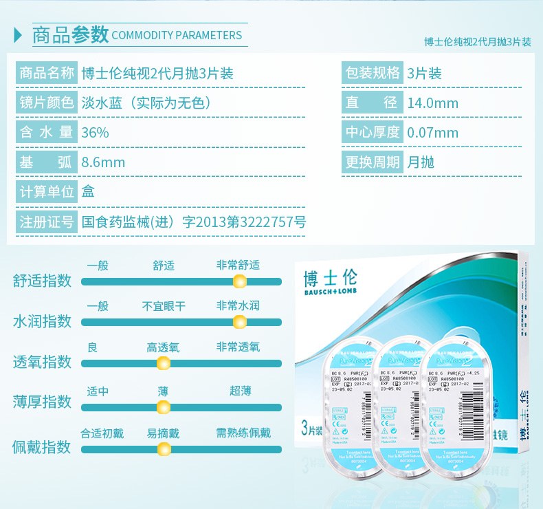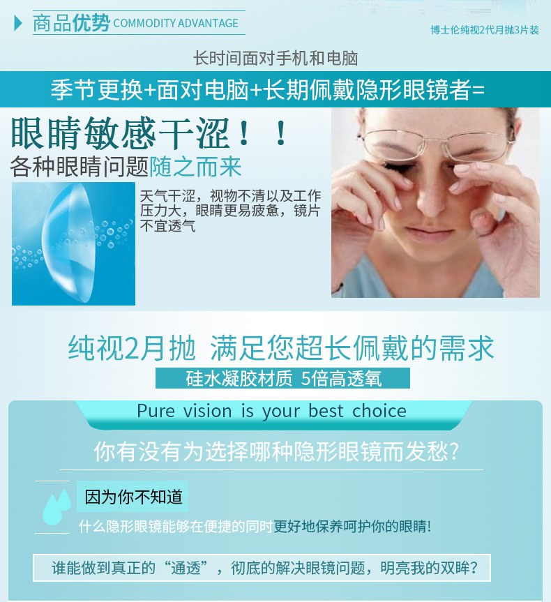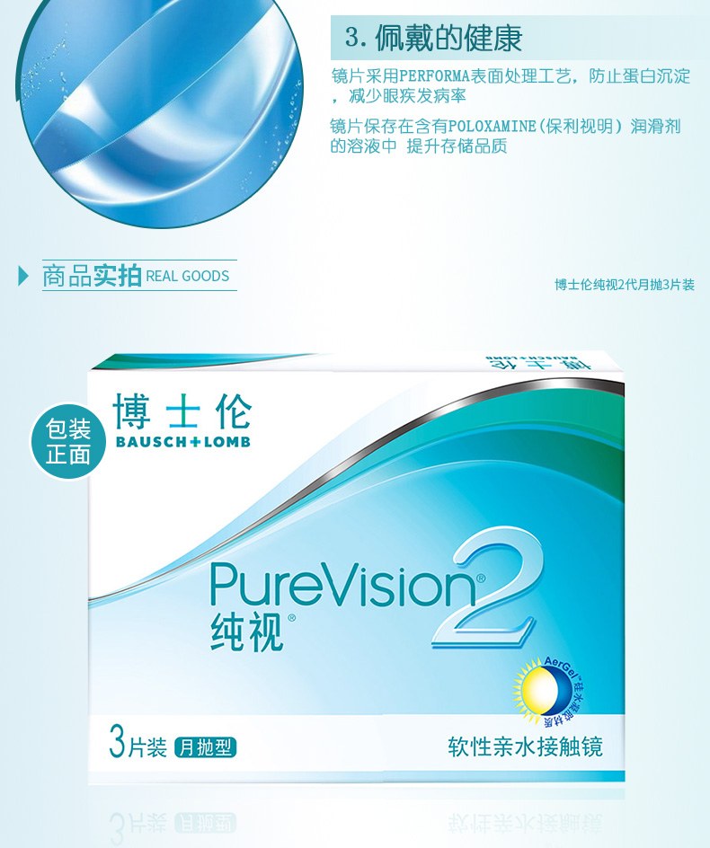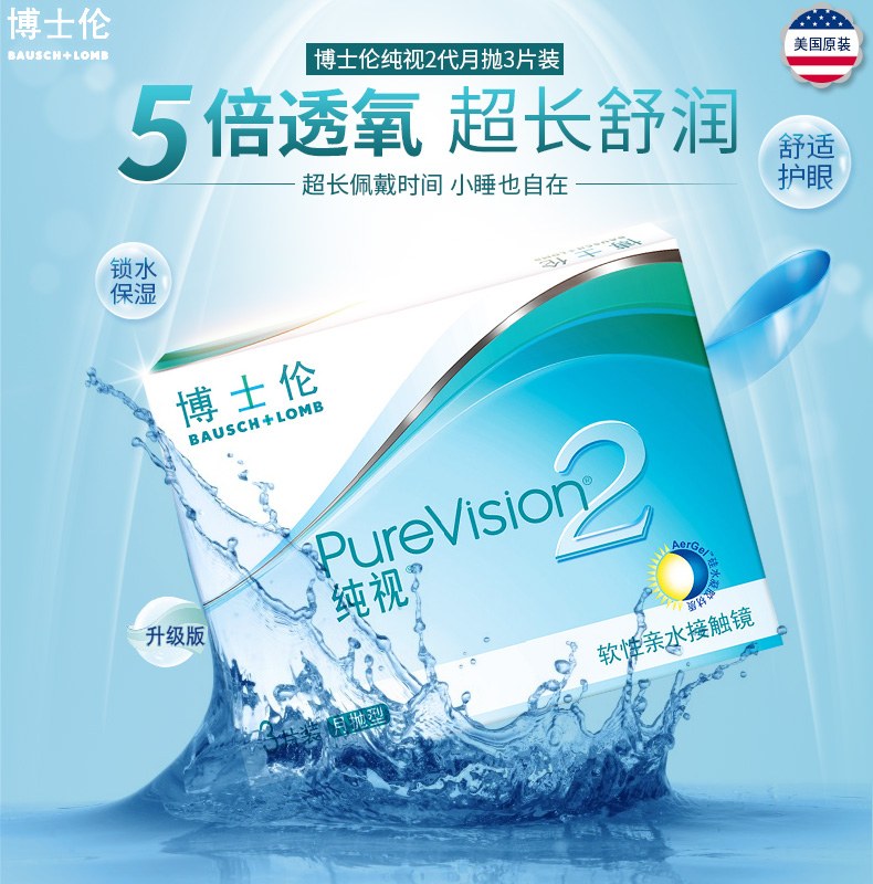 博士伦最新推出了 纯视超长配戴月抛隐形眼镜,纯视采用创新的硅水凝胶材料,在国外,这种材料的隐形眼镜已经非常普及,在隐形眼镜市场占有率第一的美国市场,硅水凝胶镜片占有率已经达到了近40%,中国硅水凝胶材料的隐形眼镜正在逐渐被消费者认可。采用创新的硅水凝胶材料制作的镜片具有高透氧,是一般隐形眼镜透氧的5倍,具有锁水保湿功能,即便睡觉时也能保证角膜充分供氧,同时优良的PERFORMA镜片表面防污技术,防止蛋白沉淀,减少眼干,让配戴者“超长随意戴,小睡也自在”。镜片的特别设计保证镜片的滑动度和戴镜时的泪液交换,令配戴非常舒适。