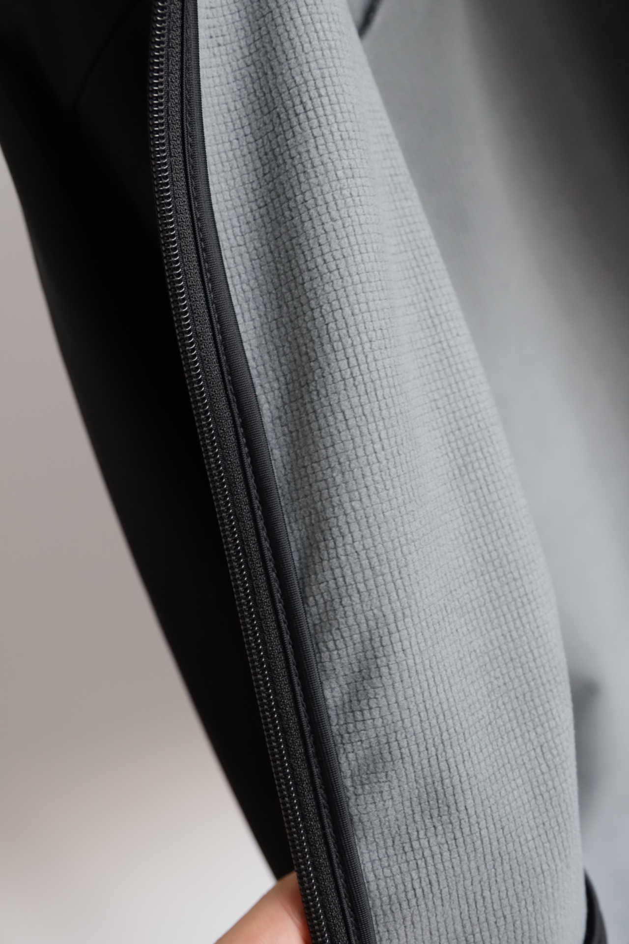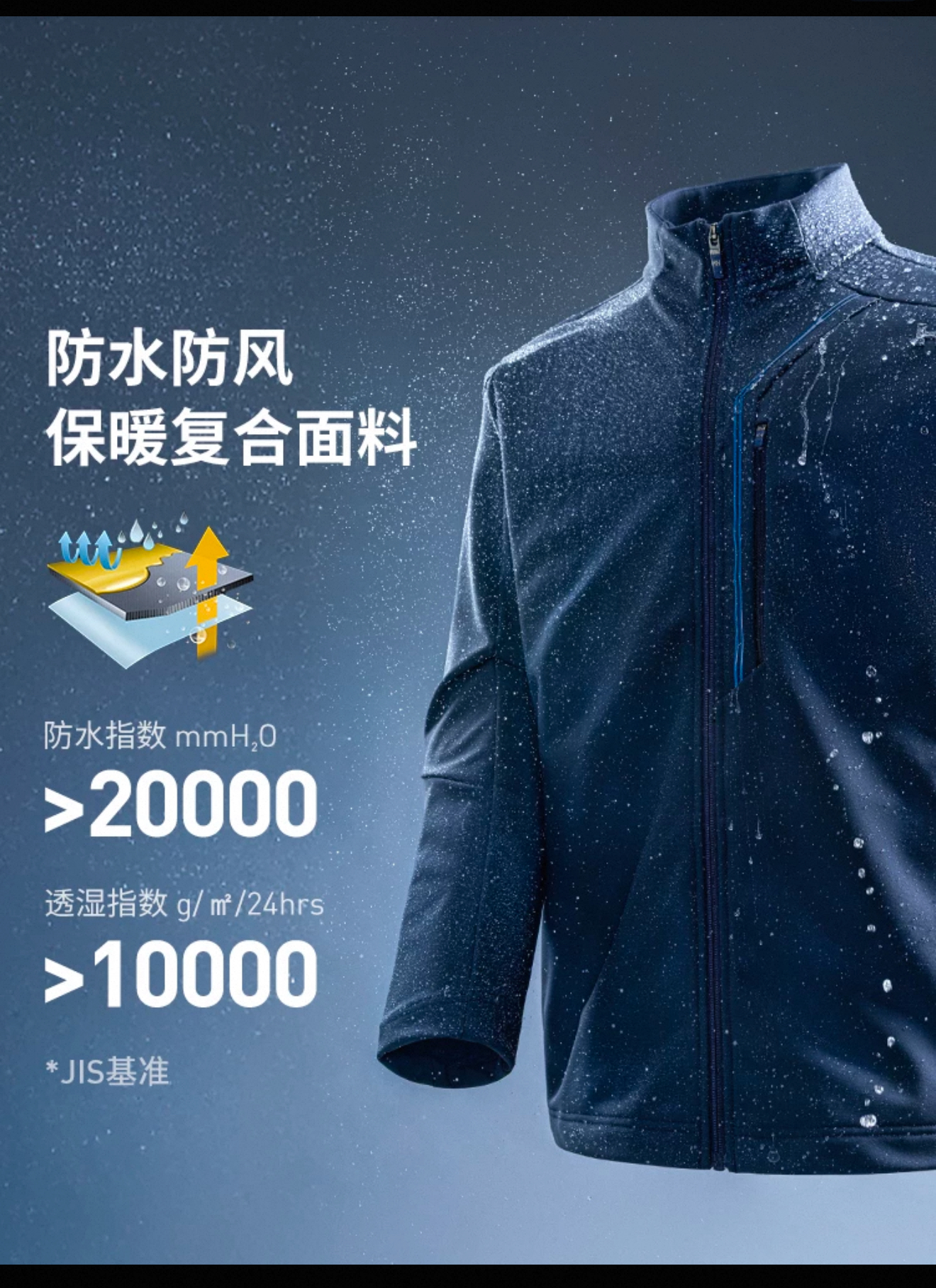 面料手感柔软,具有防泼,防风,防刮耐磨的特性,华夫格拉绒内里,功能性抓绒内里立体格纹锁温又排湿,双向调温