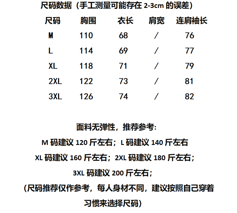 体重推荐仅供参考,具体请以体型以及穿衣习惯酌情选择,喜欢宽松或者卡码拍大
