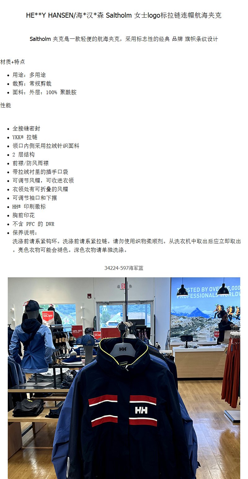 HE**Y HANSEN/海*汉*森 Saltholm 女士logo标拉链连帽航海夹克