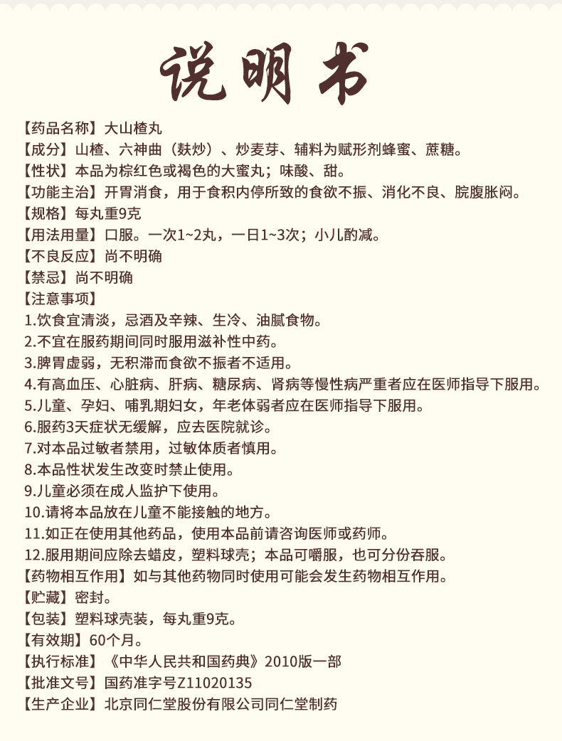 北京同仁堂 大山楂丸 10丸 开胃健胃消食 消化不良 腹胀积食