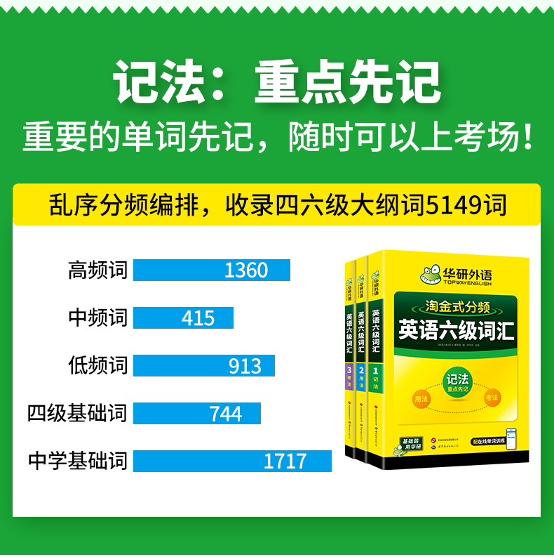 (1)记法:乱序分频编排,重要的单词先记,提高备考效率,随时可以上考场;